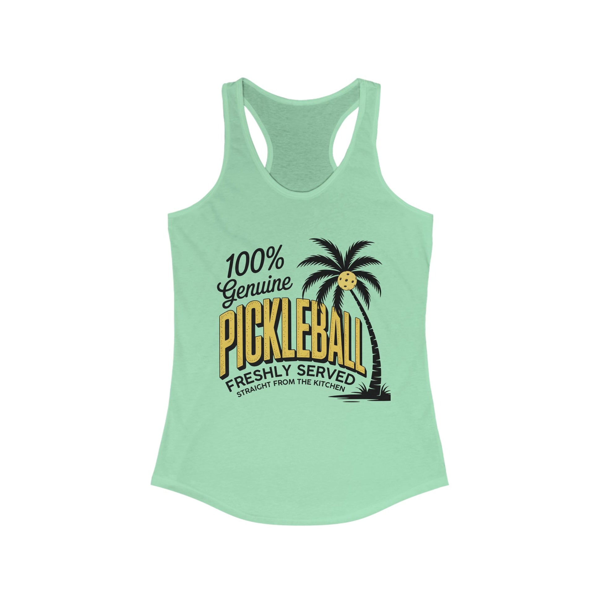 We're serving up 100% genuine pickleball, straight from the kitchen. This women's racerback pickleball tank celebrates the game you love with a design perfect for summer play.