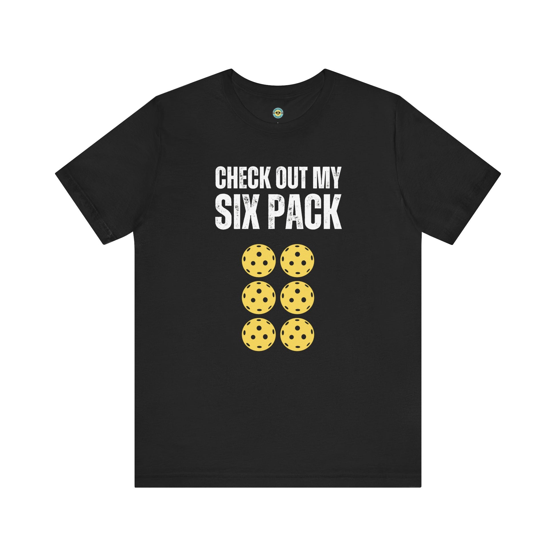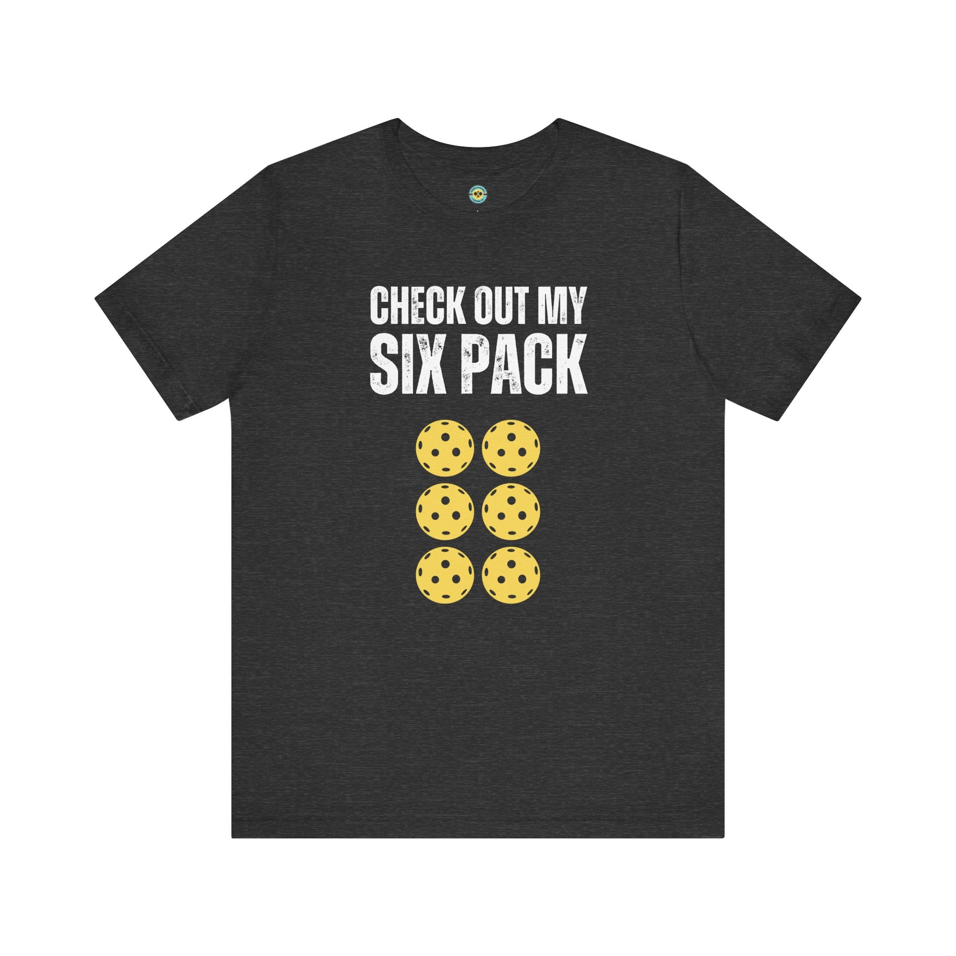 Flex your muscles and your pickleball skills with the "Check Out My Six Pack" 100% cotton pickleball t-shirt. With six pickleballs stacked front and center, this tee is perfect for bringing humor and game-day confidence to every match.