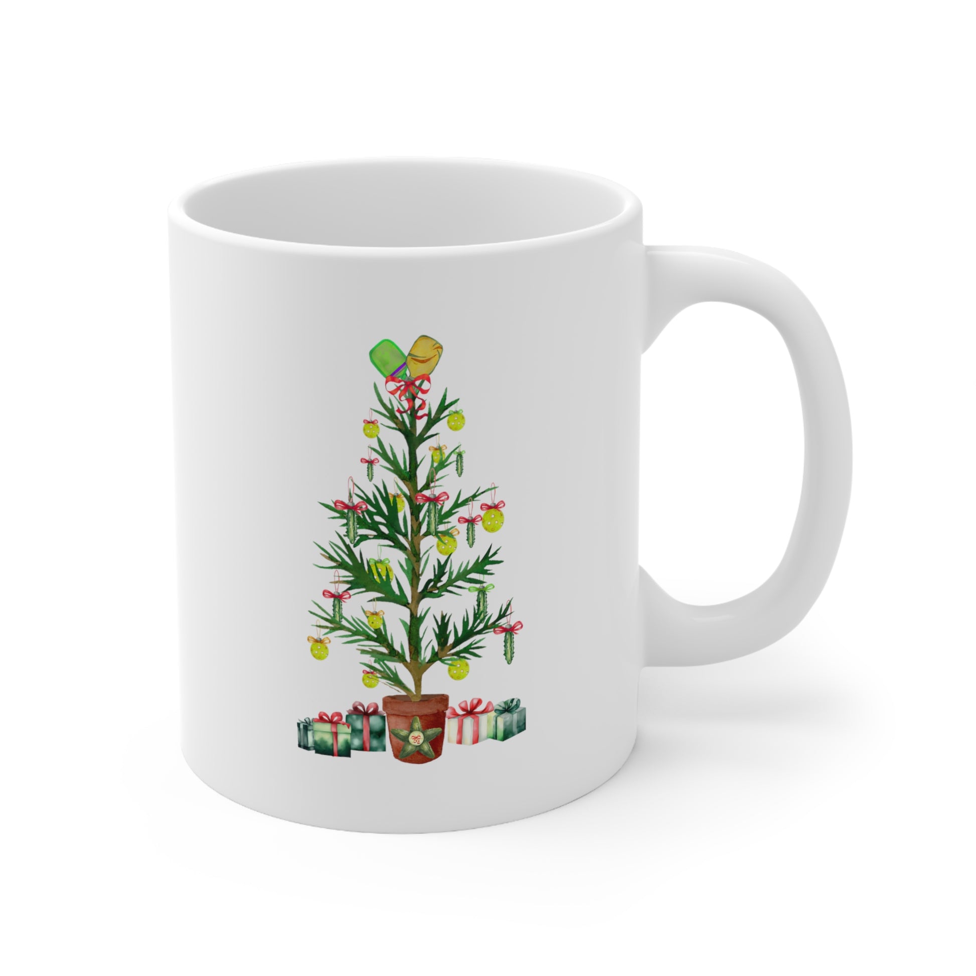 Warm your hands around this charming pickleball-themed holiday mug. This custom design features a Christmas tree adorned with paddles, pickleballs, and actual pickles on one side, and the words "Deck the Halls With Pickleballs" on the other side. This high-quality ceramic mug is sure to bring a smile to your face as you sip your favorite beverage.