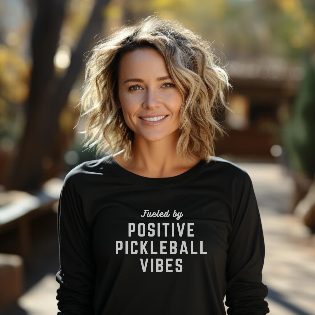 Bring good energy to the court with the "Fueled by Positive Pickleball Vibes" super comfortable long sleeve tee. Whether you're dinking, smashing, or just hanging with your pickleball crew, this shirt is all about spreading positive vibes and having fun.