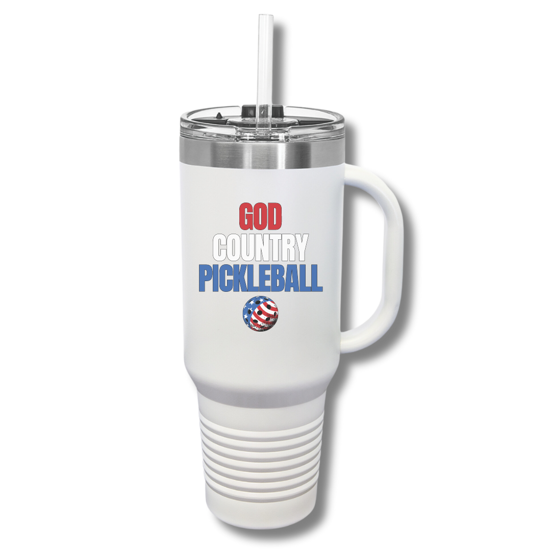 The God Country Pickleball thermal 40oz. tumbler combines your love for the game, your devotion to America, and your faith. Bring it to the court knowing that you carry the spirit of God and the red, white, and blue with every swing of your paddle. It has the same technology as the trending tumbler, plus the handle is solid welded steel AND it's pickleball themed - even better!