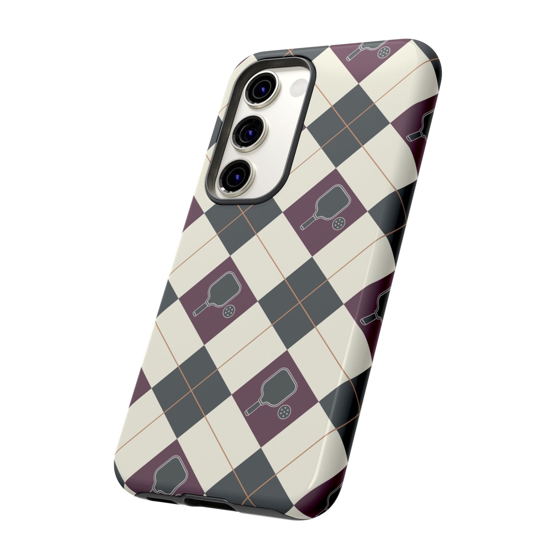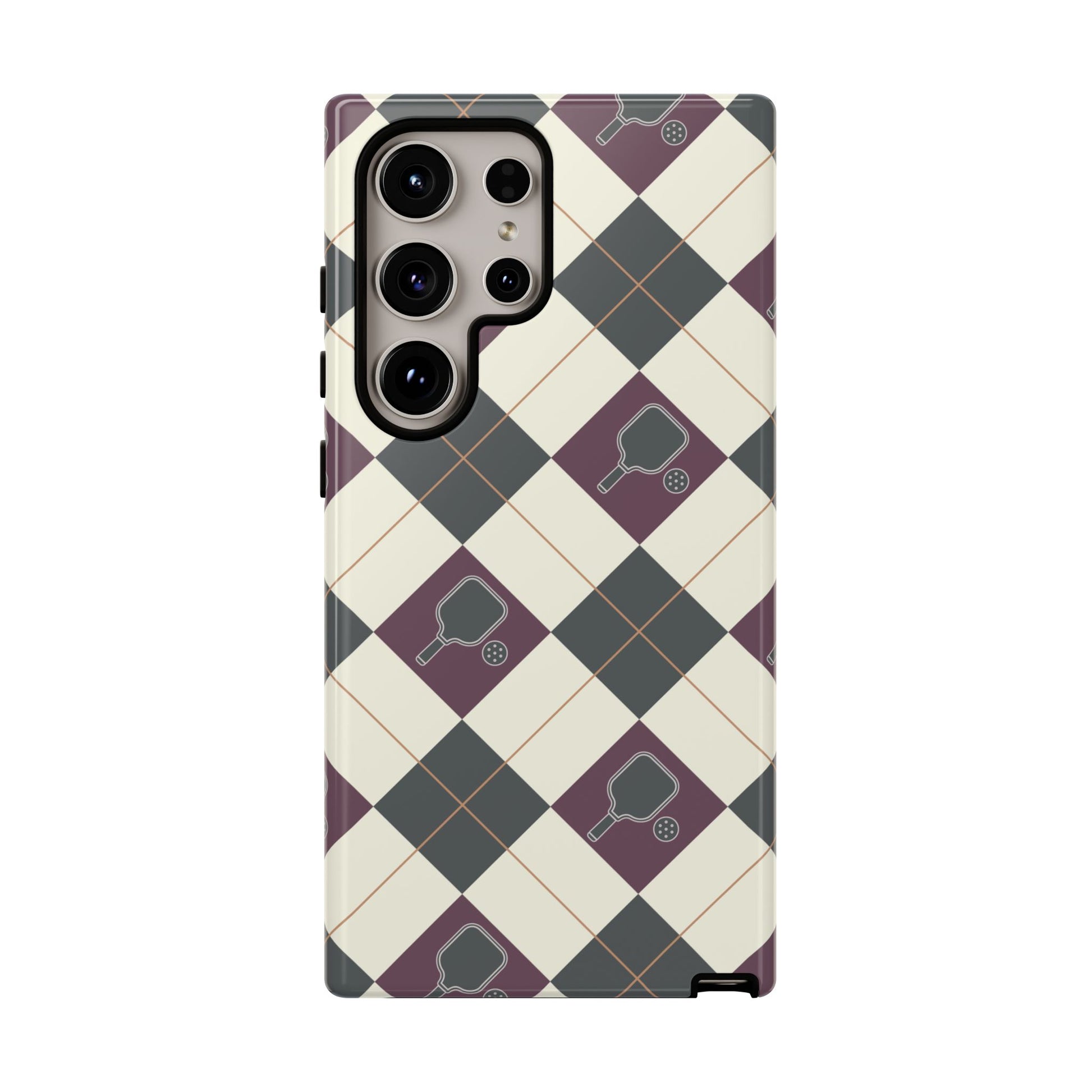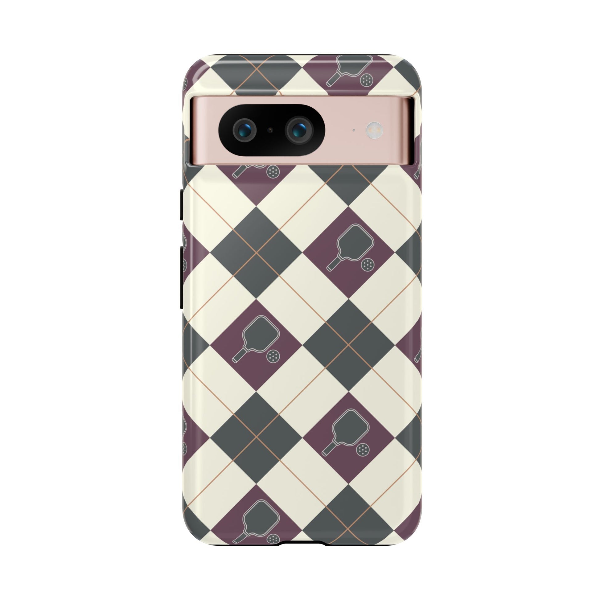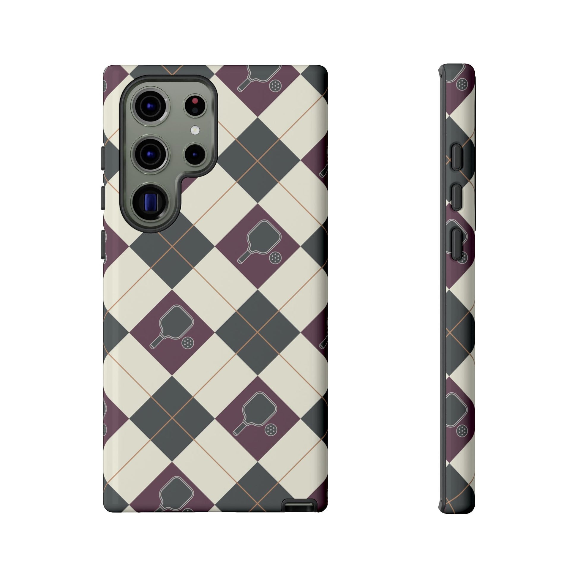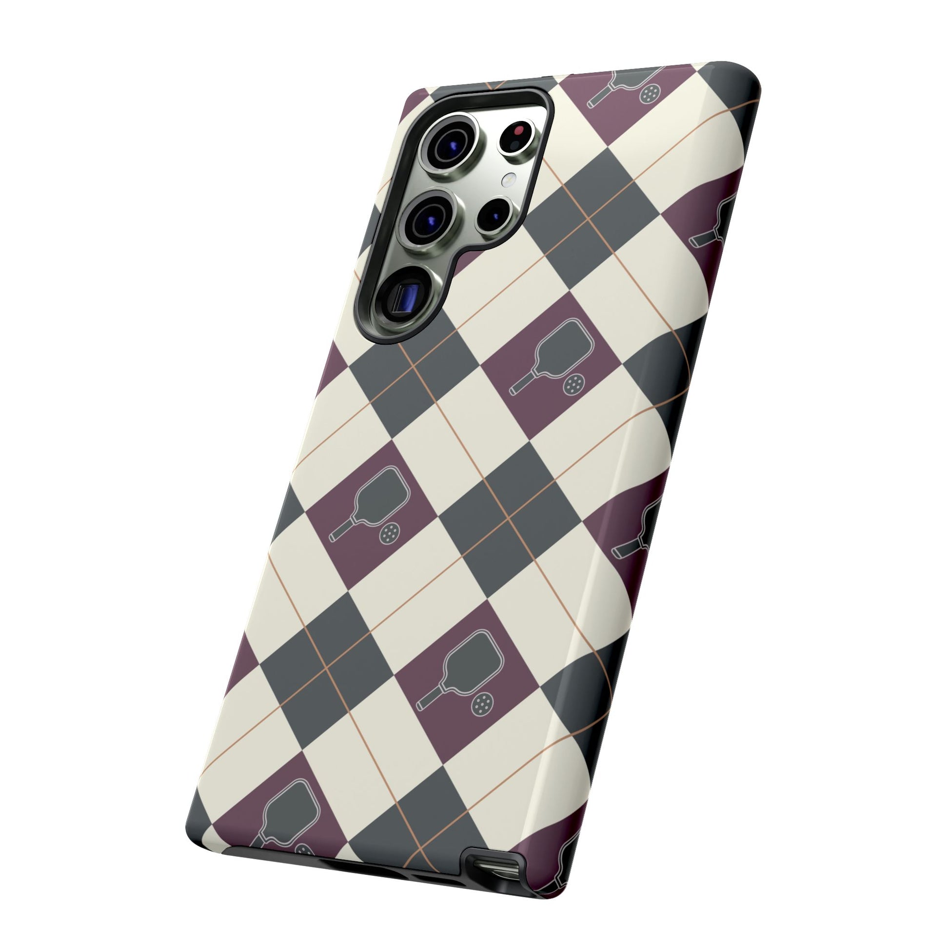 Experience a unique blend of classic style and sporty design with this dark green and purple argyle cell phone case. Scattered with small pickleball paddles, this design appeals to pickleball players who want to protect their phones while sharing their love for the game.