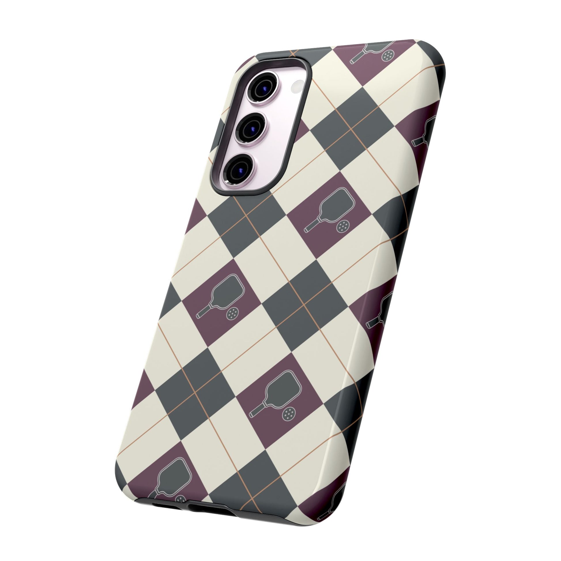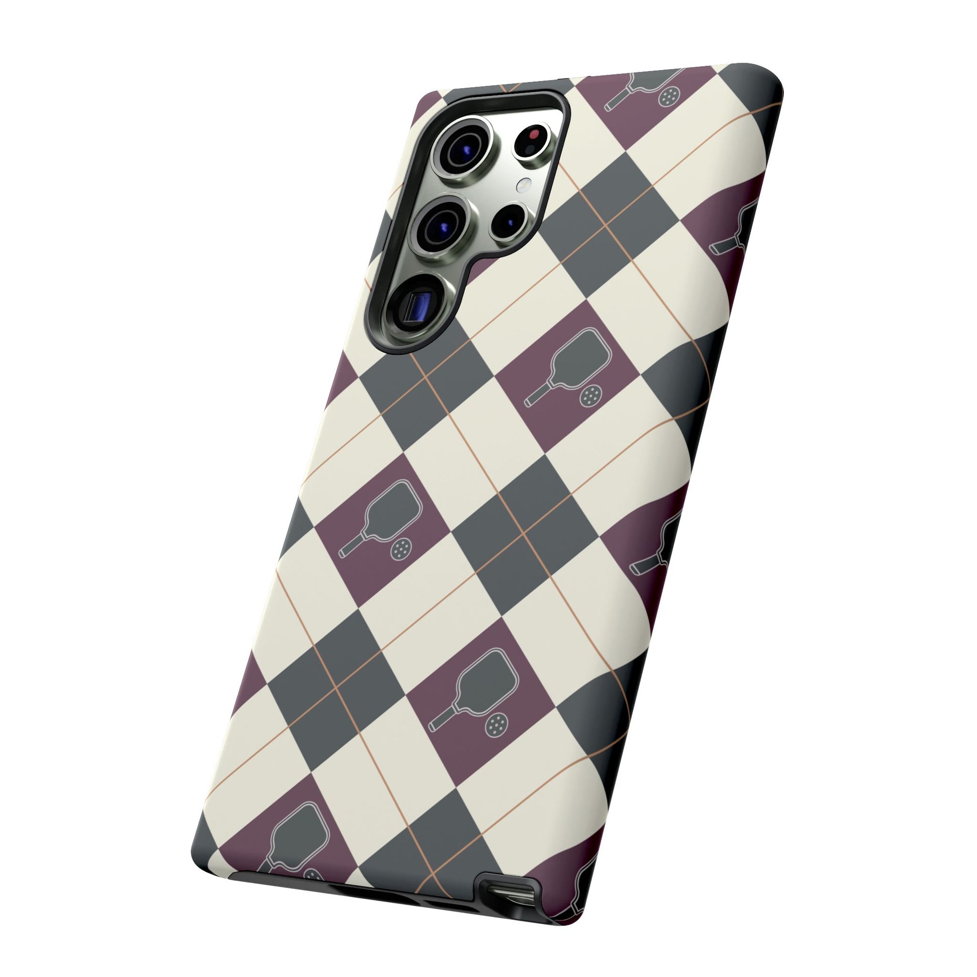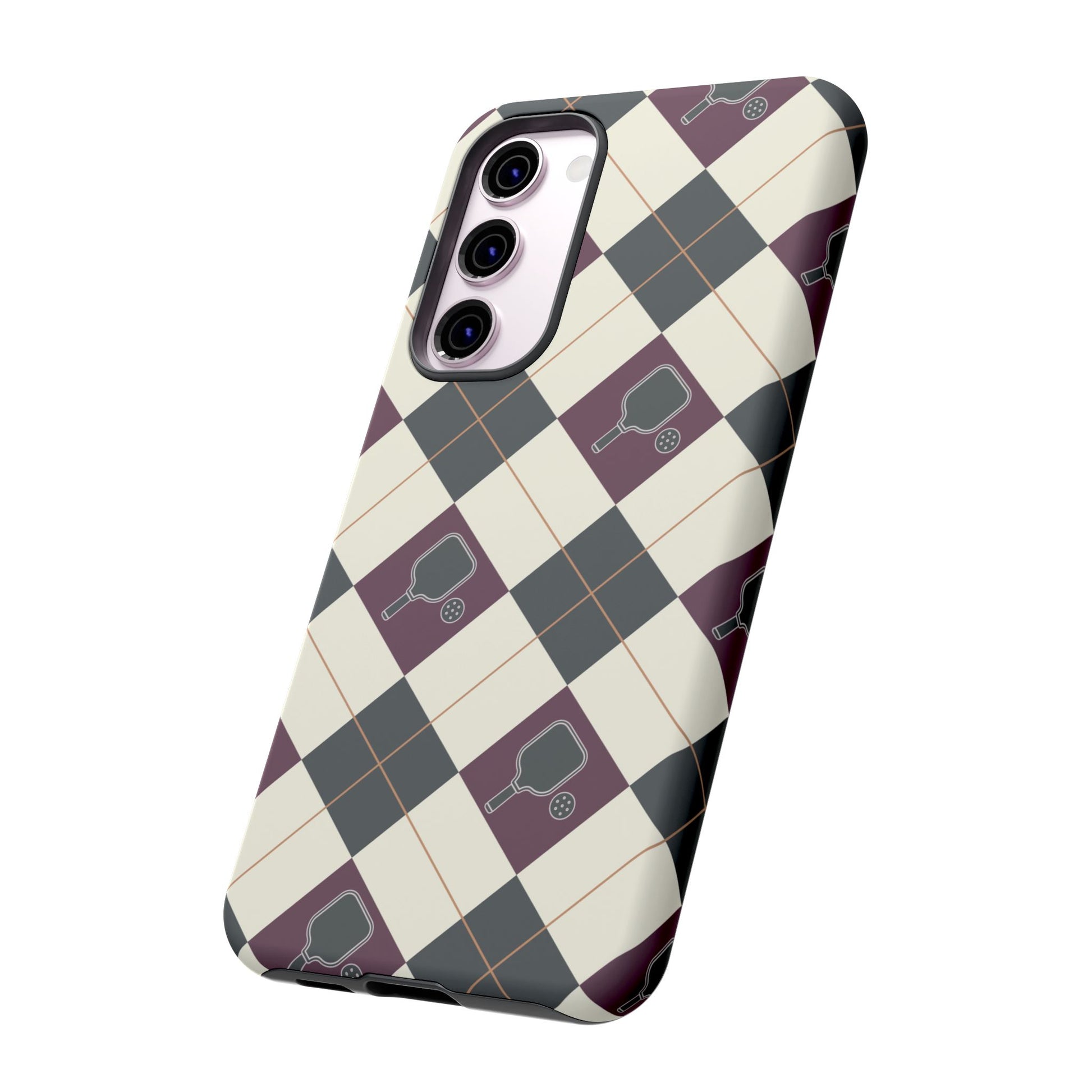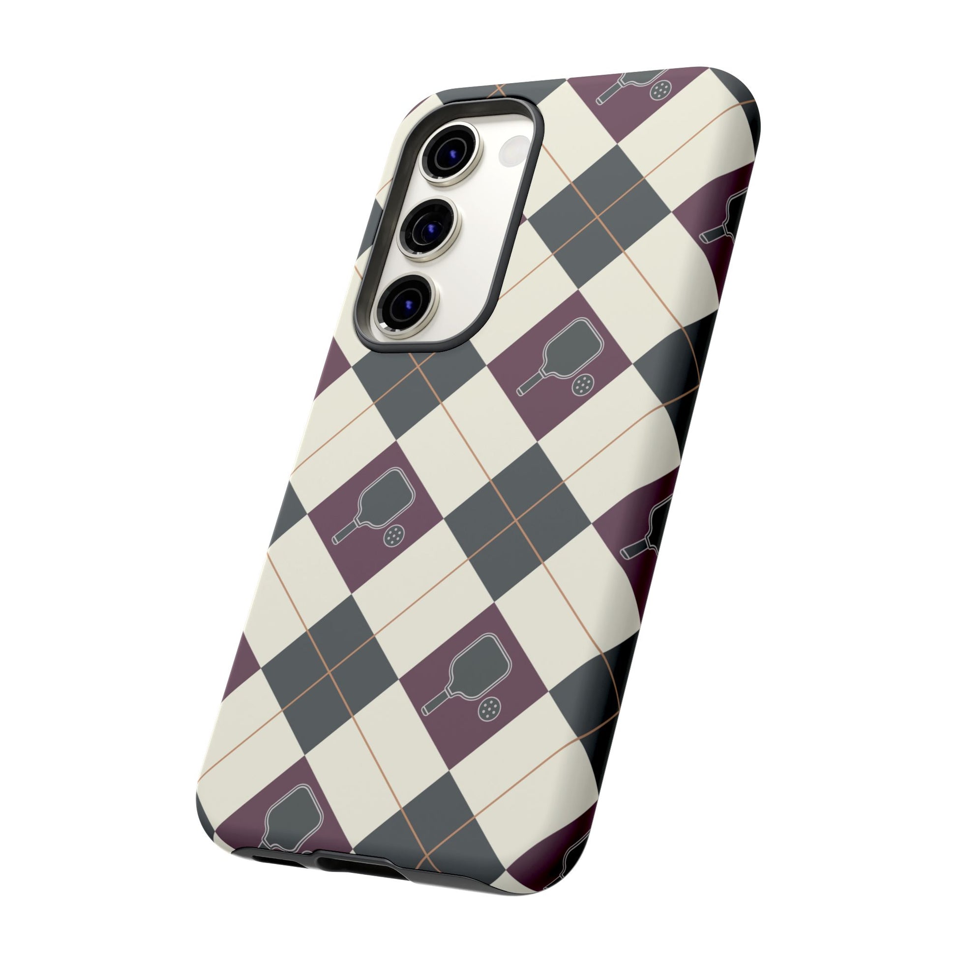 Experience a unique blend of classic style and sporty design with this dark green and purple argyle cell phone case. Scattered with small pickleball paddles, this design appeals to pickleball players who want to protect their phones while sharing their love for the game.