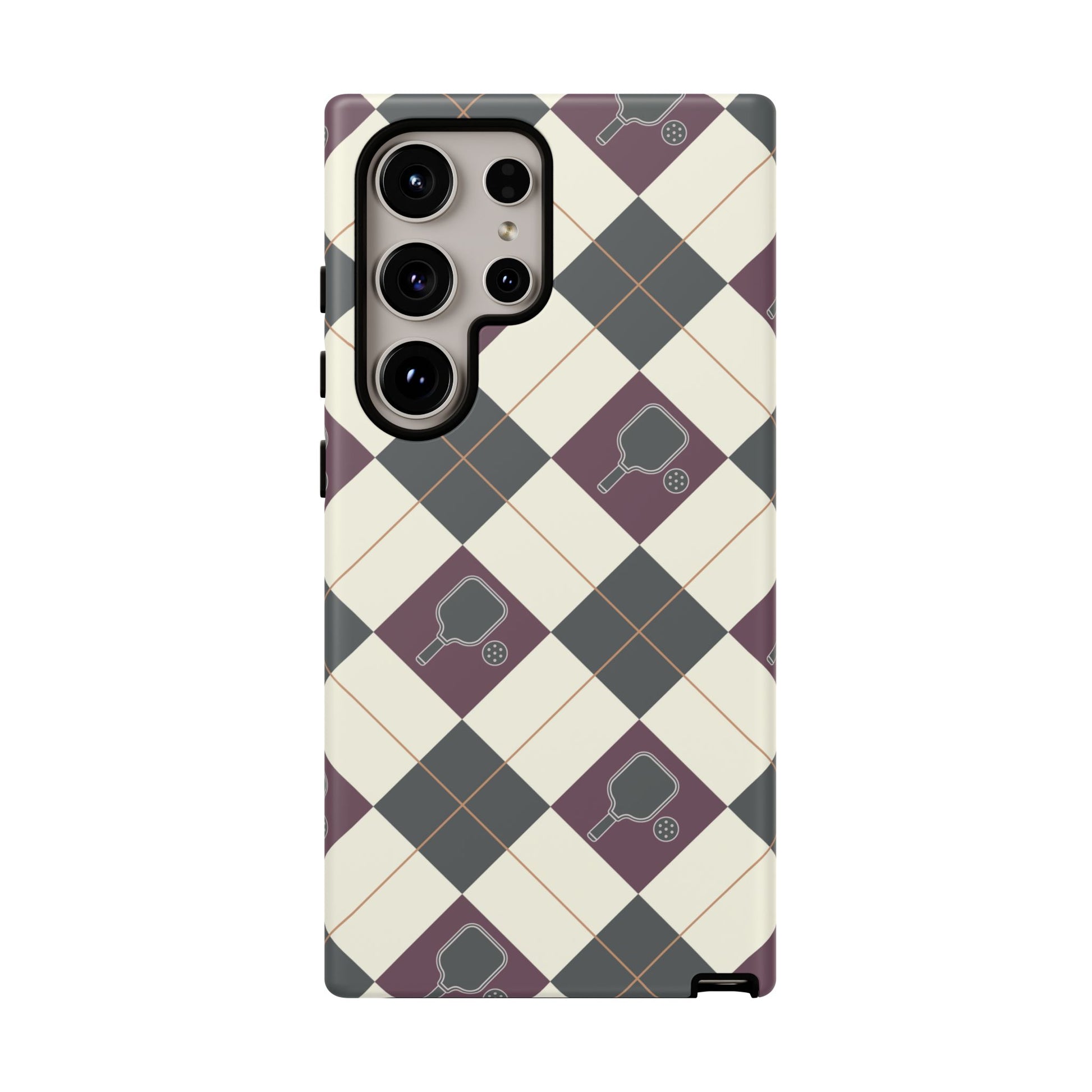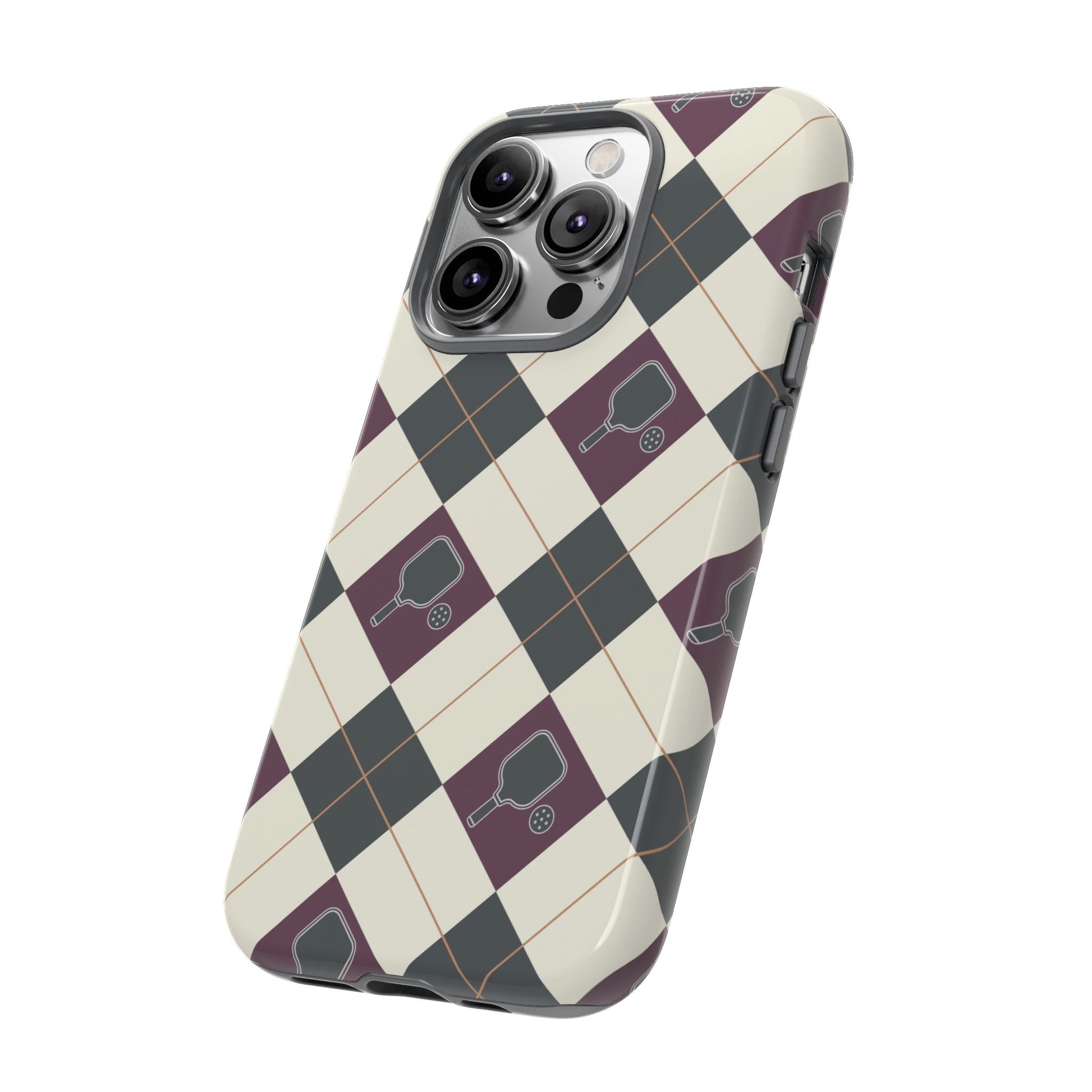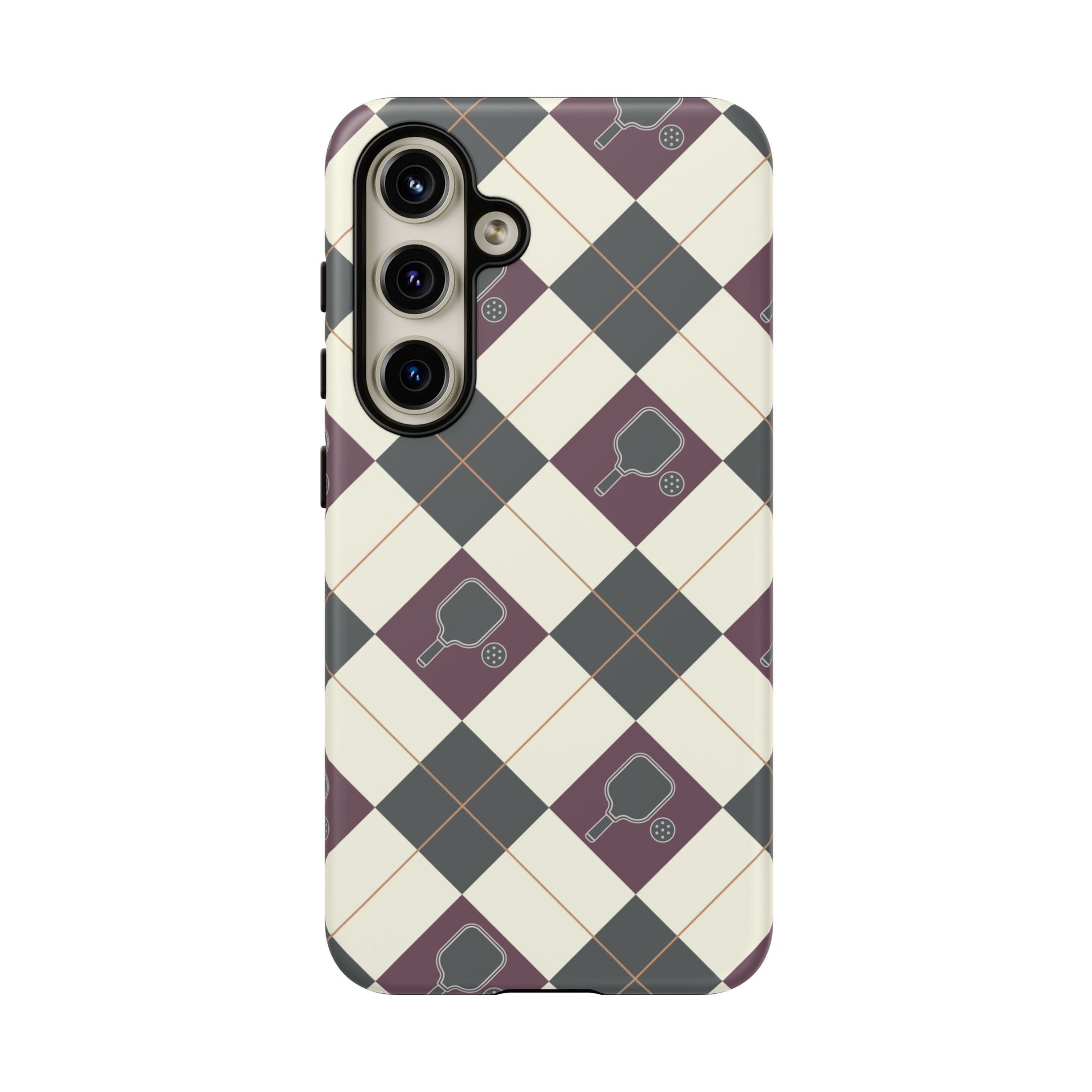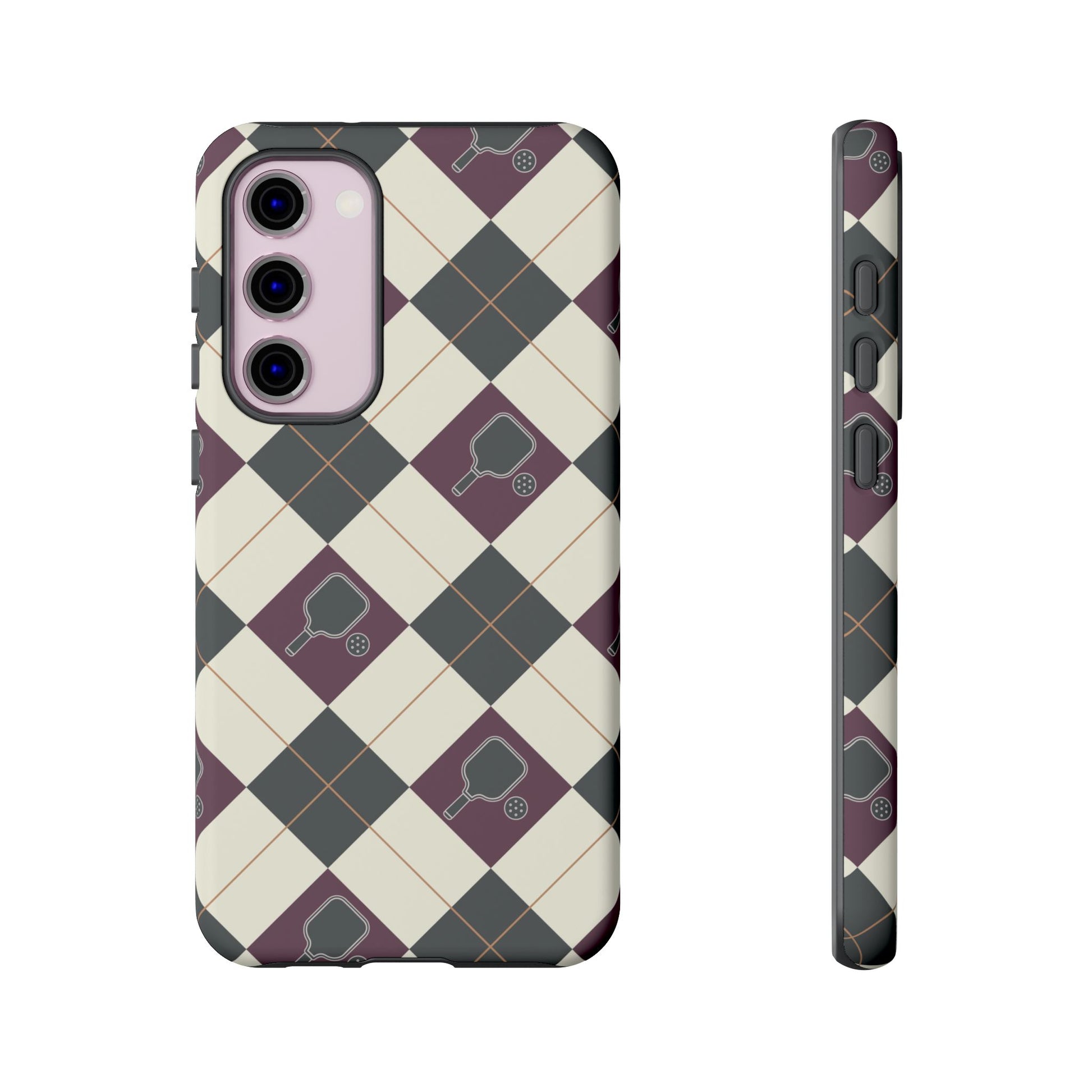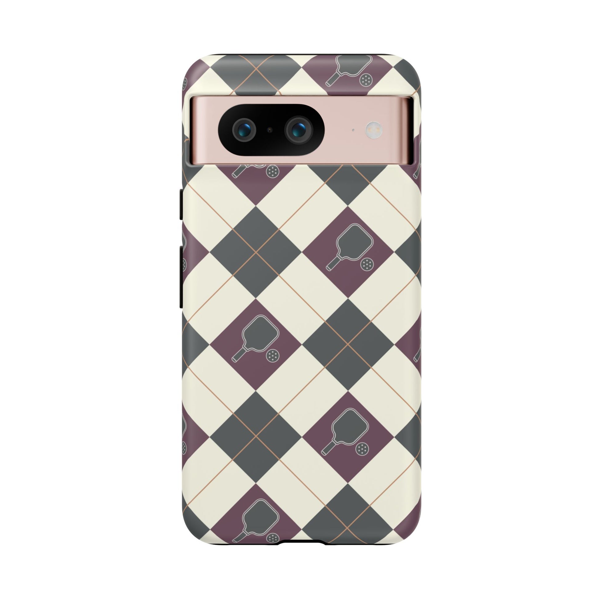 Experience a unique blend of classic style and sporty design with this dark green and purple argyle cell phone case. Scattered with small pickleball paddles, this design appeals to pickleball players who want to protect their phones while sharing their love for the game.