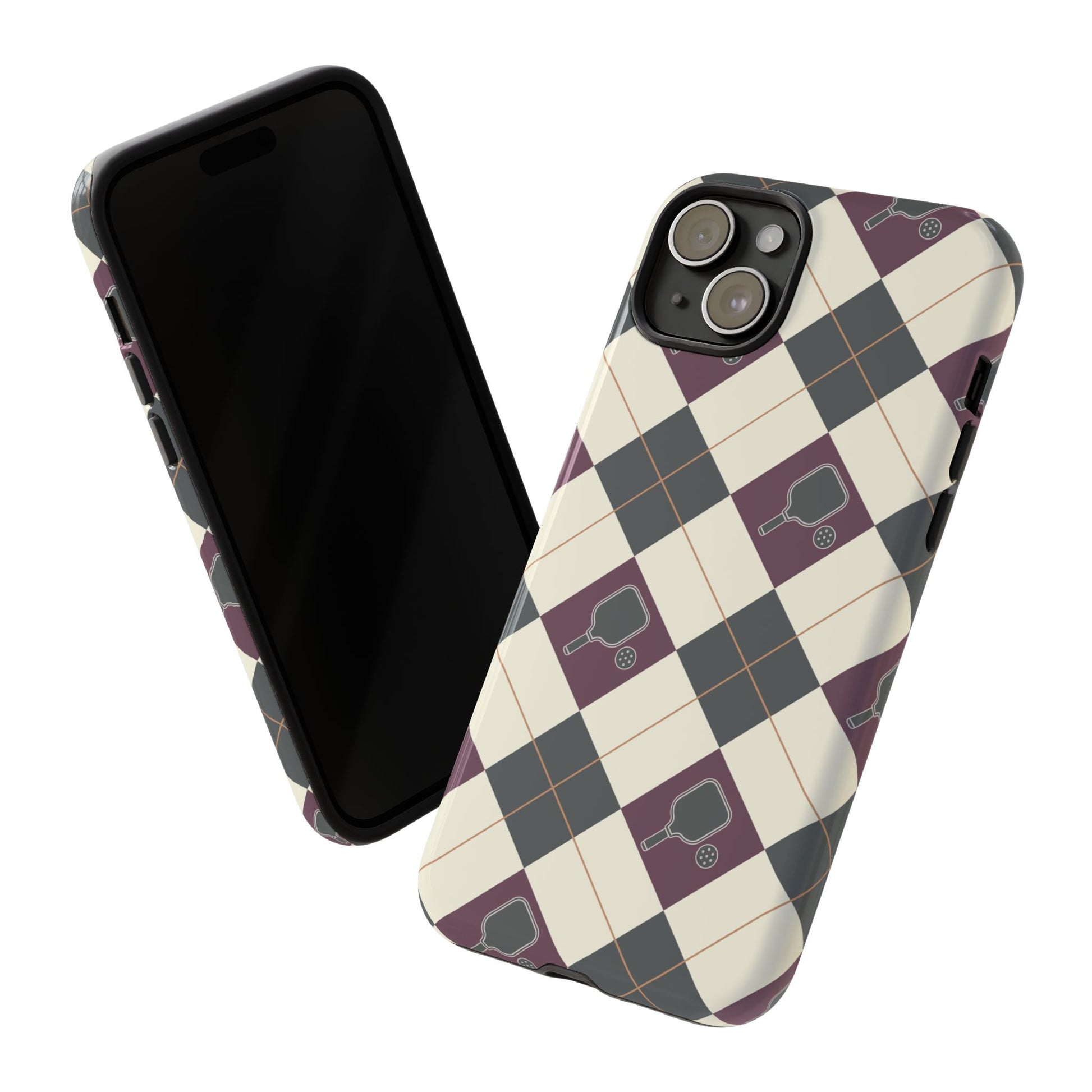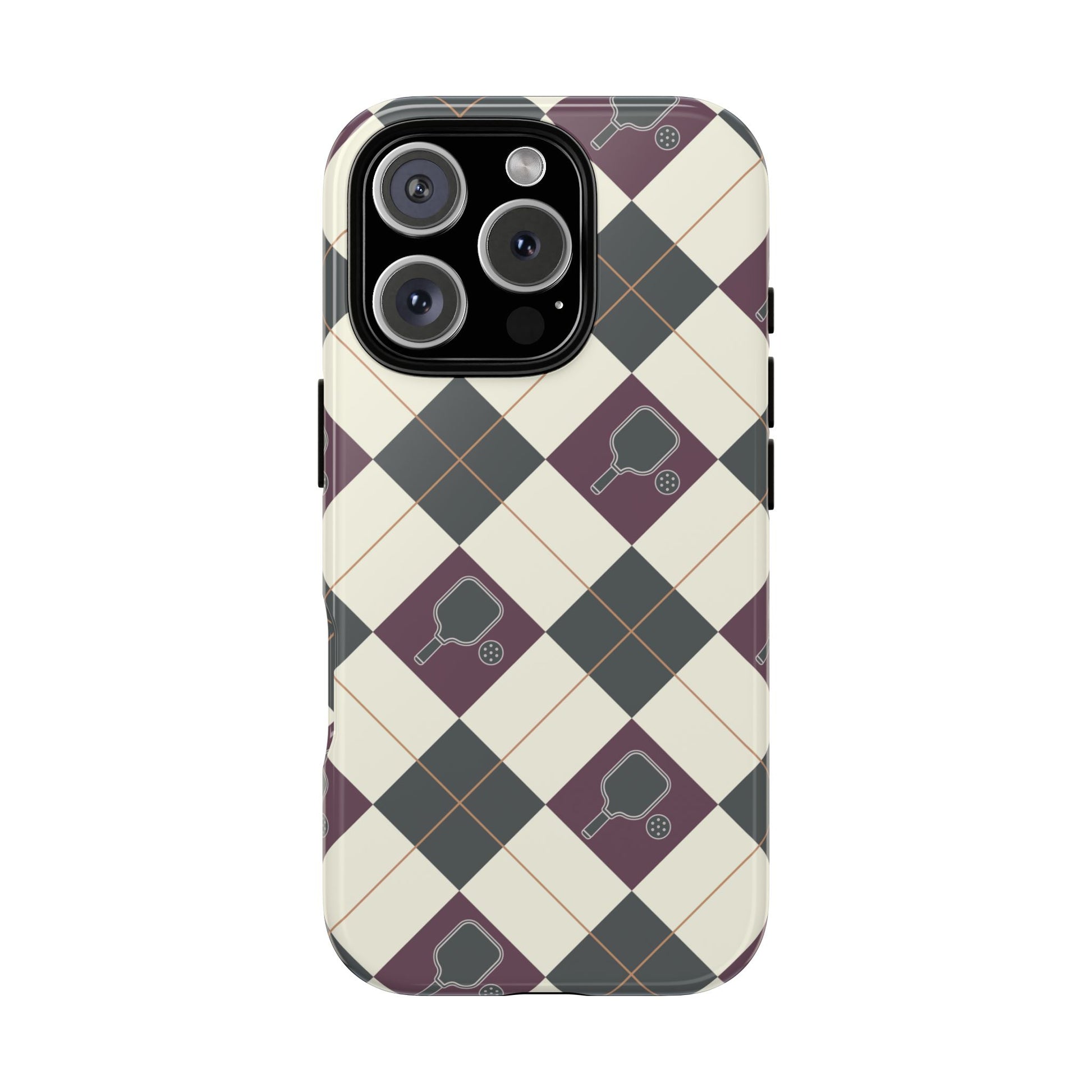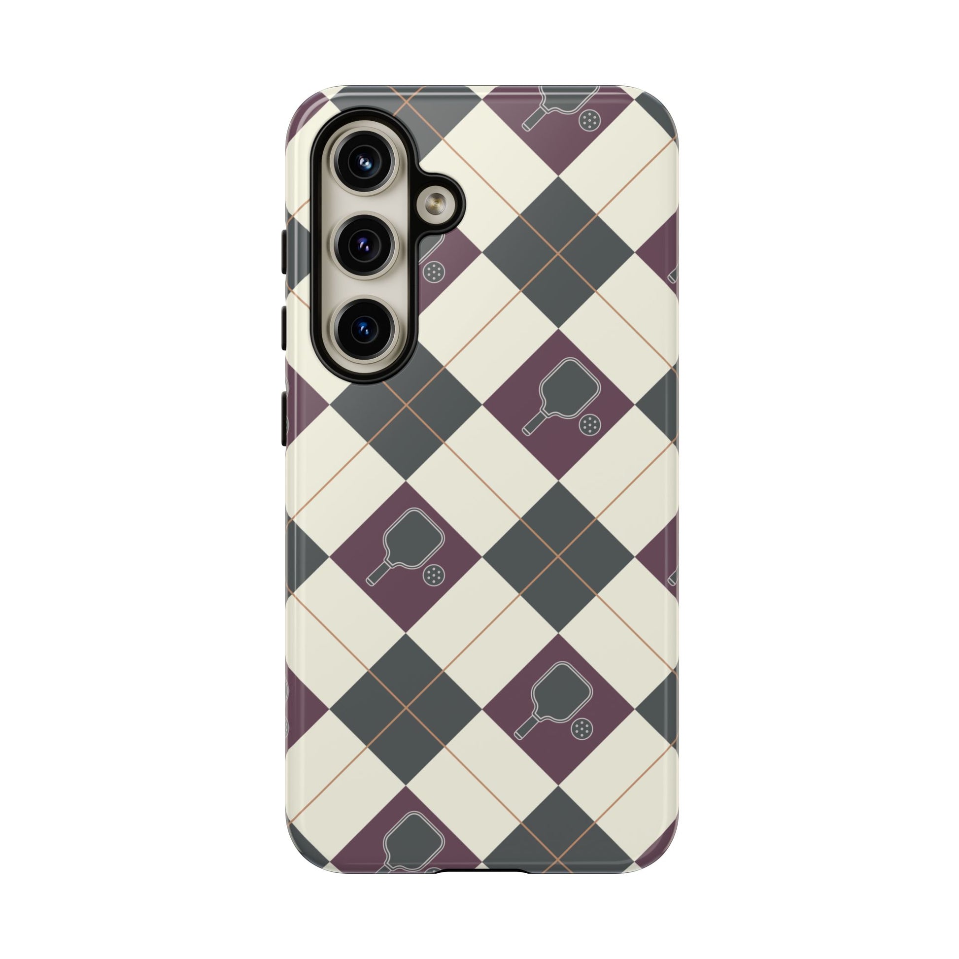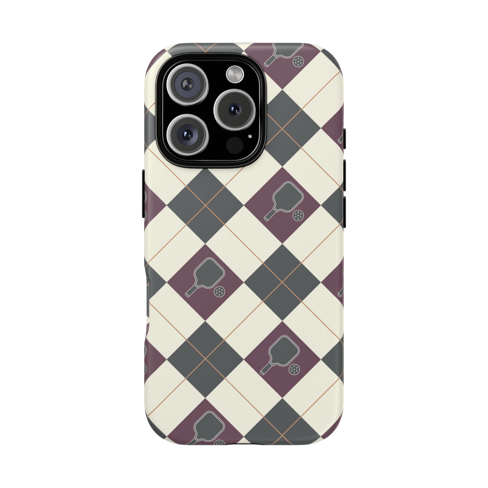 Experience a unique blend of classic style and sporty design with this dark green and purple argyle cell phone case. Scattered with small pickleball paddles, this design appeals to pickleball players who want to protect their phones while sharing their love for the game.