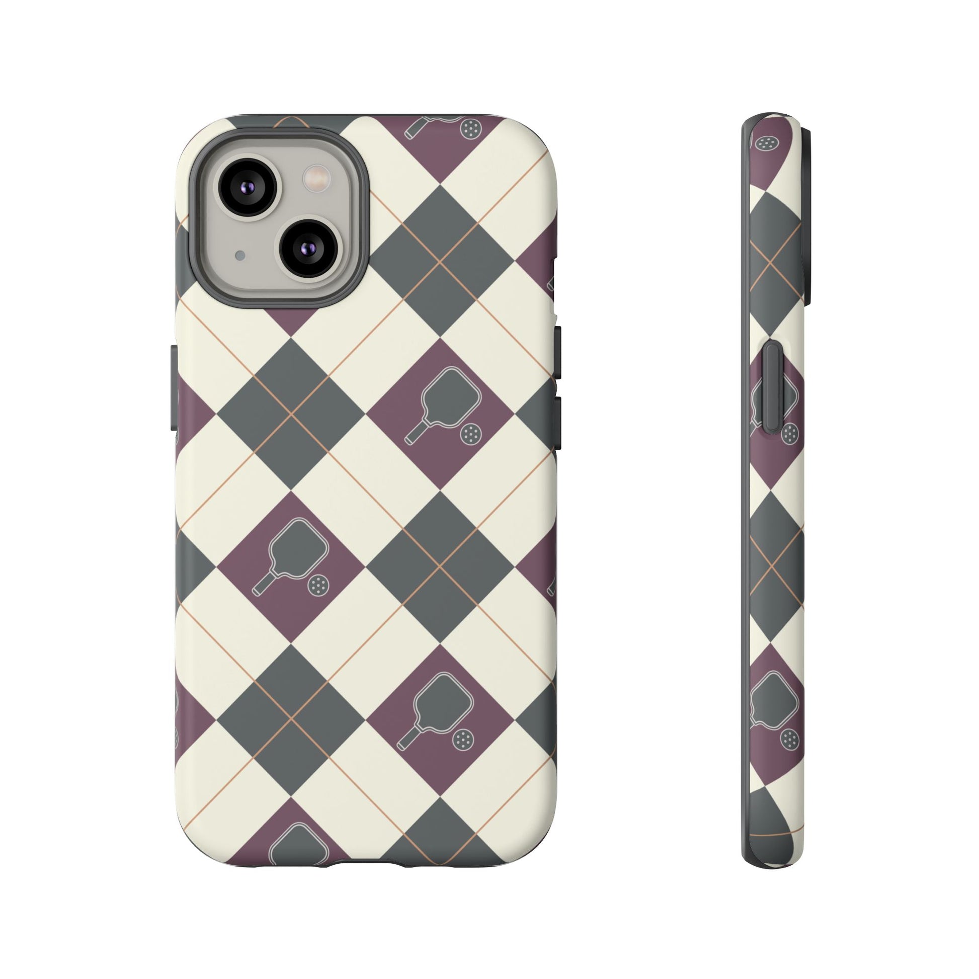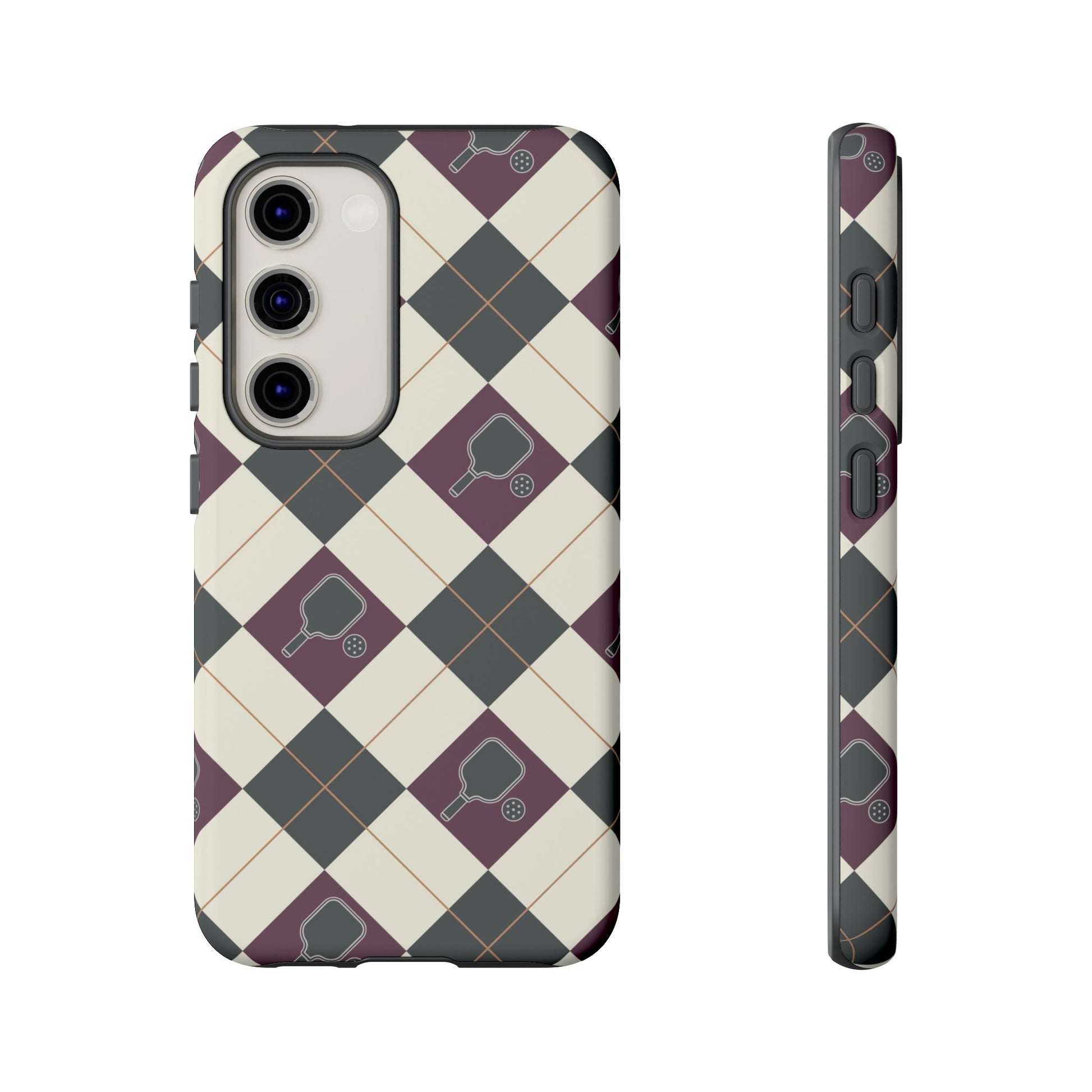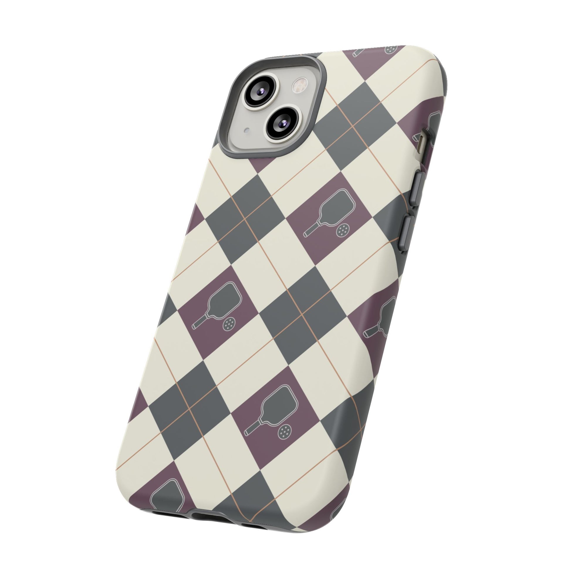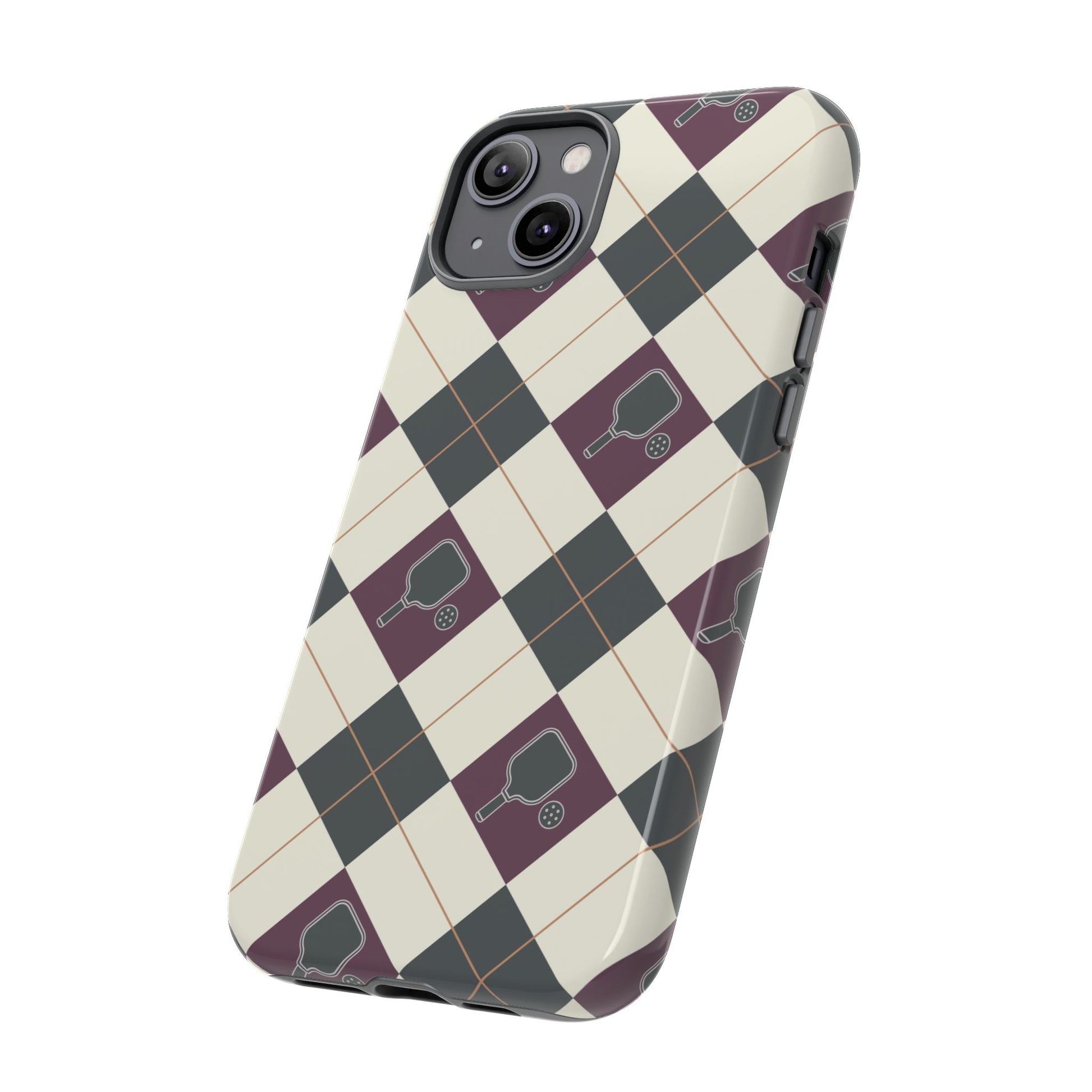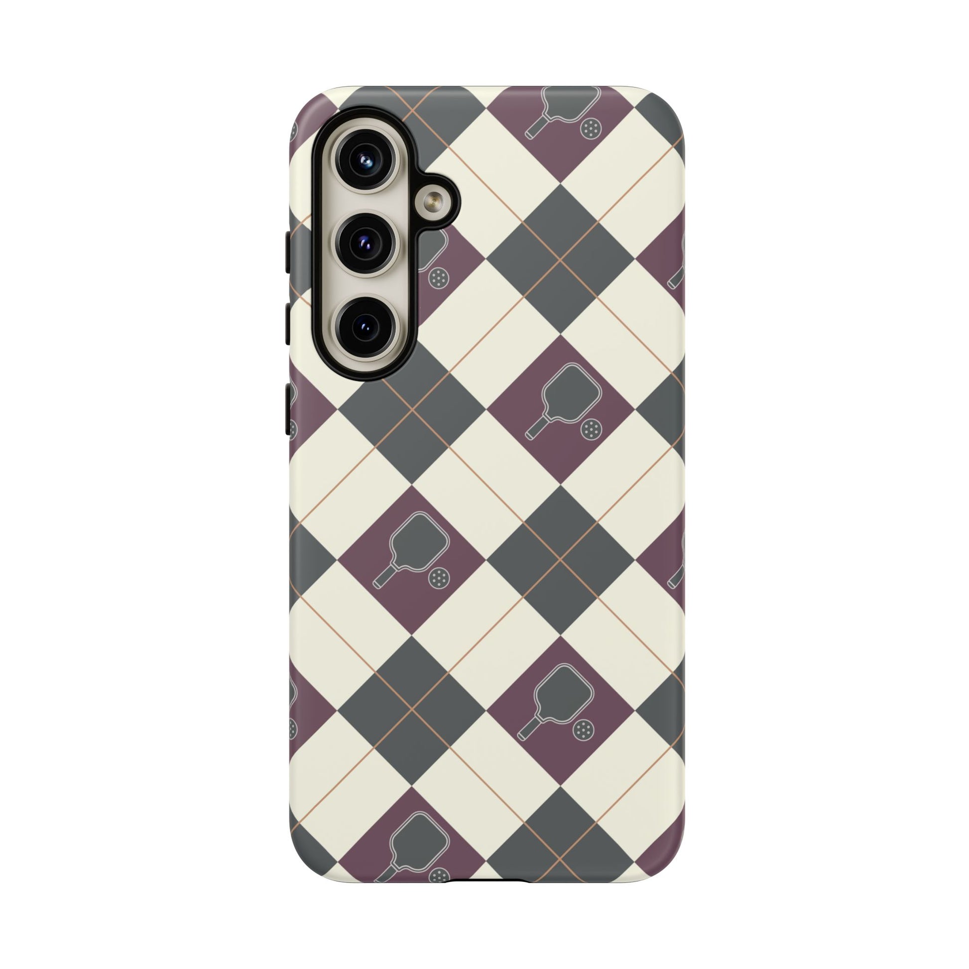 Experience a unique blend of classic style and sporty design with this dark green and purple argyle cell phone case. Scattered with small pickleball paddles, this design appeals to pickleball players who want to protect their phones while sharing their love for the game.