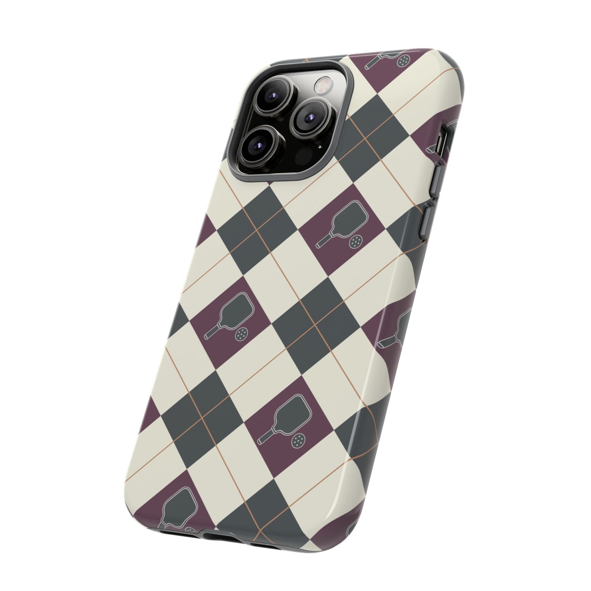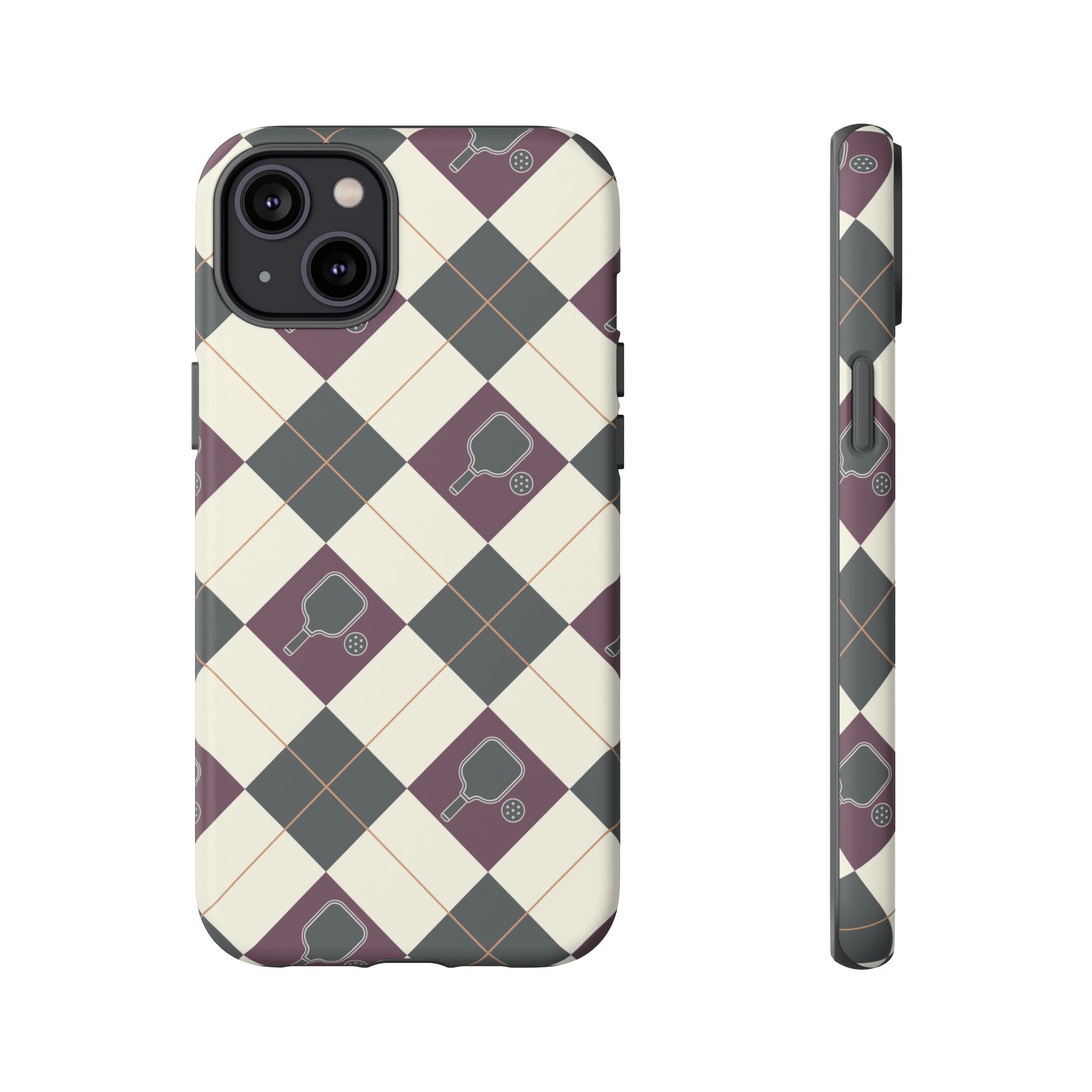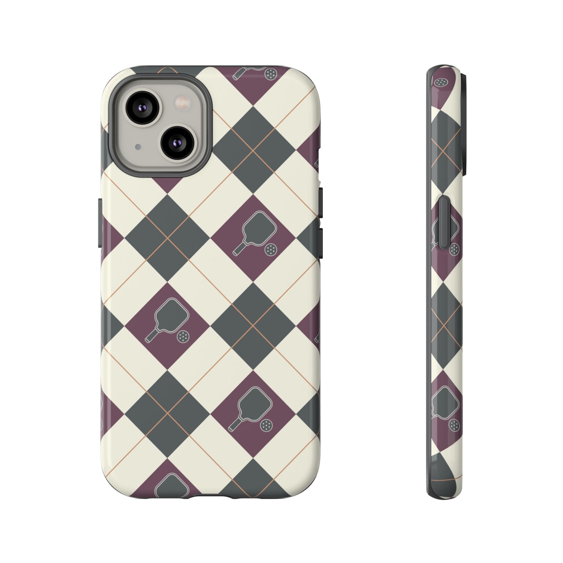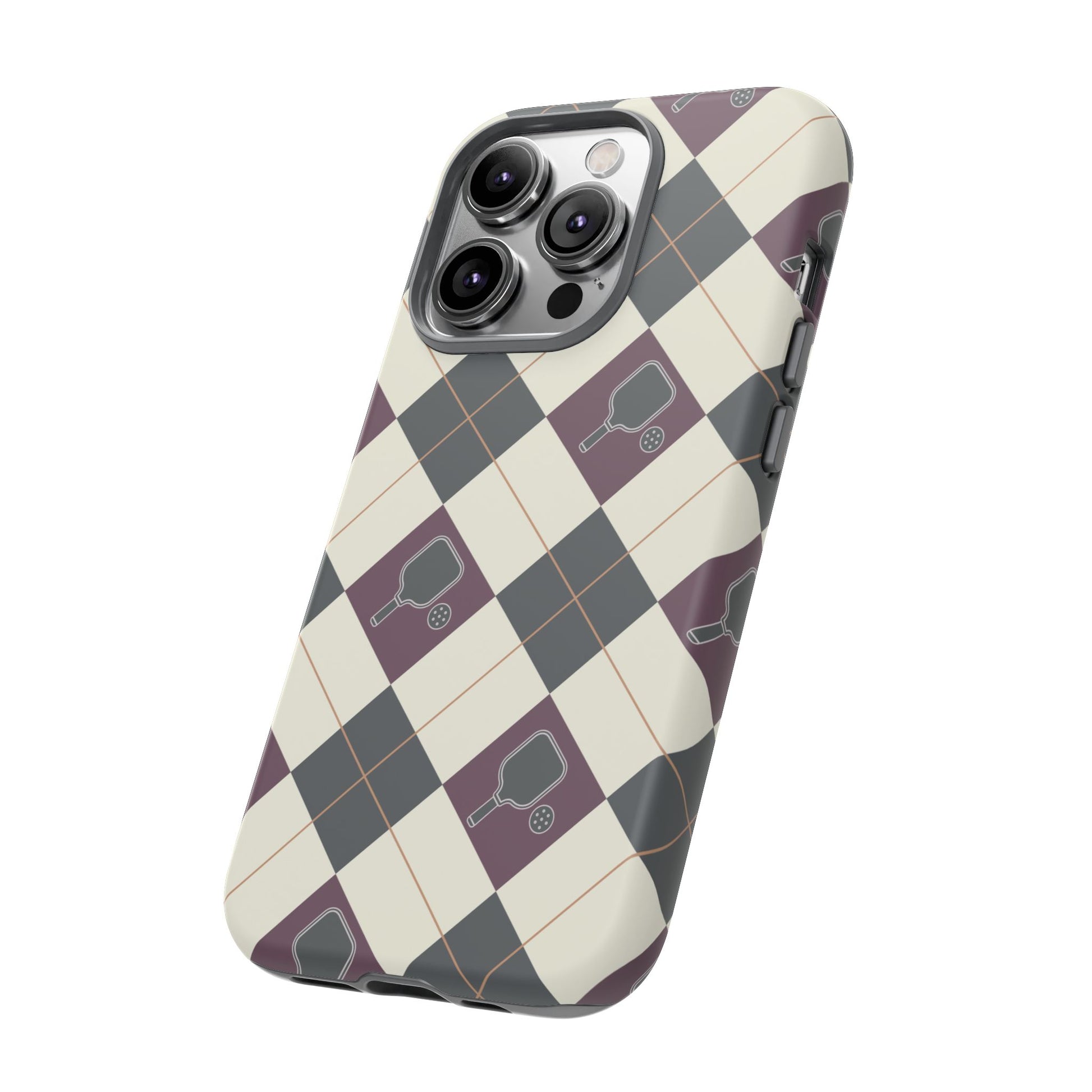 Experience a unique blend of classic style and sporty design with this dark green and purple argyle cell phone case. Scattered with small pickleball paddles, this design appeals to pickleball players who want to protect their phones while sharing their love for the game.