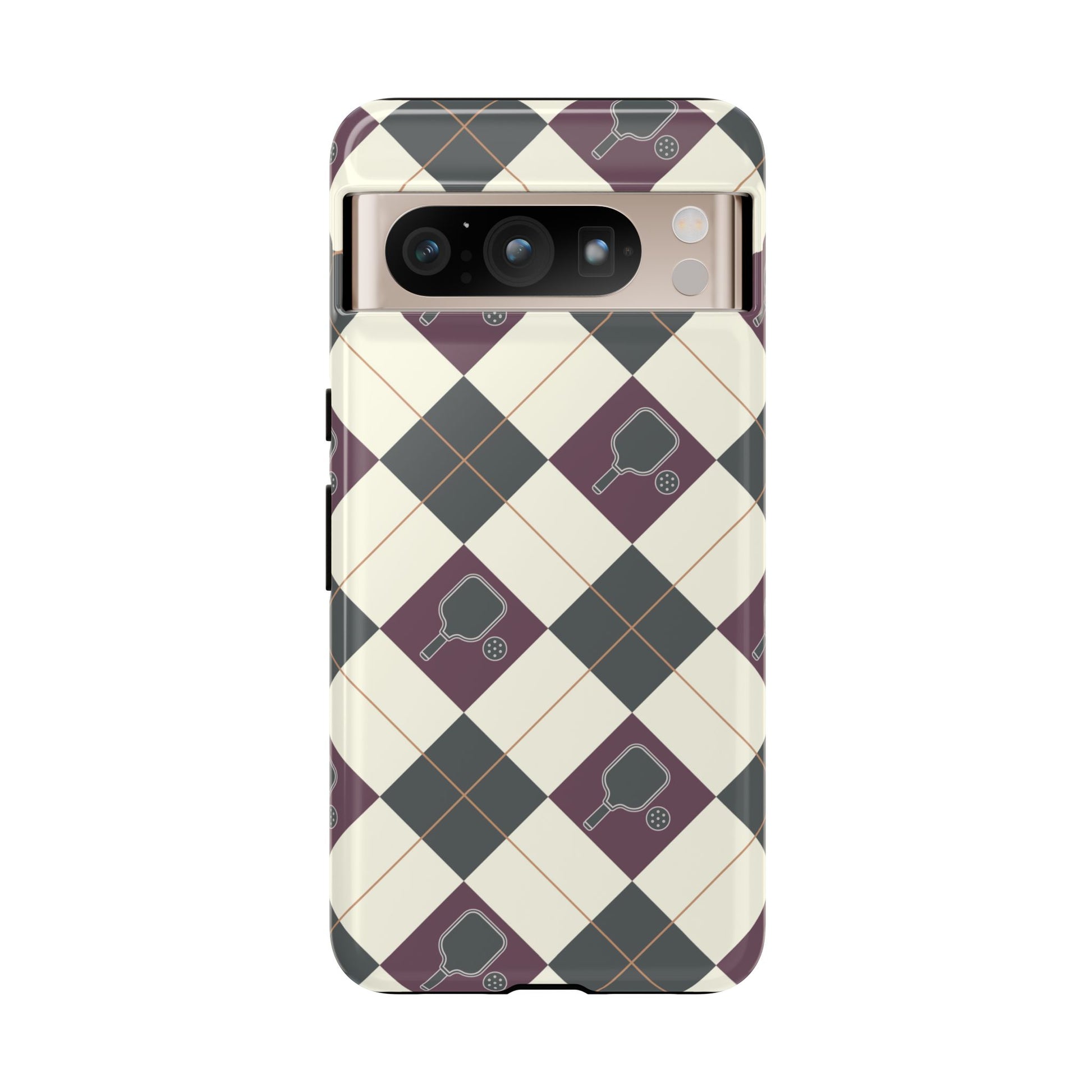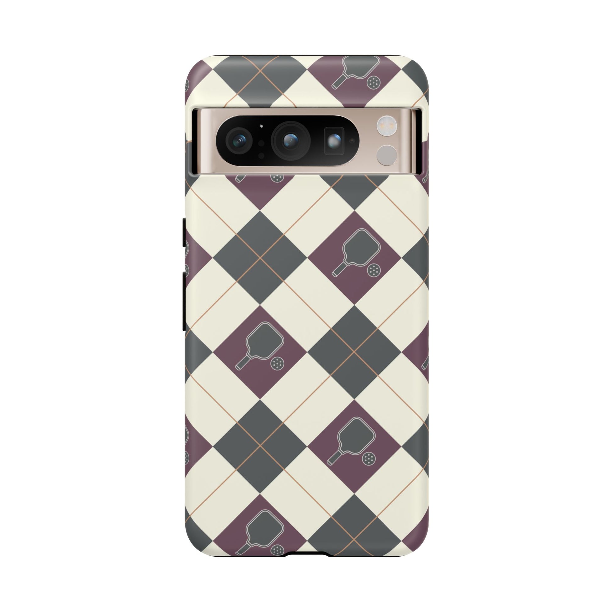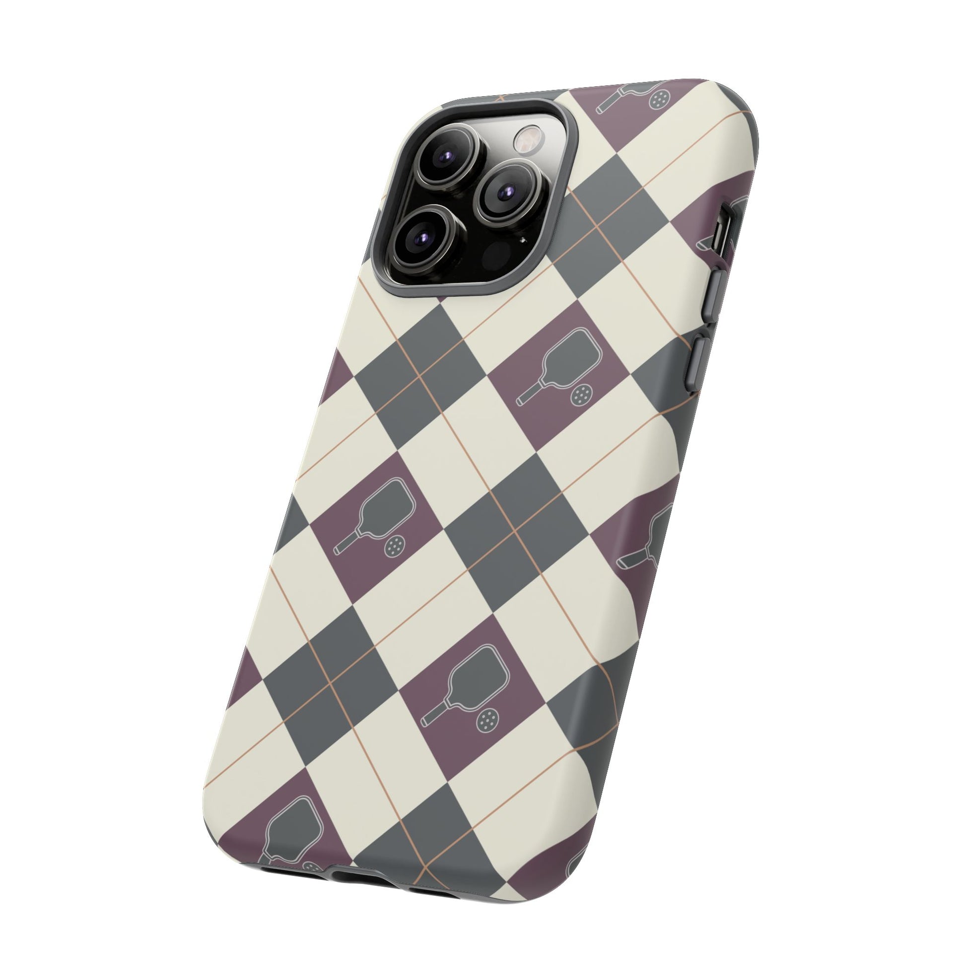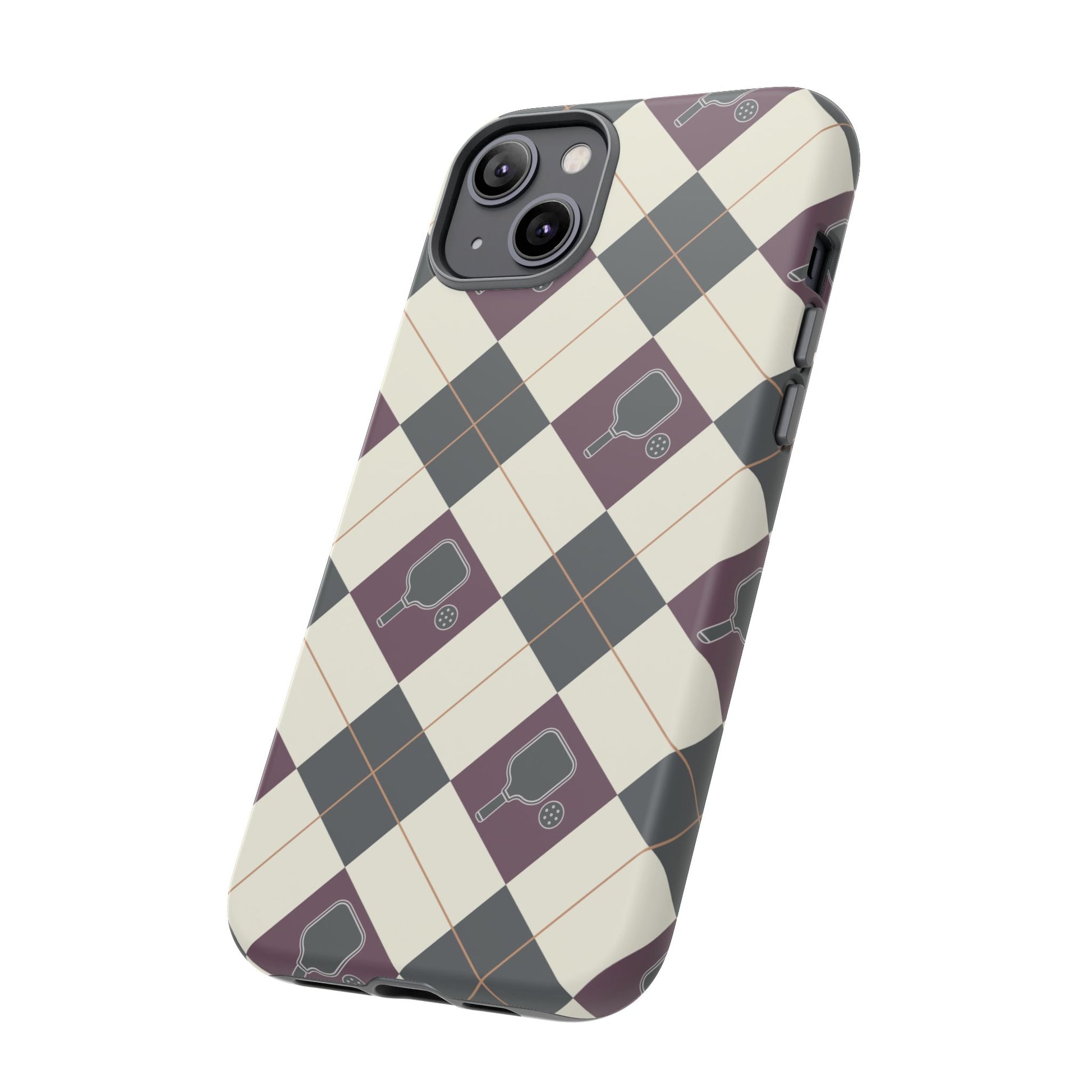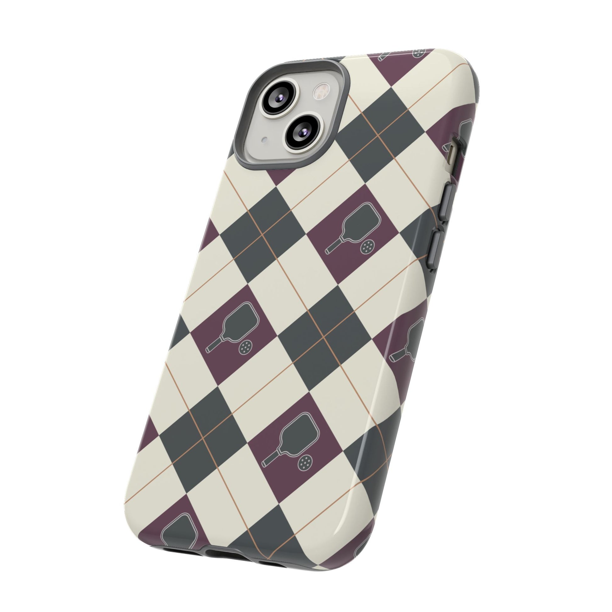 Experience a unique blend of classic style and sporty design with this dark green and purple argyle cell phone case. Scattered with small pickleball paddles, this design appeals to pickleball players who want to protect their phones while sharing their love for the game.