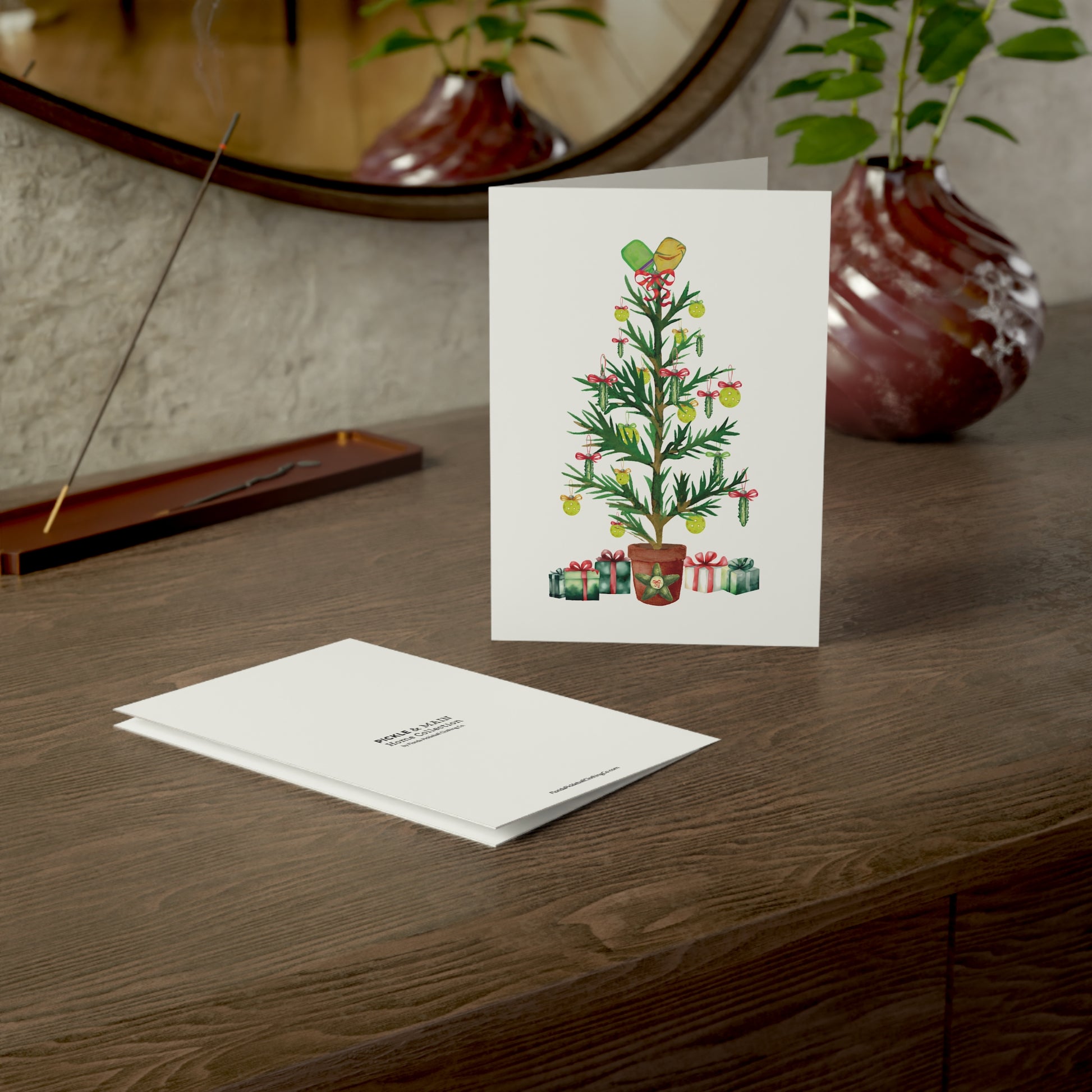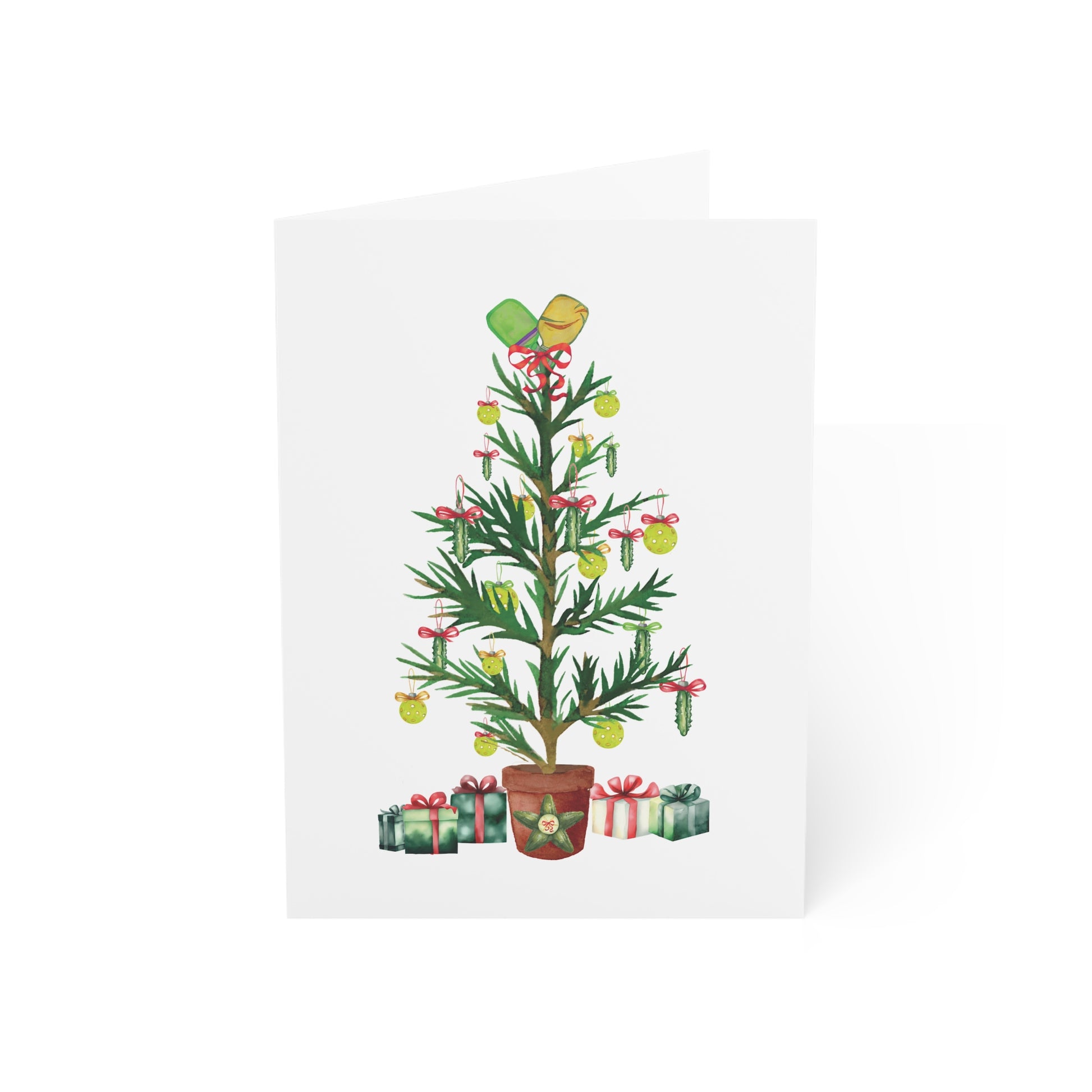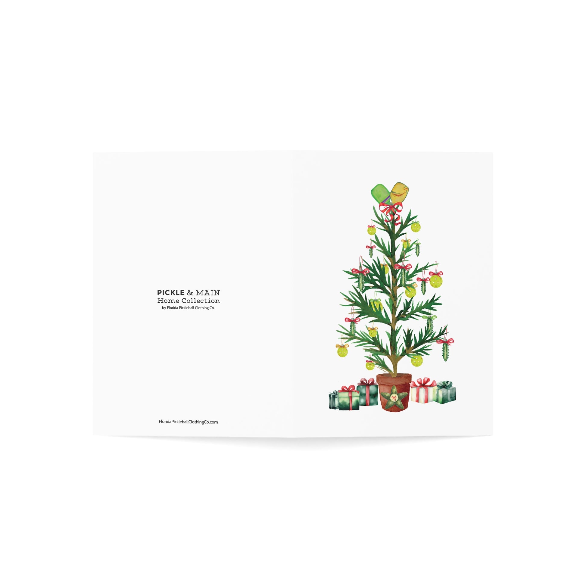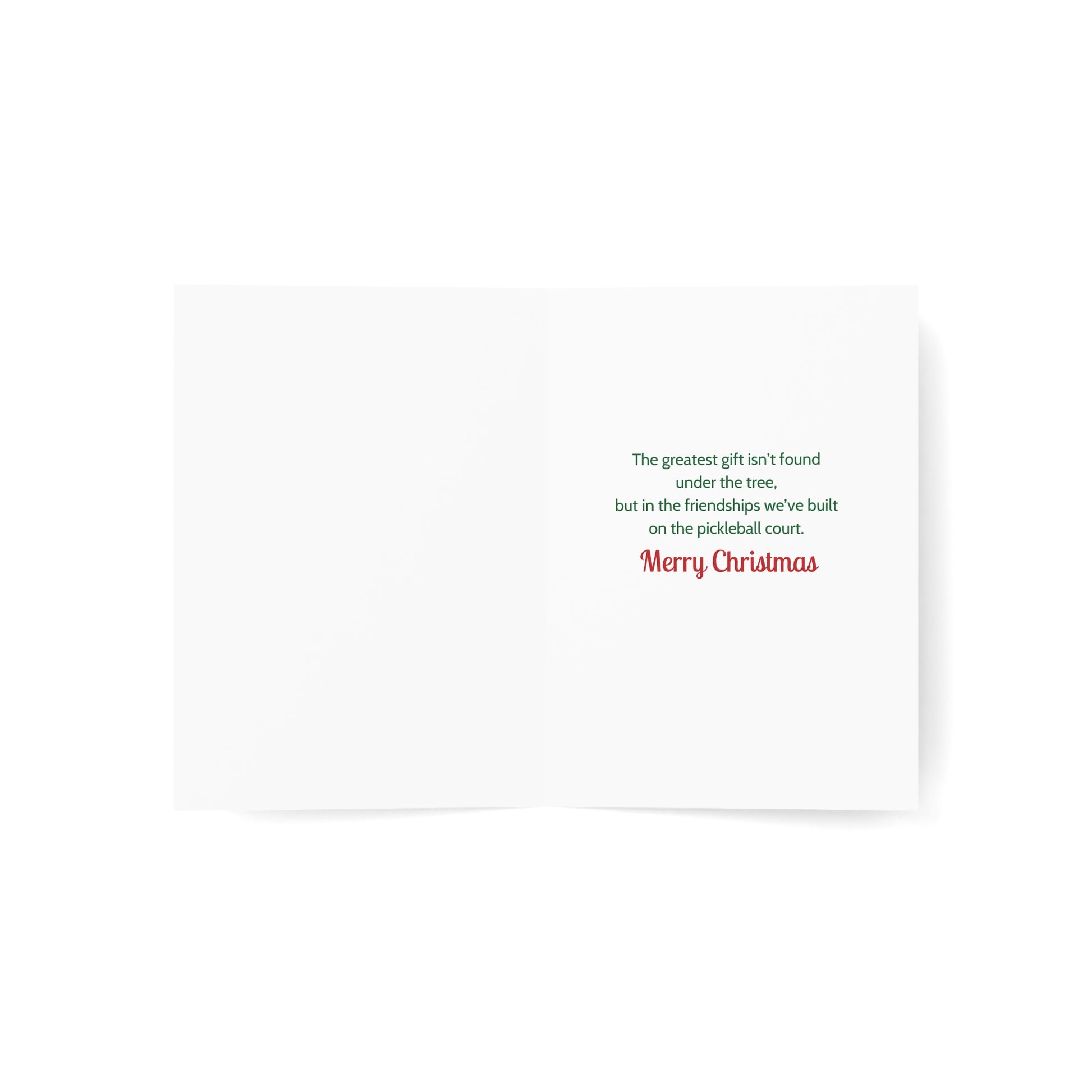 This charming pickleball holiday card features an illustrated Christmas tree adorned with paddles, pickleballs, and yes, even pickles! The heartfelt message inside is sure to bring a smile to the face of your pickleball loving recipient.