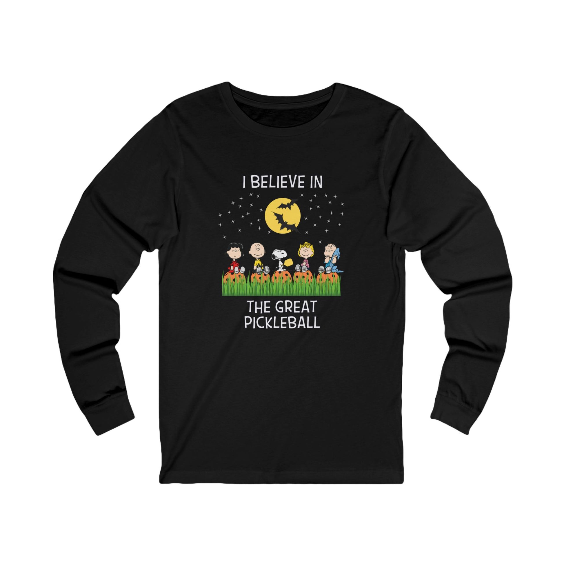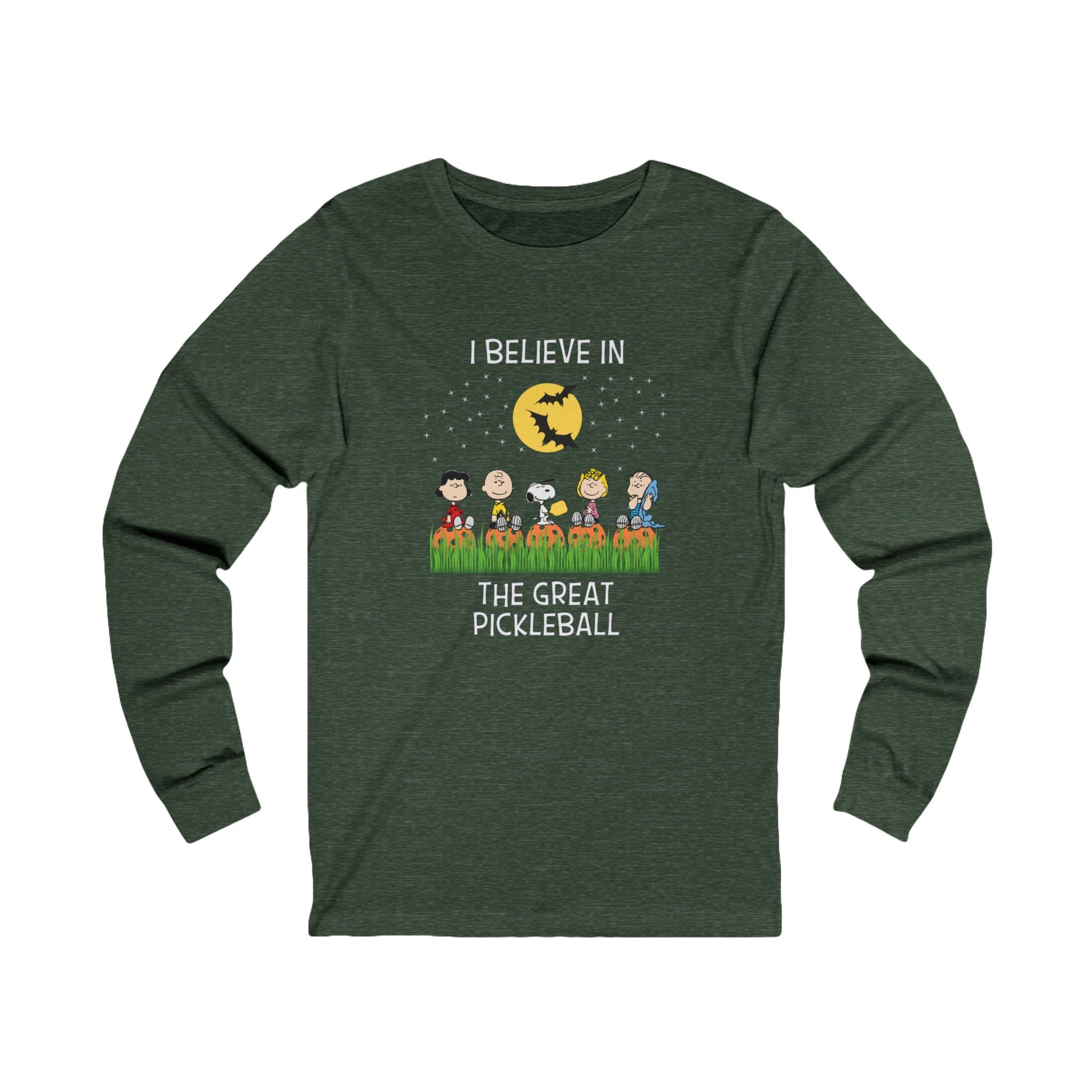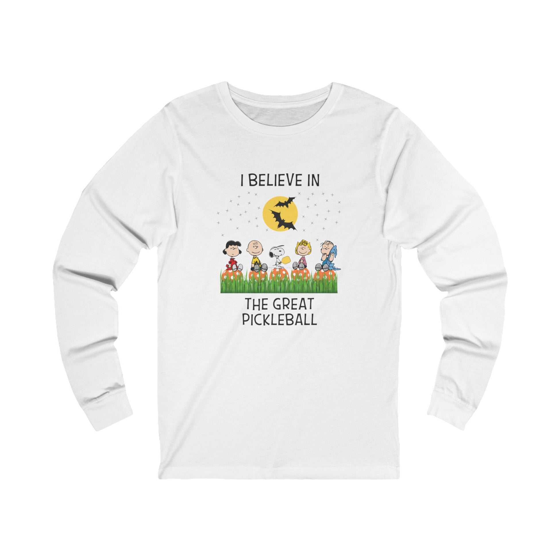 Celebrate Halloween and your love for pickleball with this soft and comfortable long sleeve tee. Featuring the phrase "I Believe In The Great Pickleball" and its very own pickleball patch, this shirt combines your favorite sport with your favorite season.