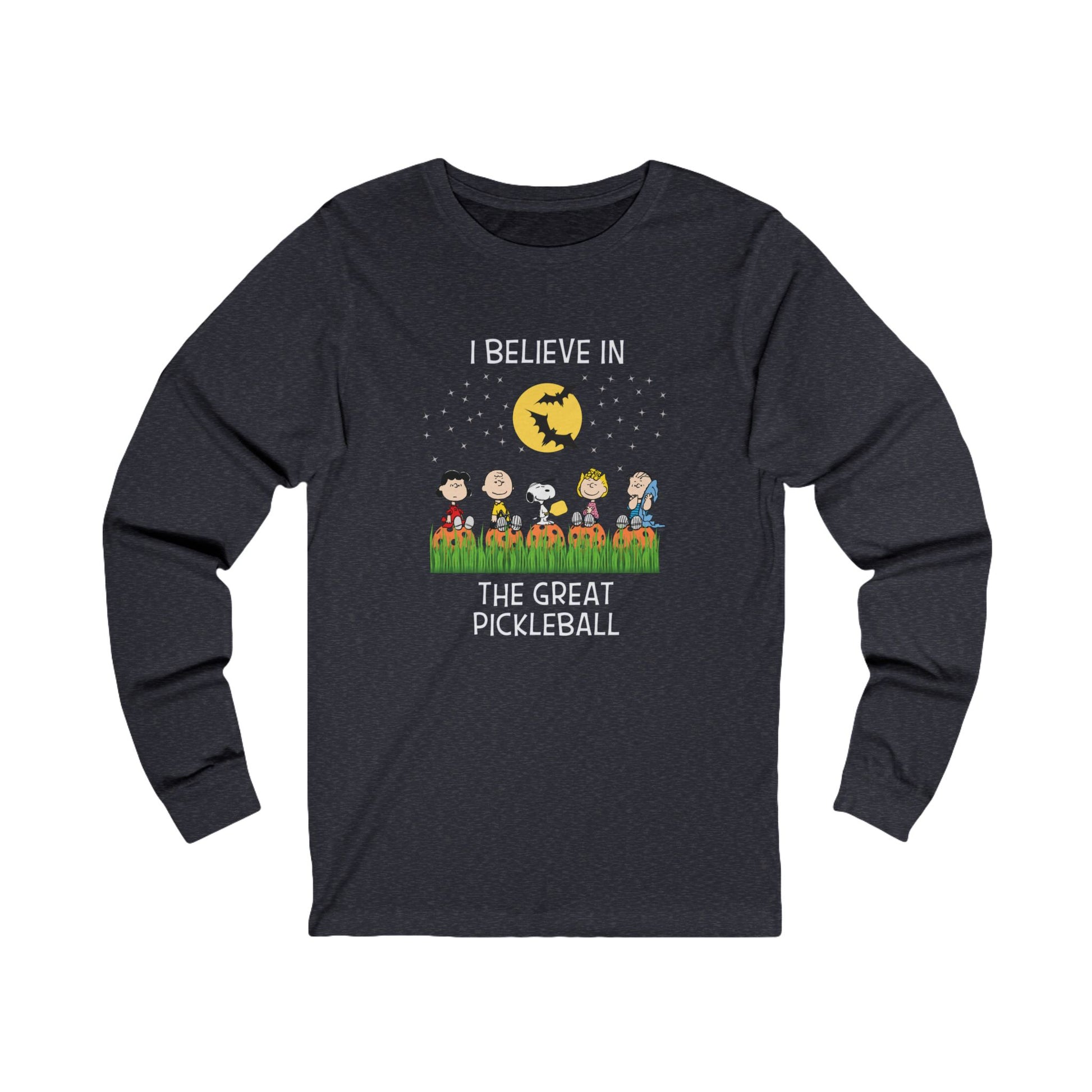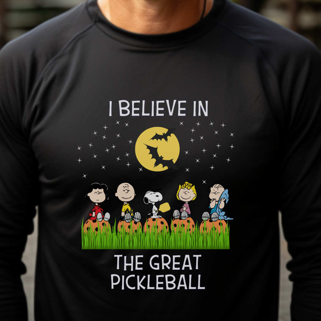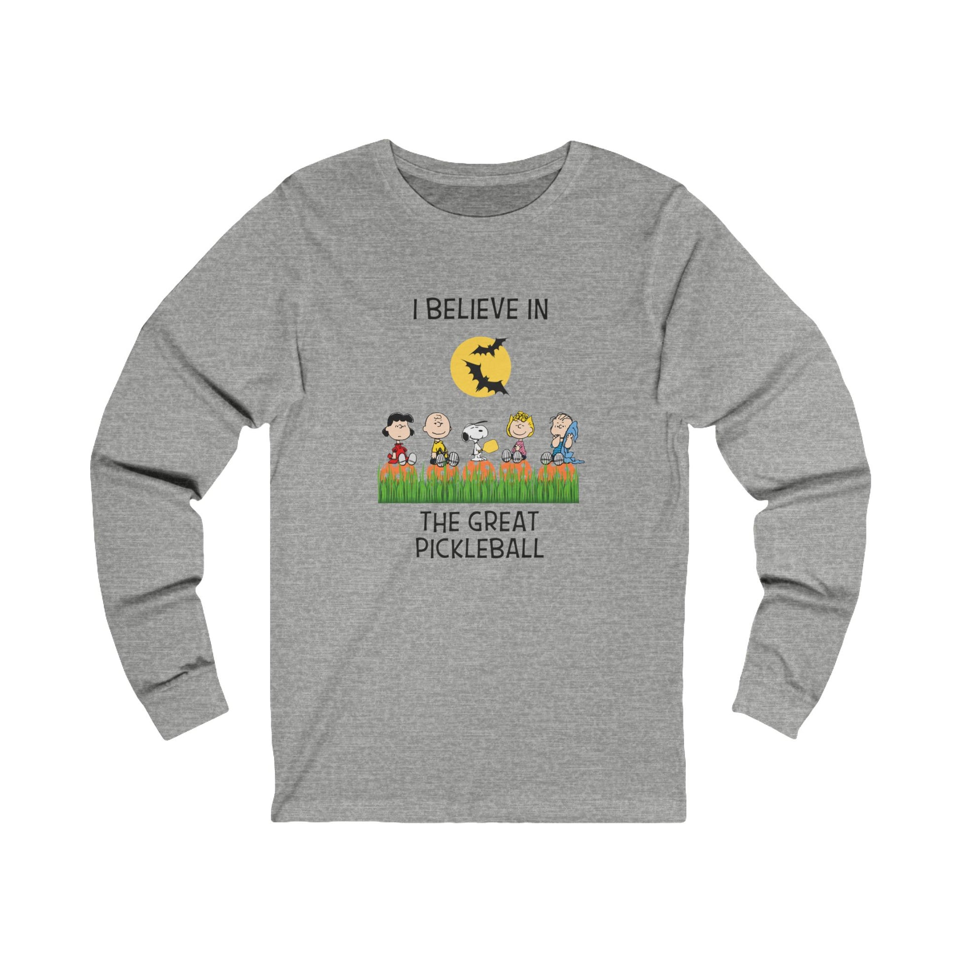 Celebrate Halloween and your love for pickleball with this soft and comfortable long sleeve tee. Featuring the phrase "I Believe In The Great Pickleball" and its very own pickleball patch, this shirt combines your favorite sport with your favorite season.