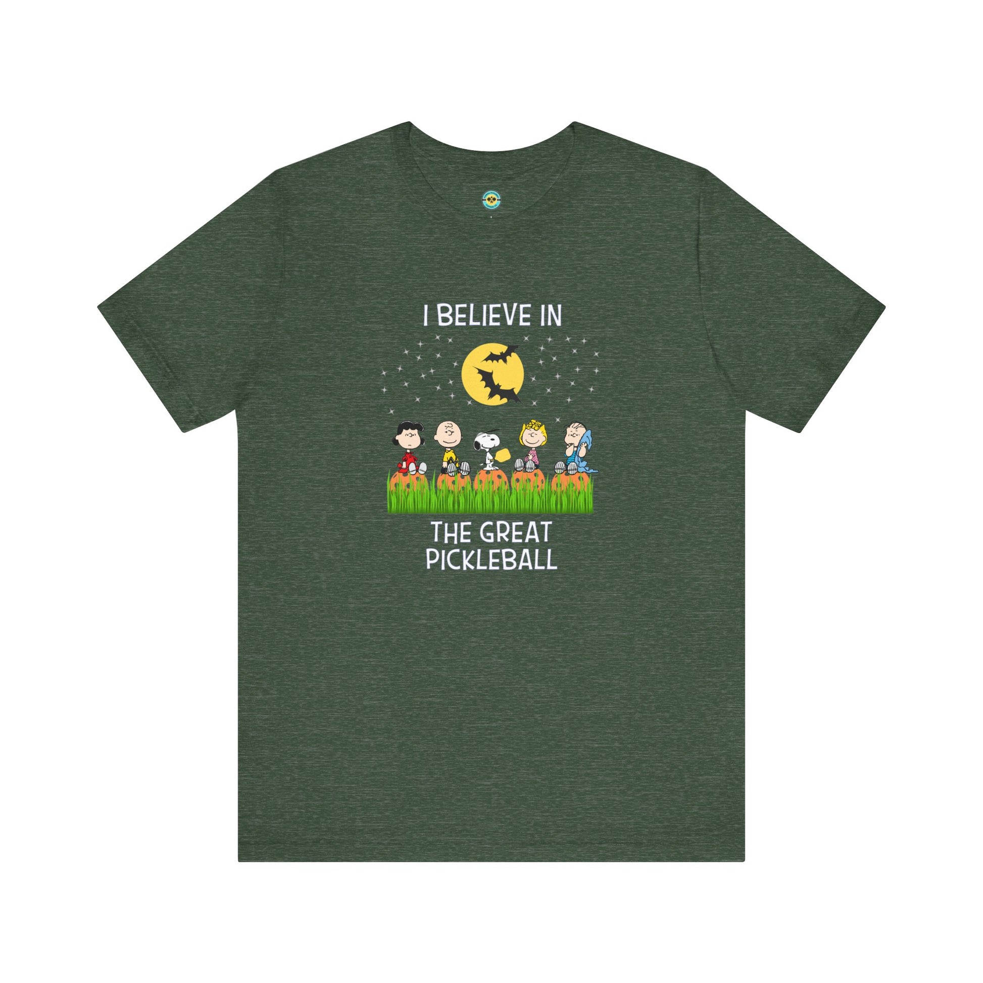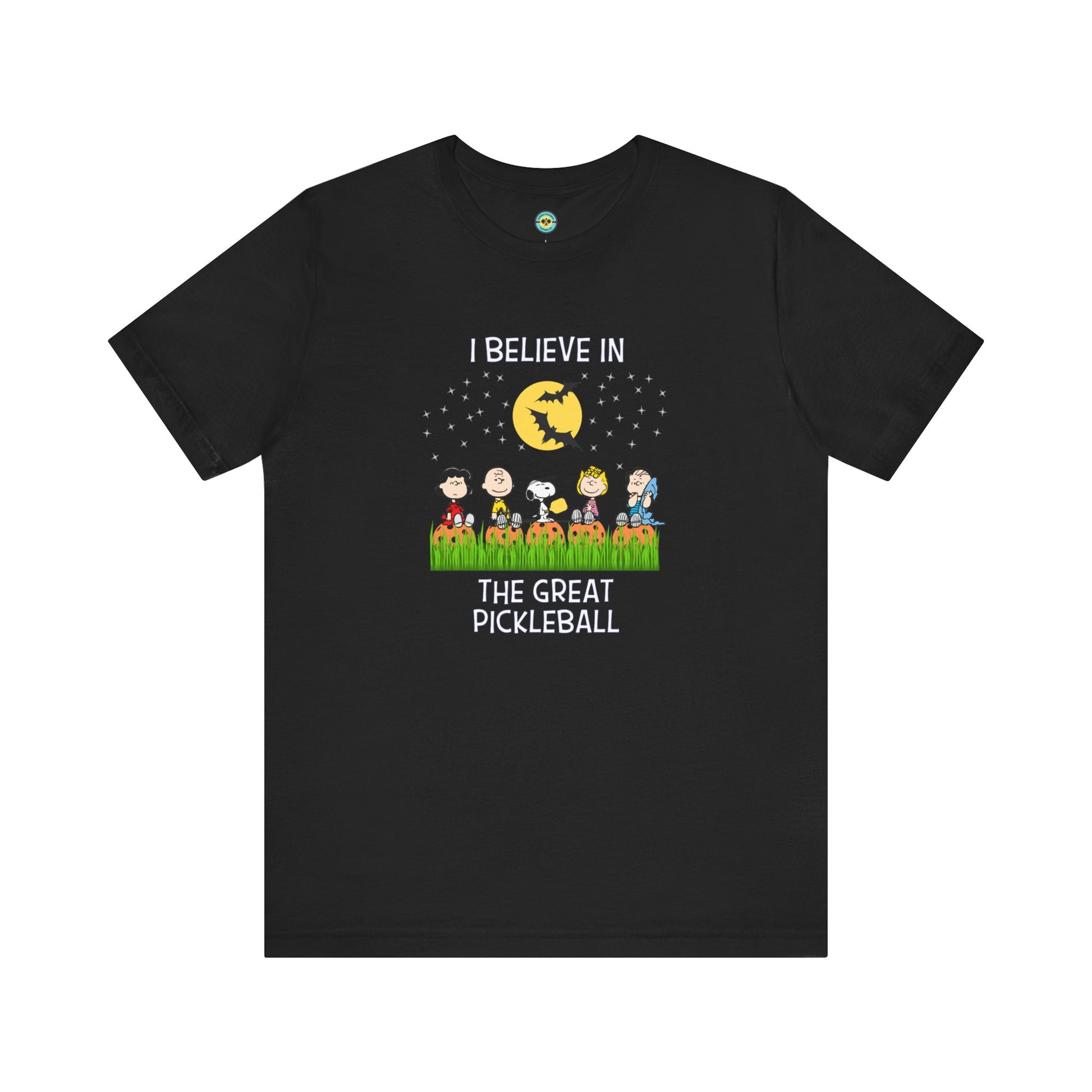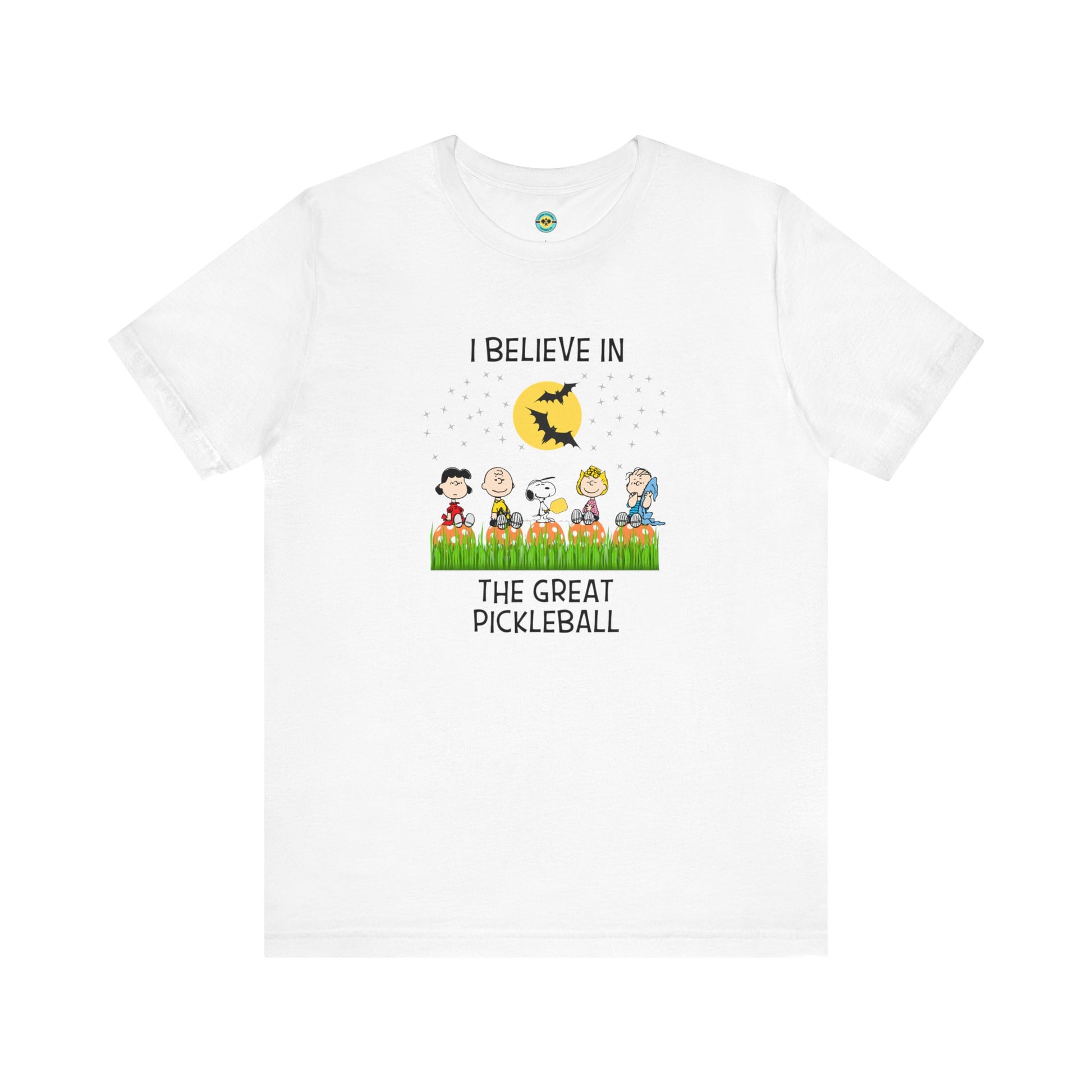 Celebrate Halloween and your love for pickleball with this soft, 100% cotton pickleball tee. Featuring the phrase "I Believe In The Great Pickleball" and its very own pickleball patch, this shirt combines your favorite sport with your favorite season.