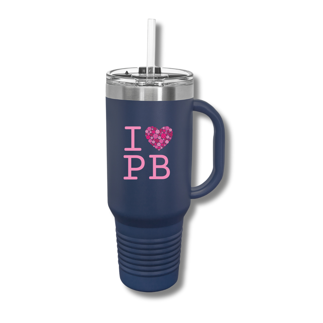 Tired of having to rush to your local store to get the newest trending tumbler? Now you can grab this one instead without missing a dink or volley. Our I Heart Pickleball thermal 40oz. tumbler with handle has the same technology, plus the handle is solid welded steel, AND it's pickleball themed - even better!