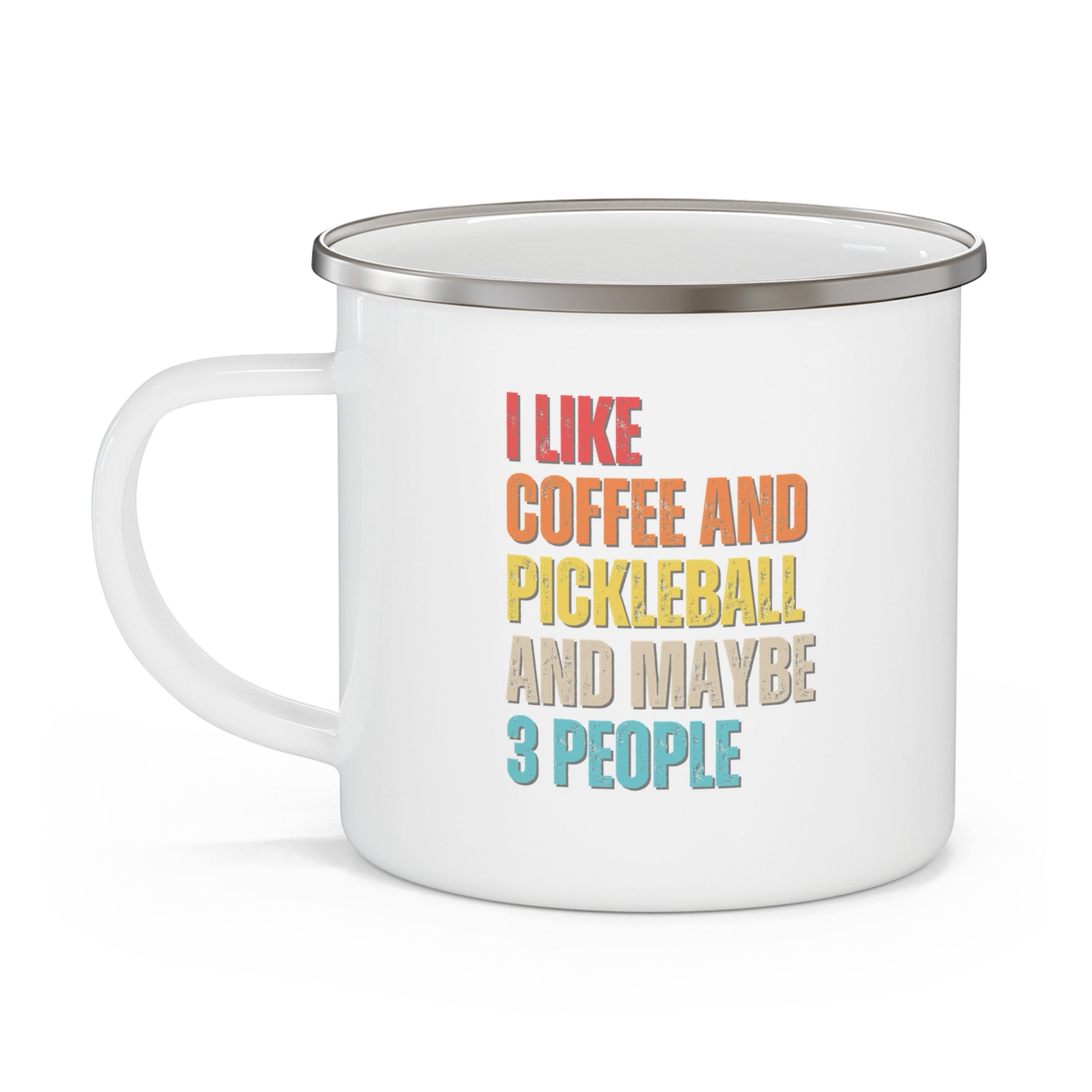The "I Like Coffee And Pickleball And Maybe 3 People" 12oz enamel mug is ideal for players who thrive on caffeine and court time, and like to keep their social circle small but strong.