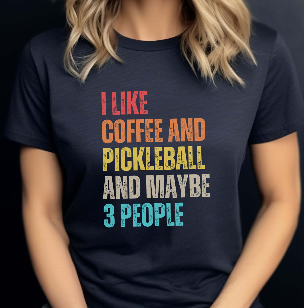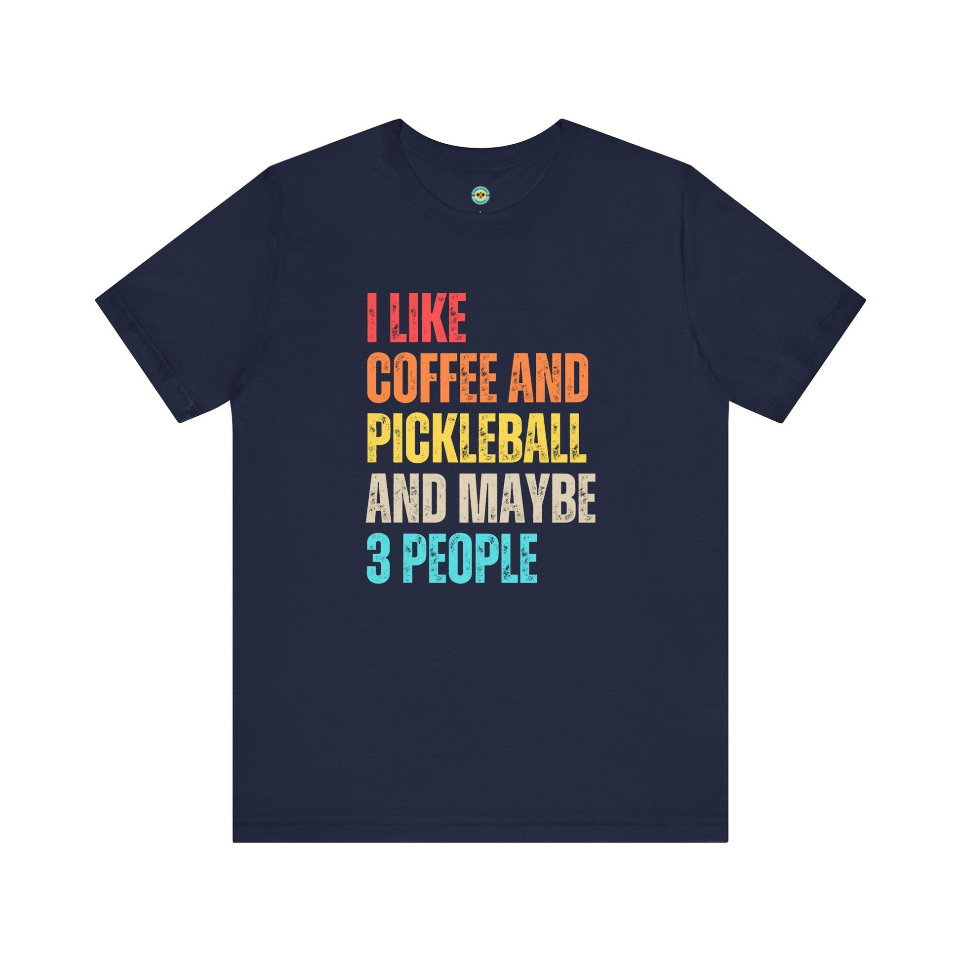 Embrace your introverted side with our colorful "I Like Coffee And Pickleball And Maybe 3 People" tee. Ideal for players who thrive on caffeine and court time, and like to keep their social circle small but strong.