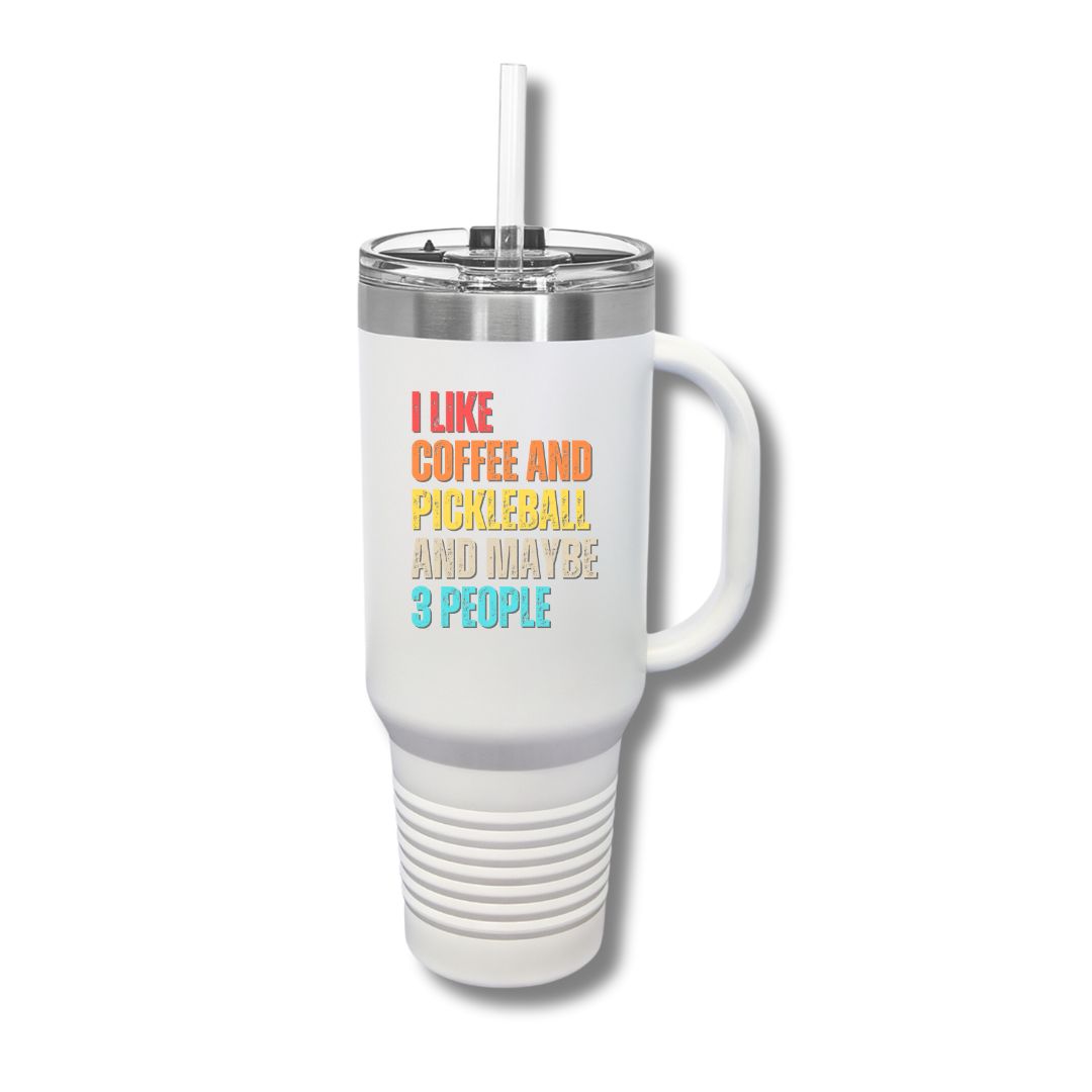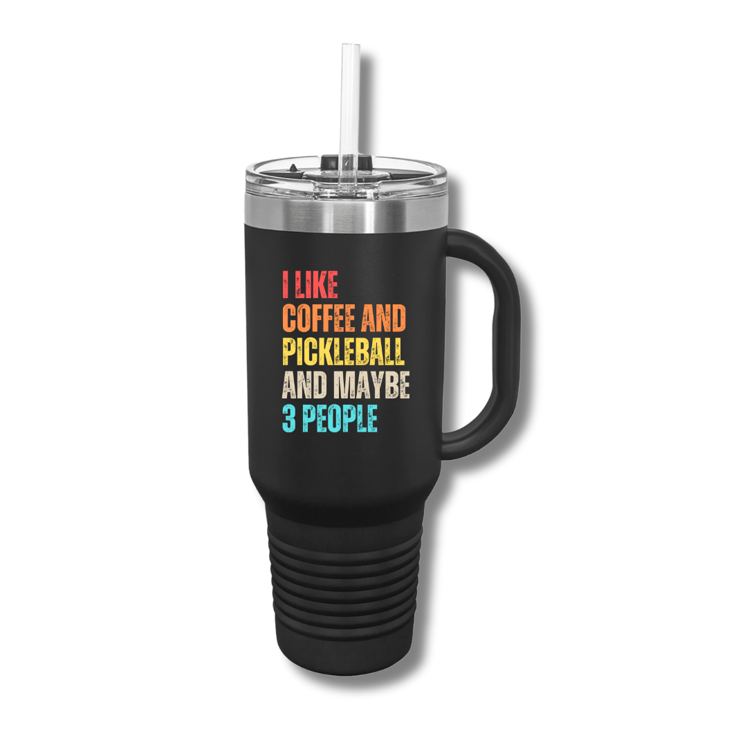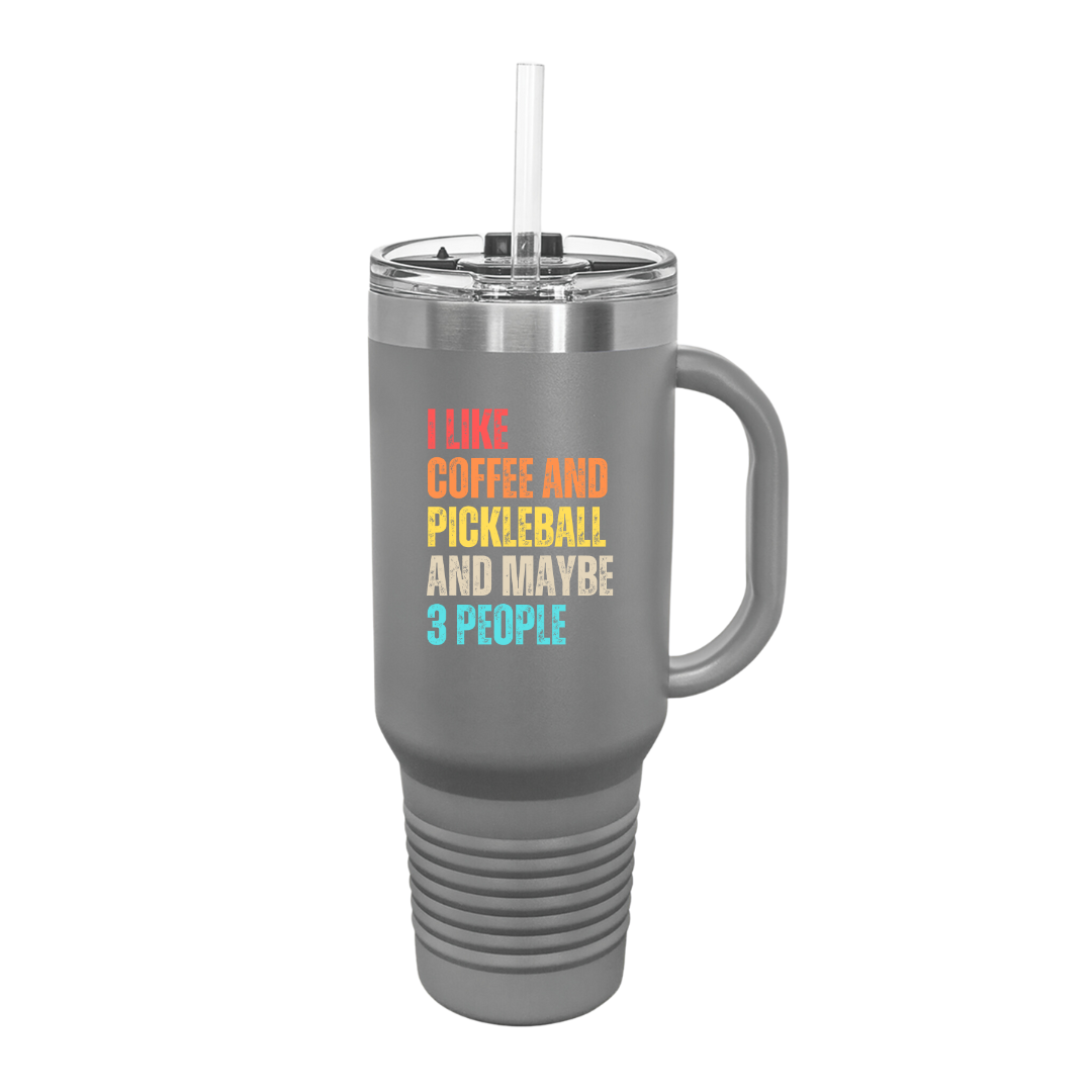 Our "I Like Coffee And Pickleball And Maybe 3 People" tumbler is ideal for players who thrive on caffeine and court time, and like to keep their social circle small but strong. This 40oz. tumbler with handle has the same technology as the trending tumbler, plus the handle is solid welded steel, AND it's pickleball themed - even better!