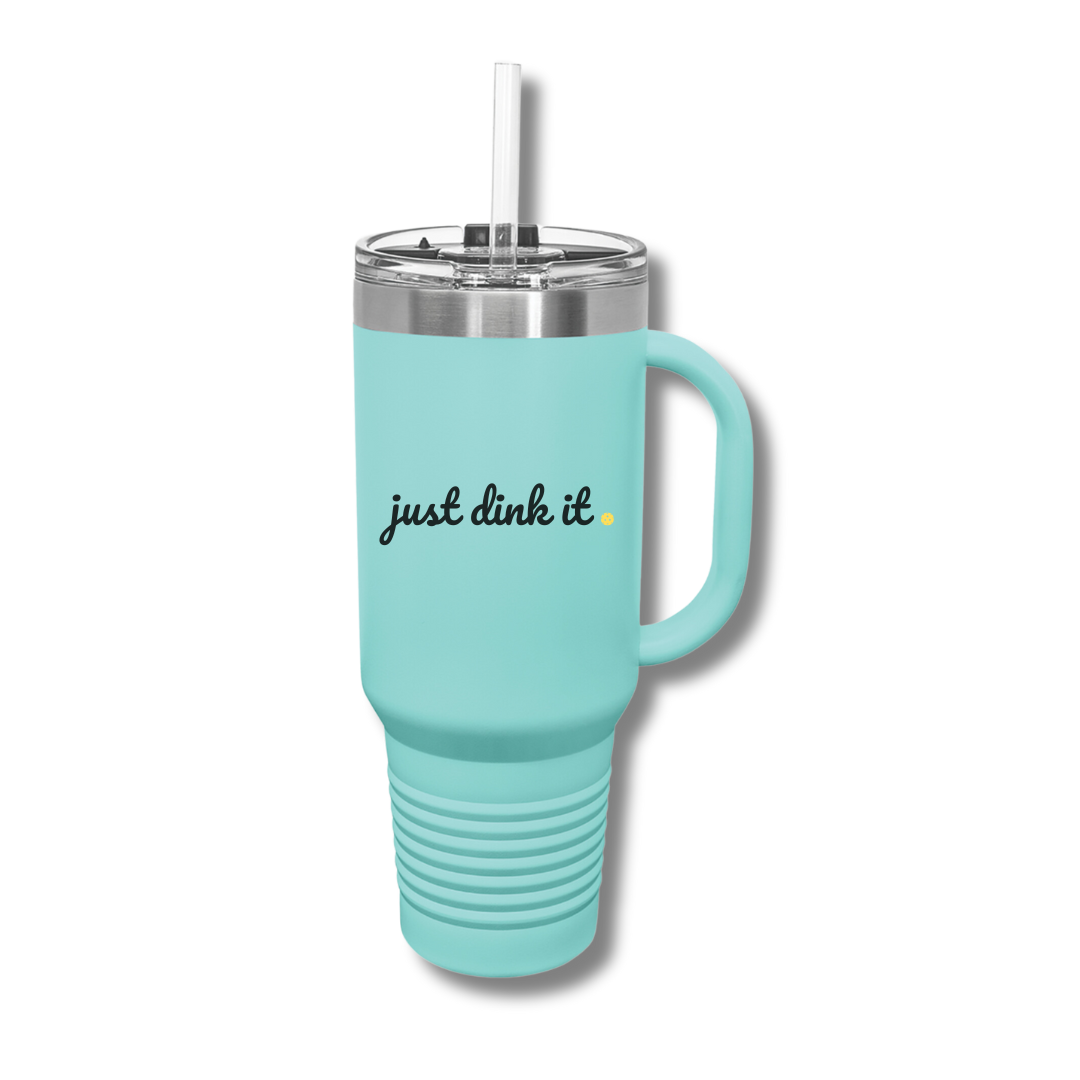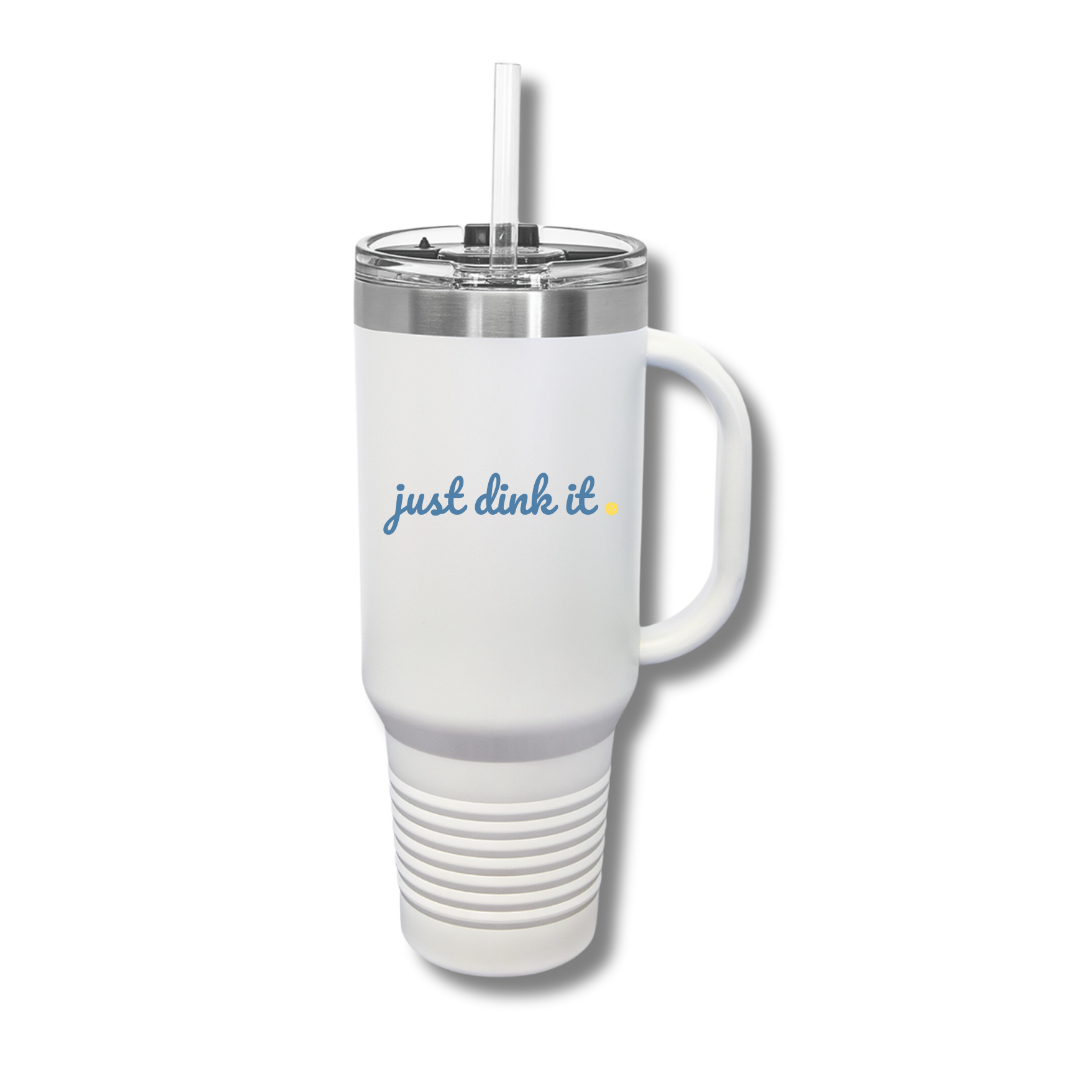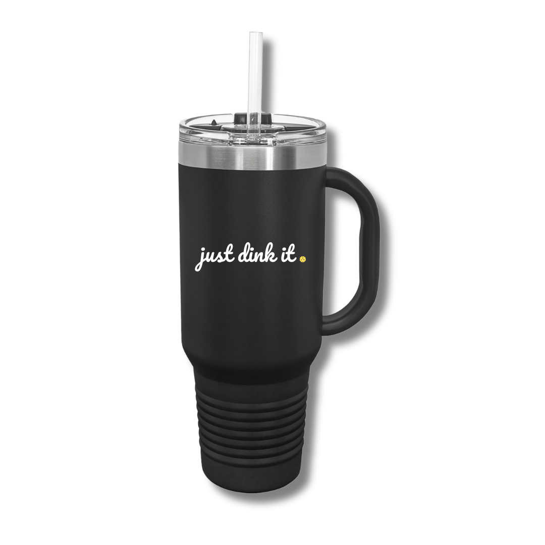 Tired of having to rush to your local store to get the newest trending tumbler? Now you can grab this one instead without missing a dink or a volley. Our Just Dink It thermal 40oz. tumbler with handle has the same technology, plus the handle is solid welded steel, AND it's pickleball themed - even better!