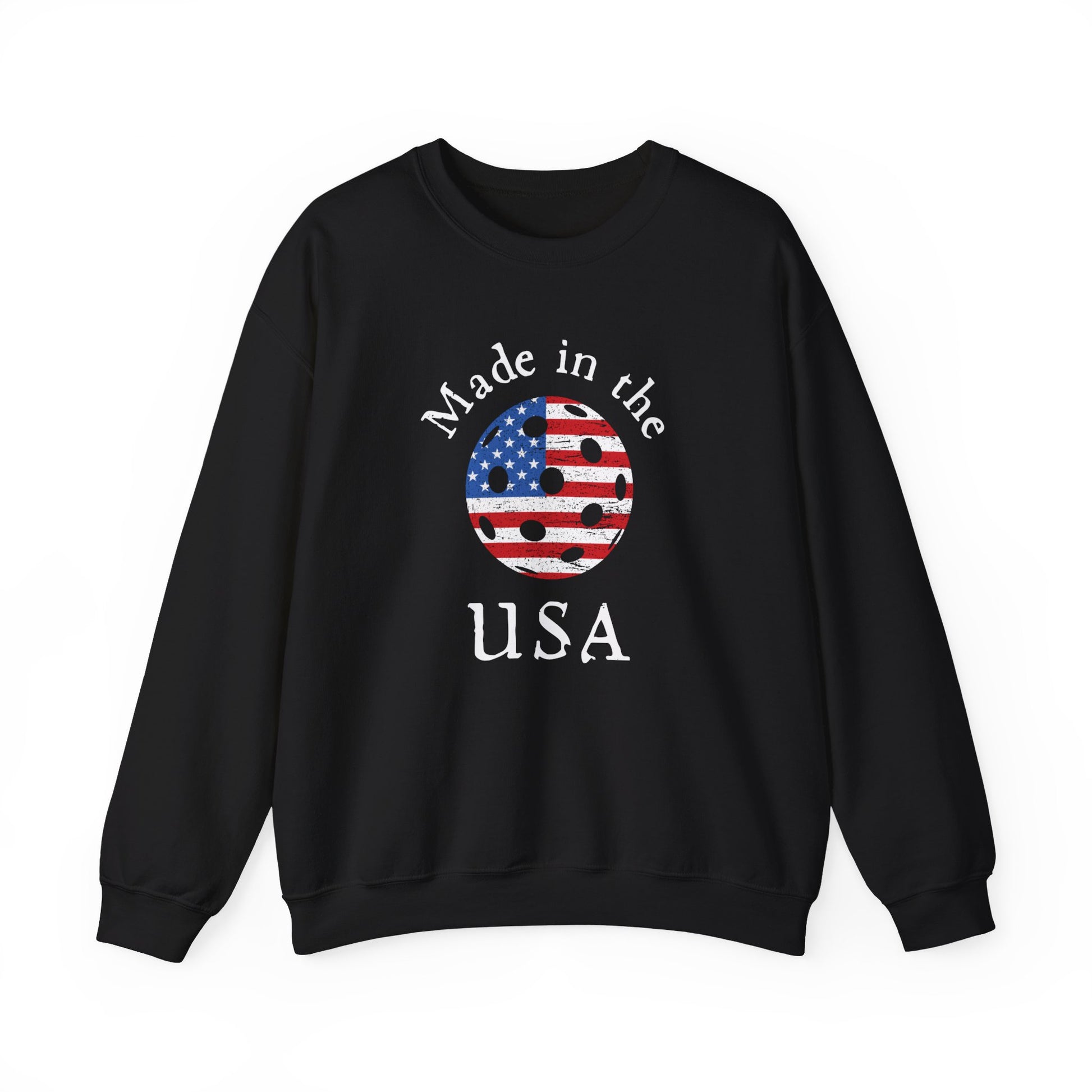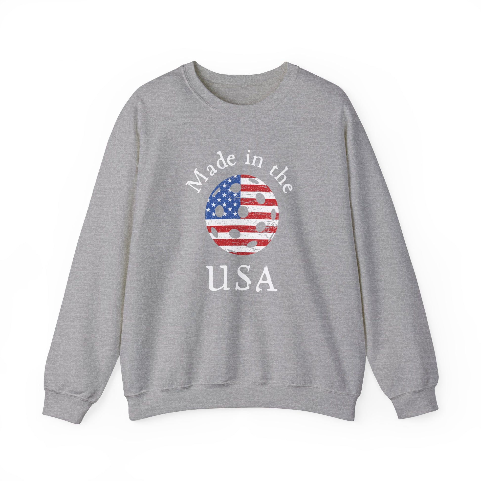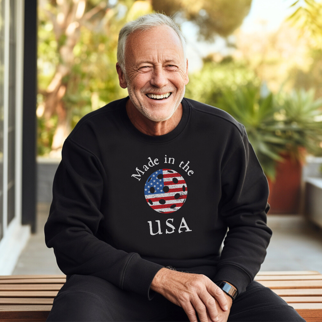 Let everyone know that pickleball is as American as apple pie! Show your pickleball pride with a patriotic twist in our "Made in the USA" pickleball sweatshirt, featuring a custom designed stars and stripes pickleball. It's your perfect go-to for celebrating the game and the USA in style.