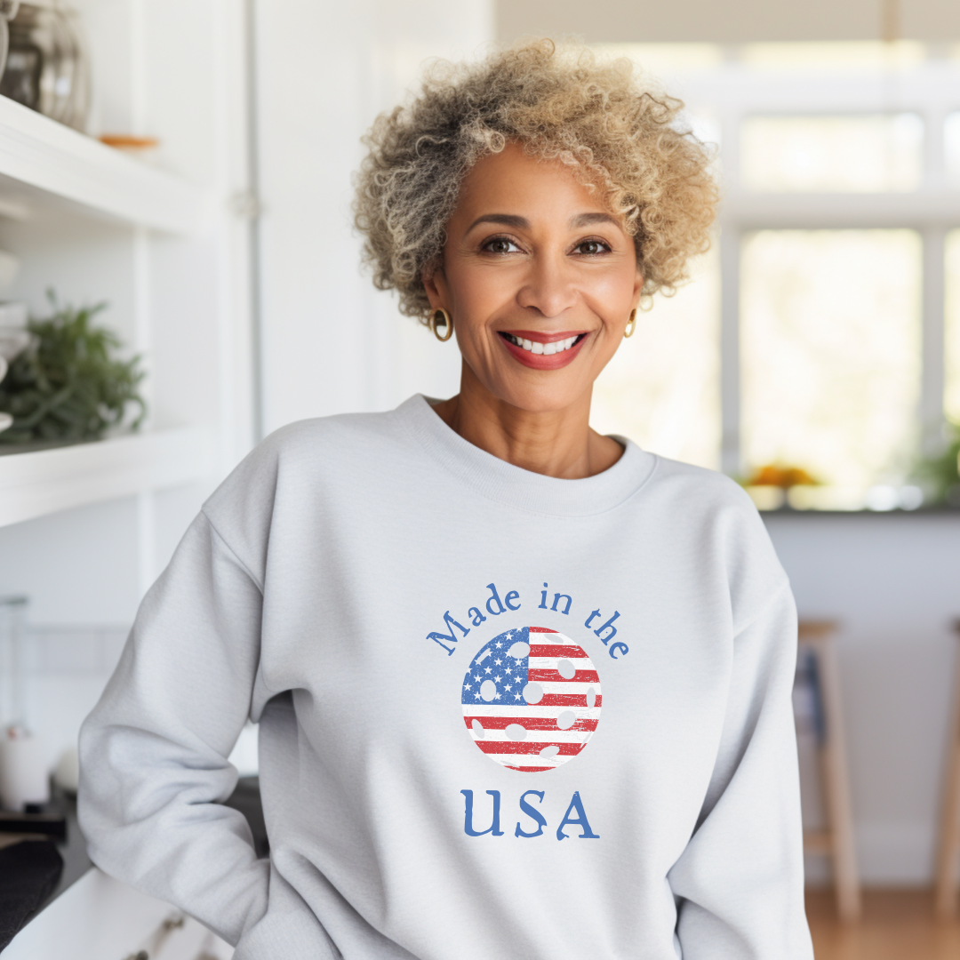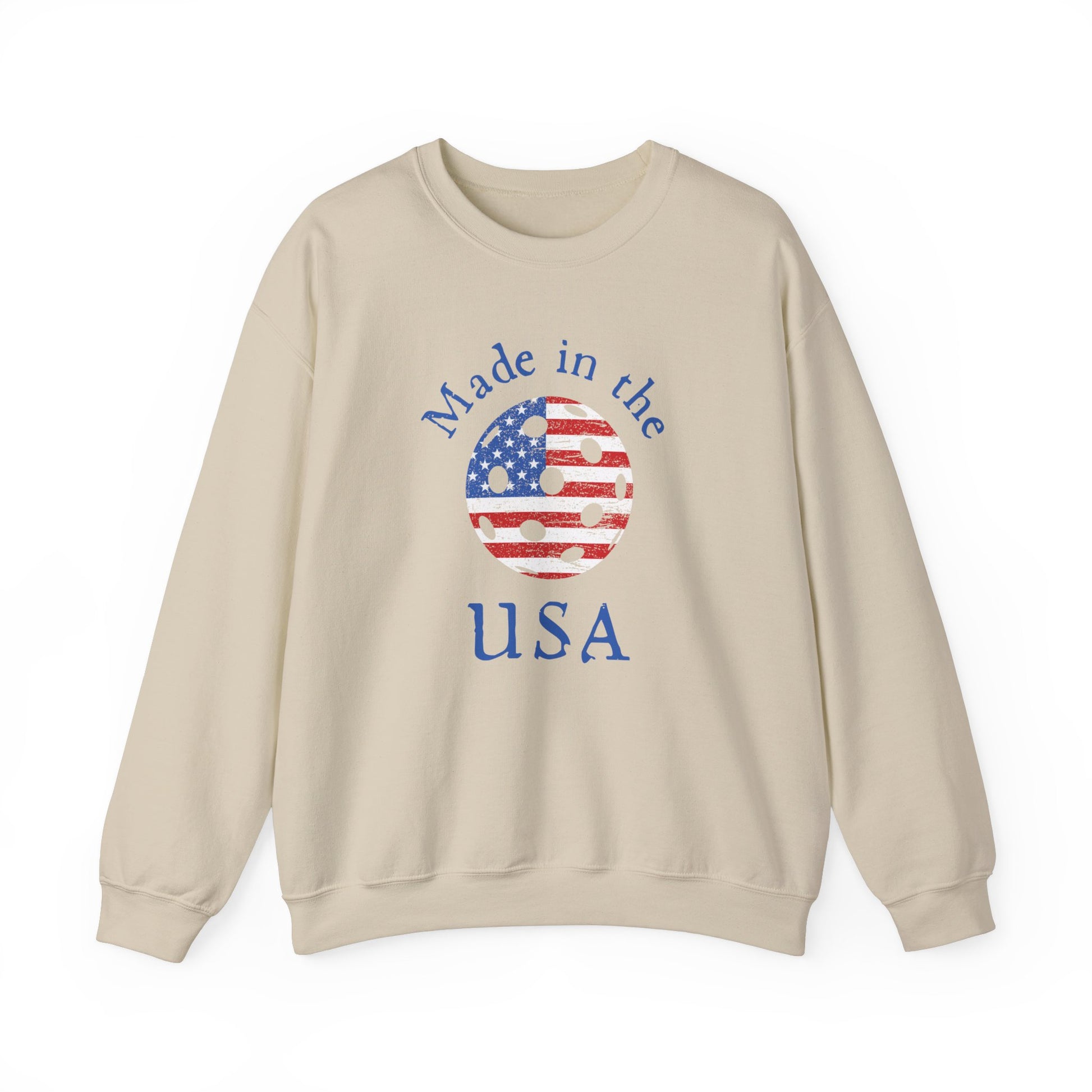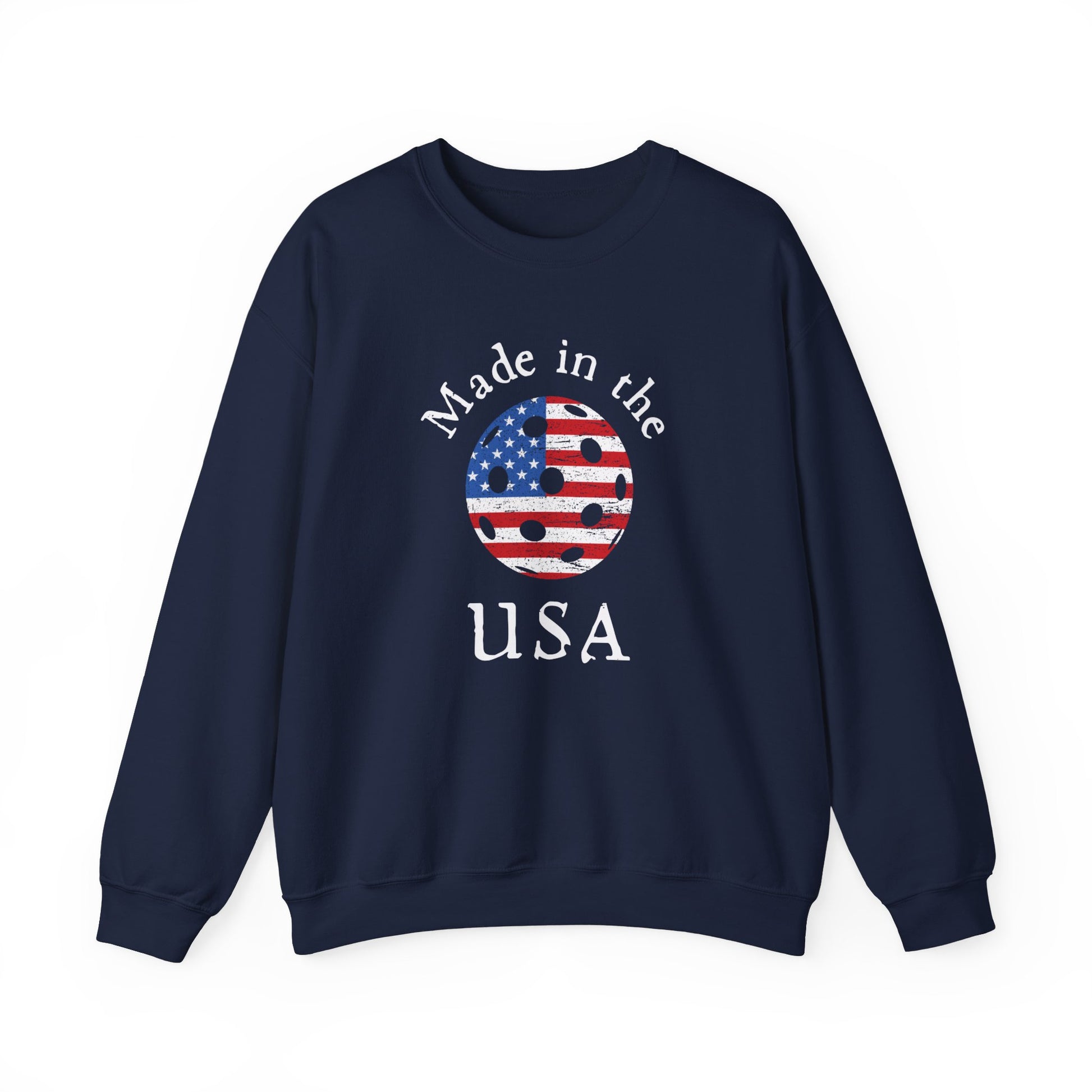 Let everyone know that pickleball is as American as apple pie! Show your pickleball pride with a patriotic twist in our "Made in the USA" pickleball sweatshirt, featuring a custom designed stars and stripes pickleball. It's your perfect go-to for celebrating the game and the USA in style.