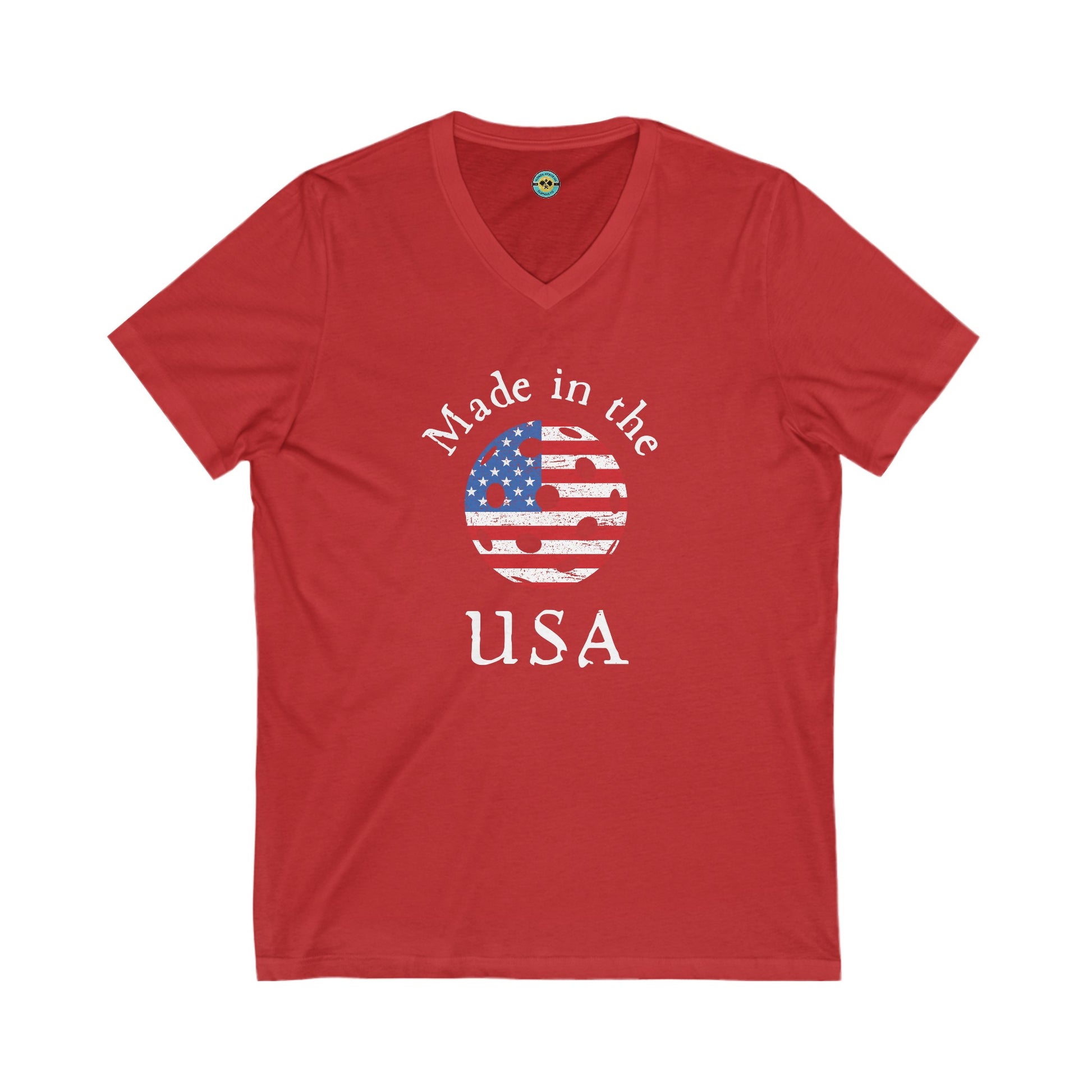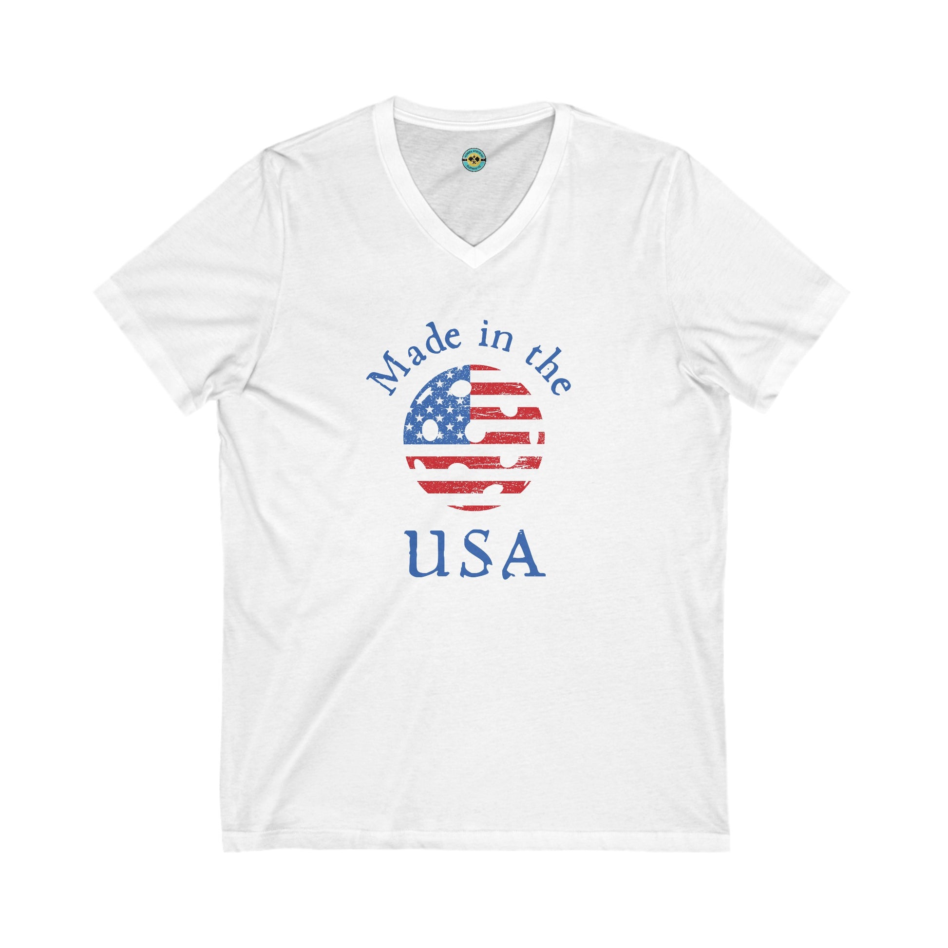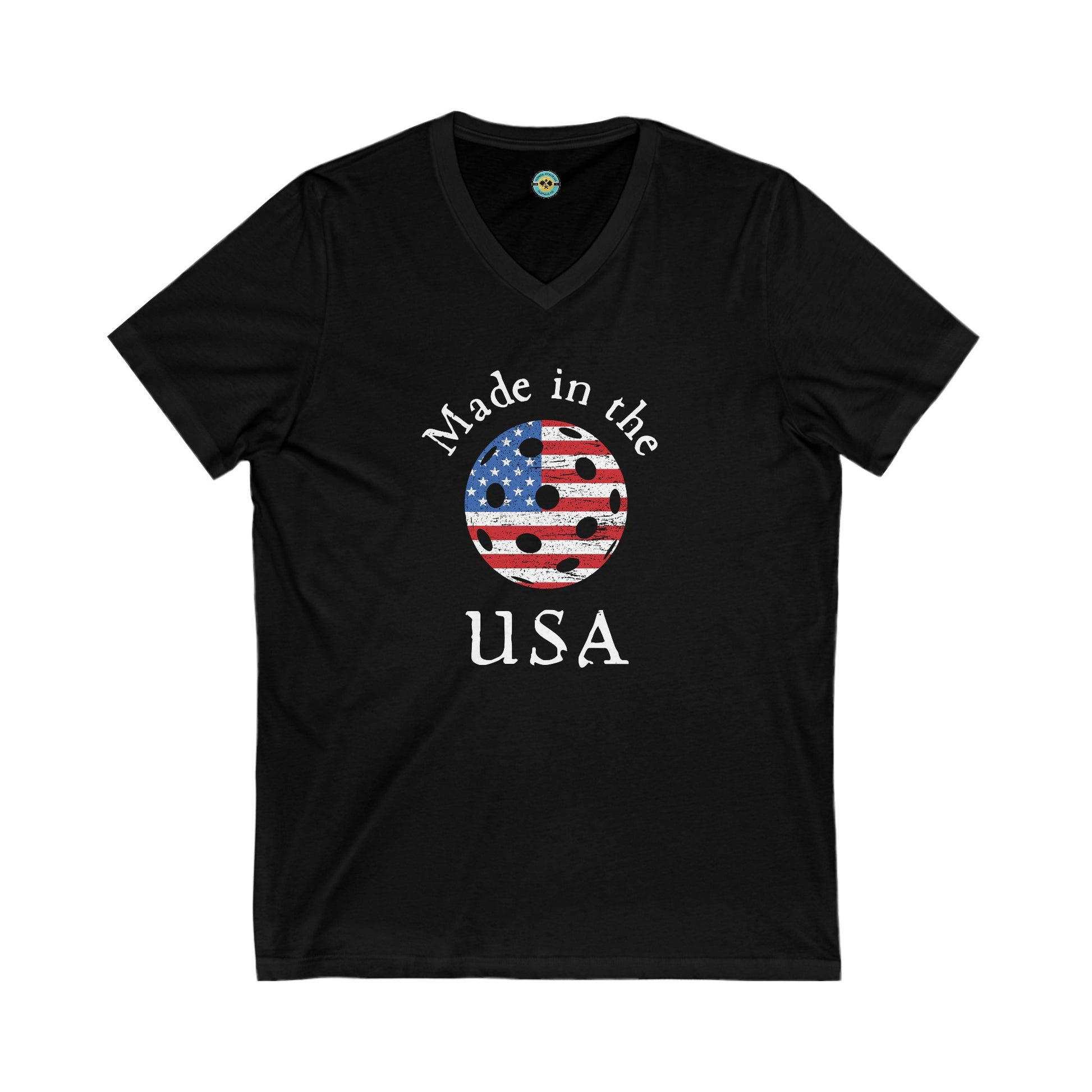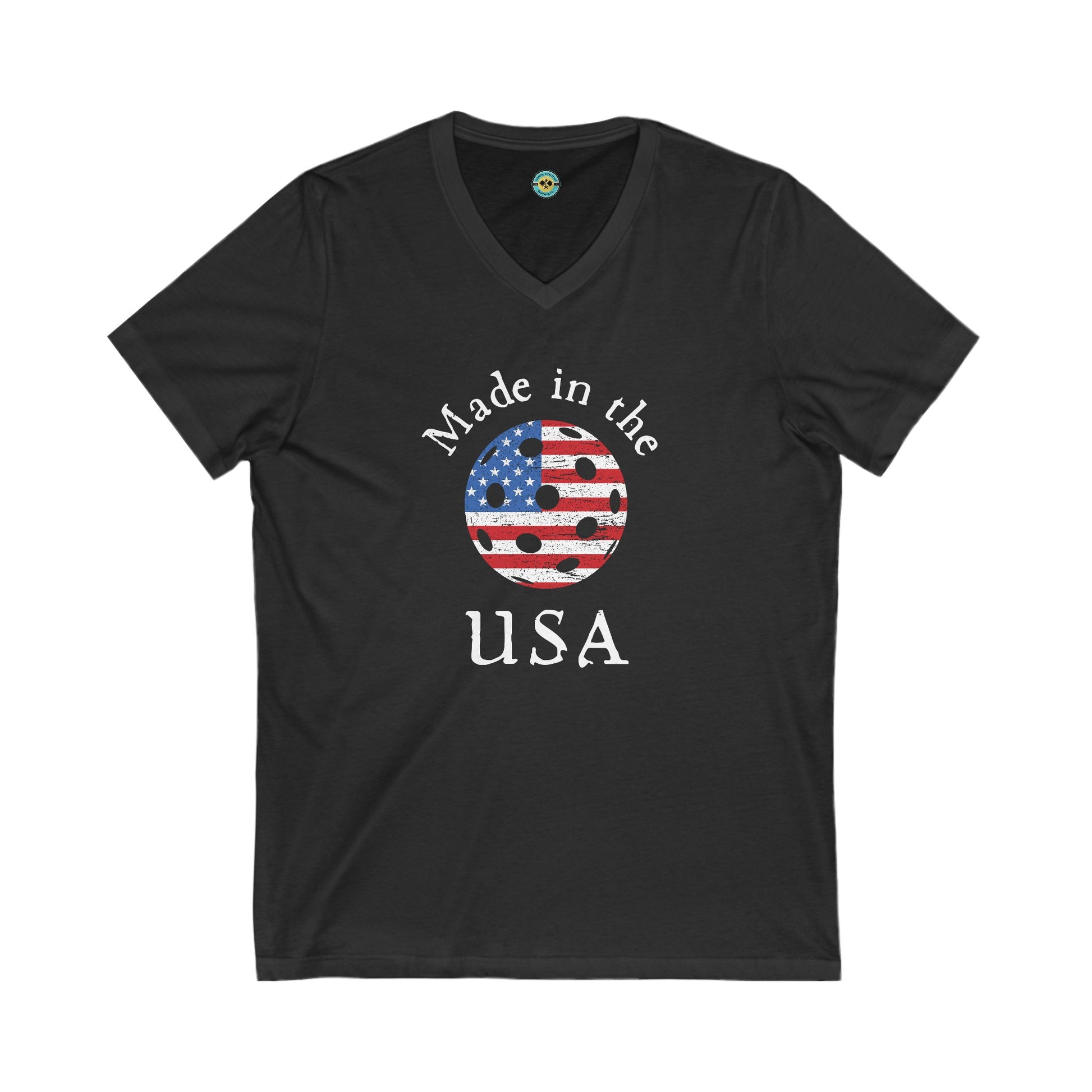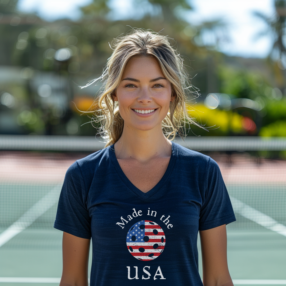 Let everyone know that pickleball is as American as apple pie! Show your pickleball pride with a patriotic twist in our "Made in the USA" pickleball v-neck tee, featuring a custom designed stars and stripes pickleball. It's your perfect go-to for celebrating the game and the USA in style.