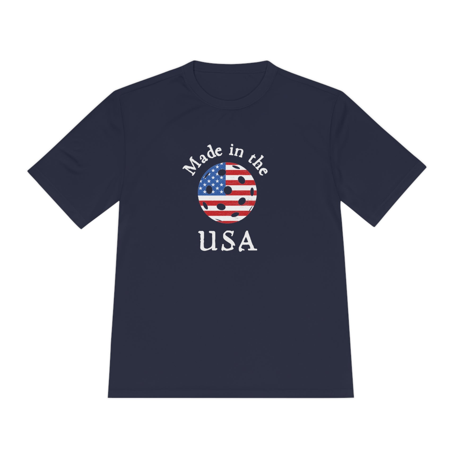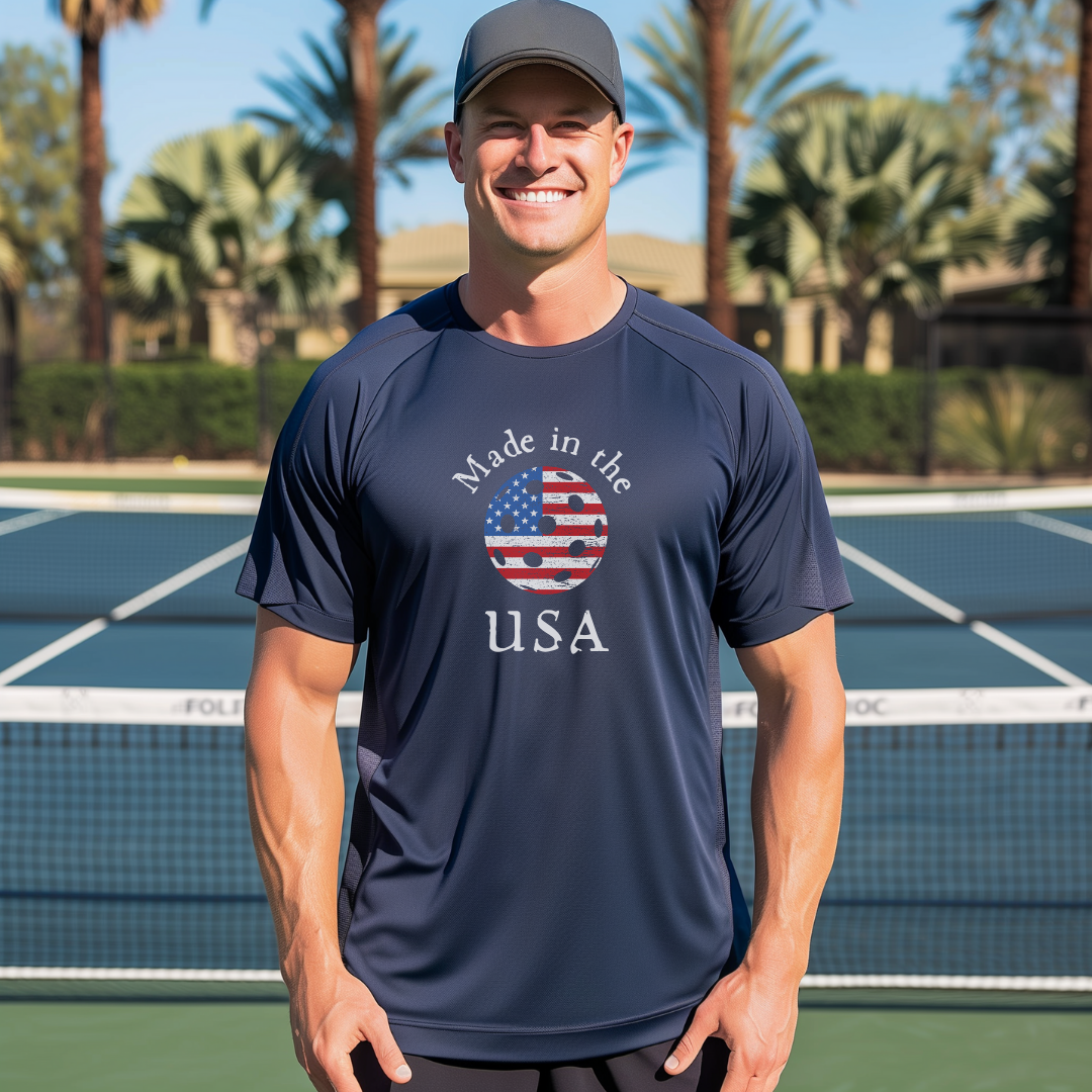 Let everyone know that pickleball is as American as apple pie! Show your pickleball pride with a patriotic twist in our "Made in the USA" moisture-wicking pickleball performance tee, featuring a custom designed stars and stripes pickleball. It's your perfect go-to for celebrating the game and the USA in style.