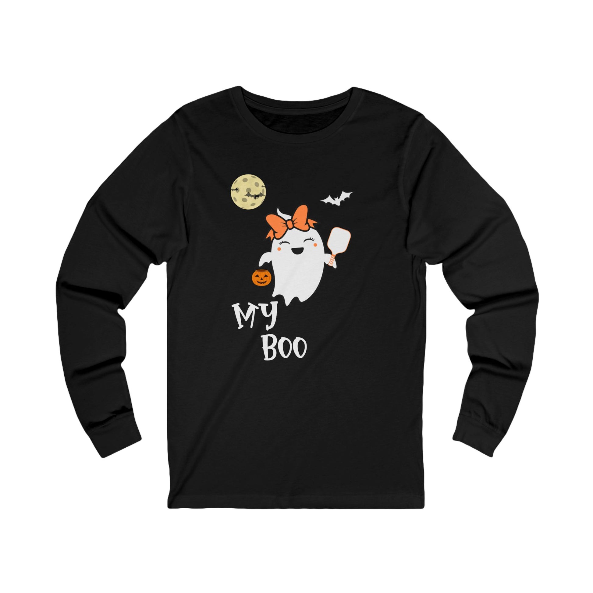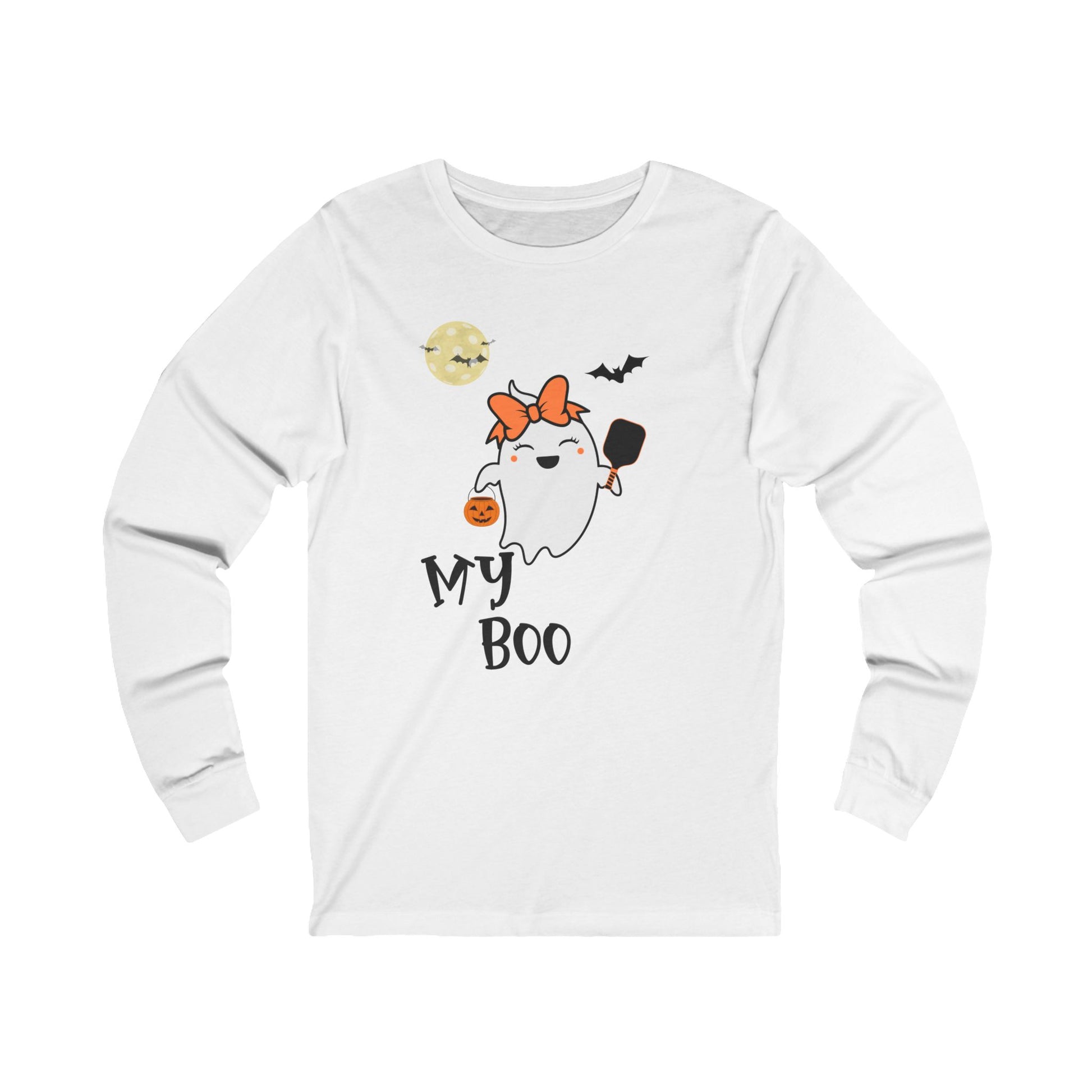The "My Boo" Halloween pickleball long sleeve t-shirt features an adorable female ghost holding a pickleball paddle. This shirt is the perfect blend of spooky and sporty, making it a must-have for any pickleball players looking to add some Halloween flair to the court. Get ready to serve up some scares and smiles with this cute and festive tee!