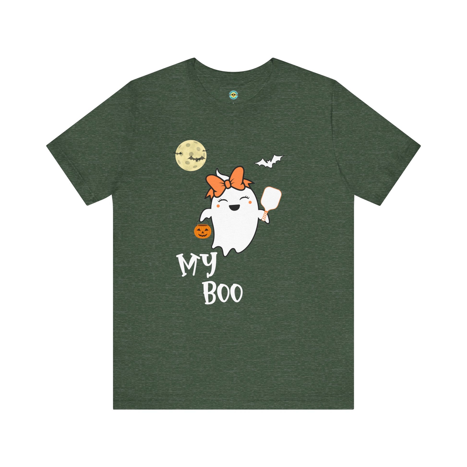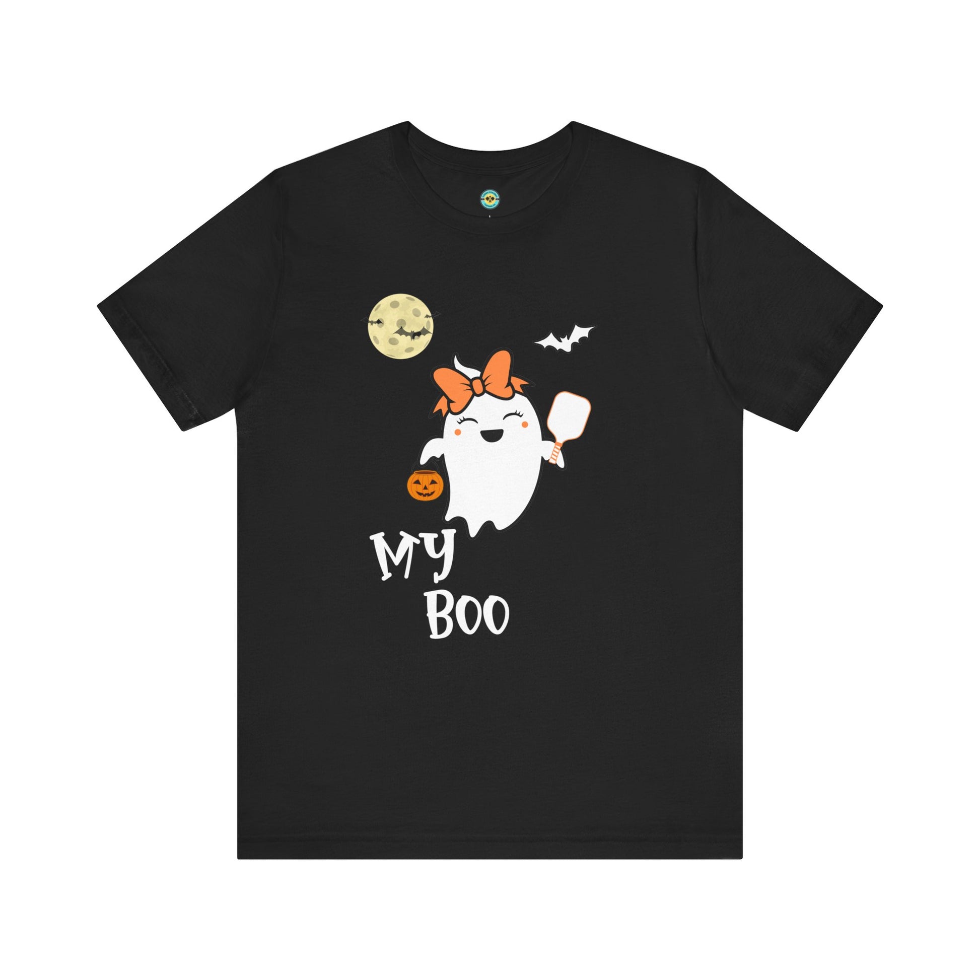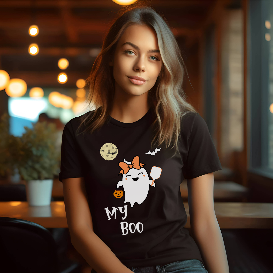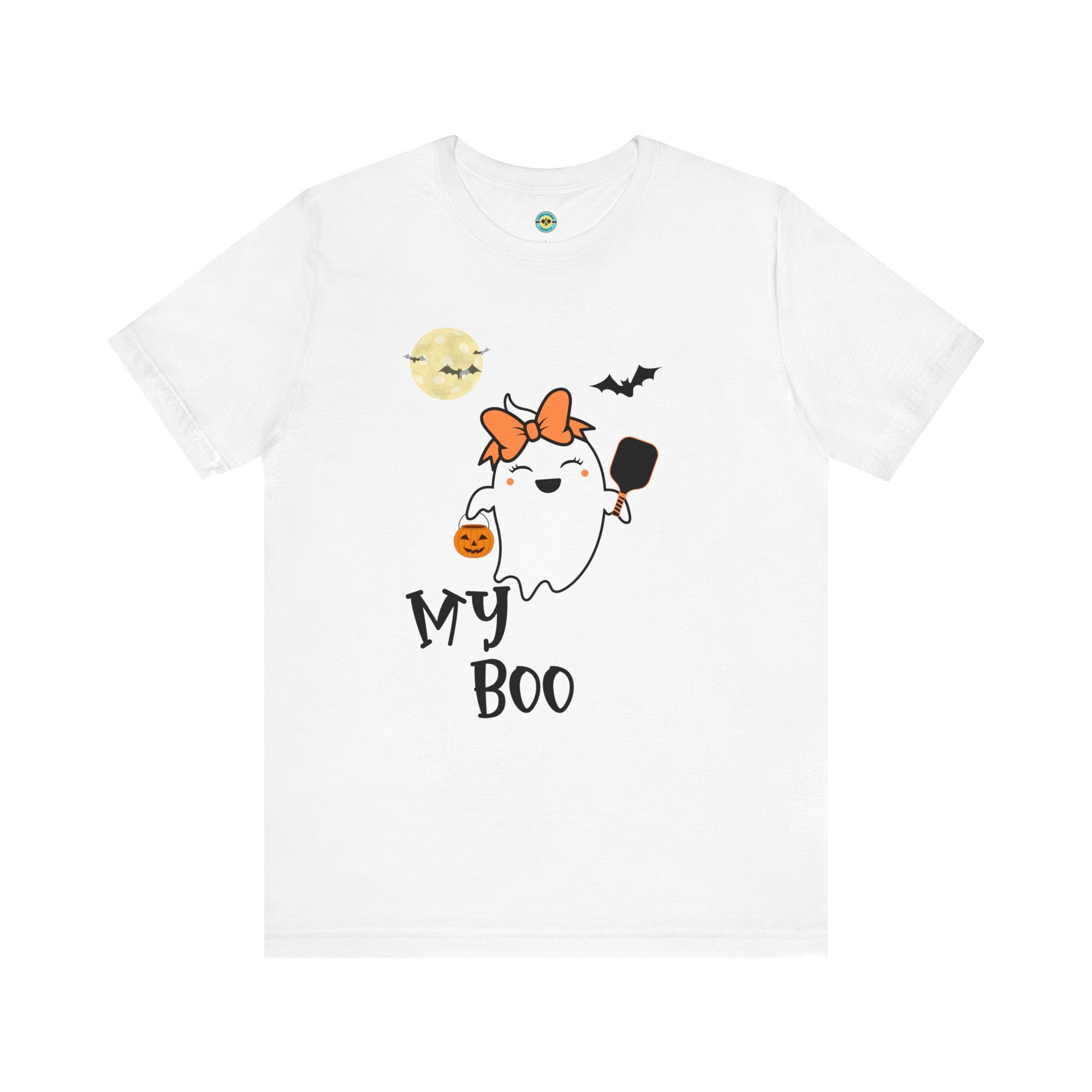 The "My Boo" Halloween pickleball t-shirt features an adorable female ghost holding a pickleball paddle. This comfy tee is the perfect blend of spooky and sporty, making it a must-have for any pickleball players looking to add some Halloween flair to the court. Get ready to serve up some scares and smiles with this cute and festive tee!