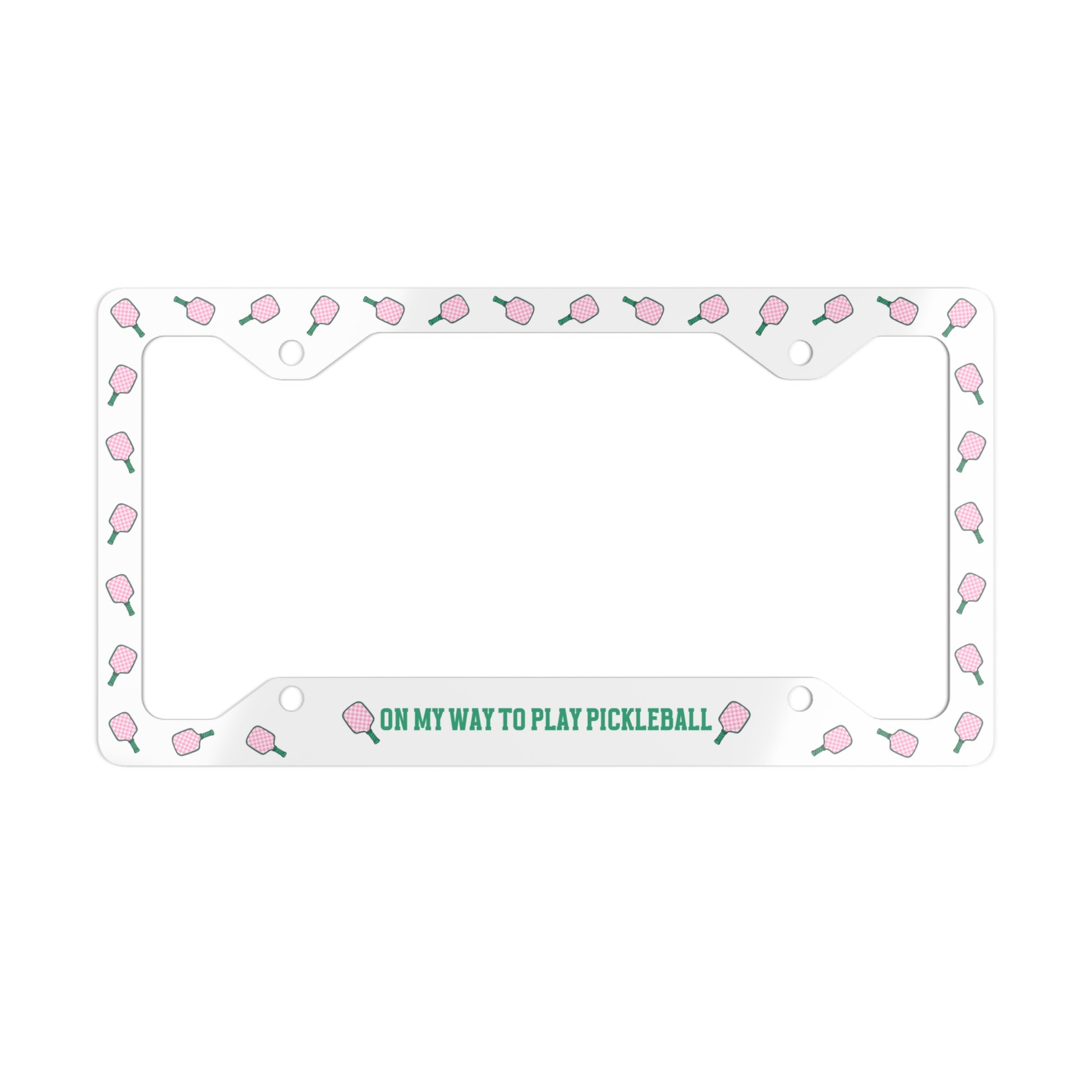 This charming pickleball license plate frame features pink and green paddles with the words "On My Way To Play Pickleball". It's the perfect accessory for any vehicle!