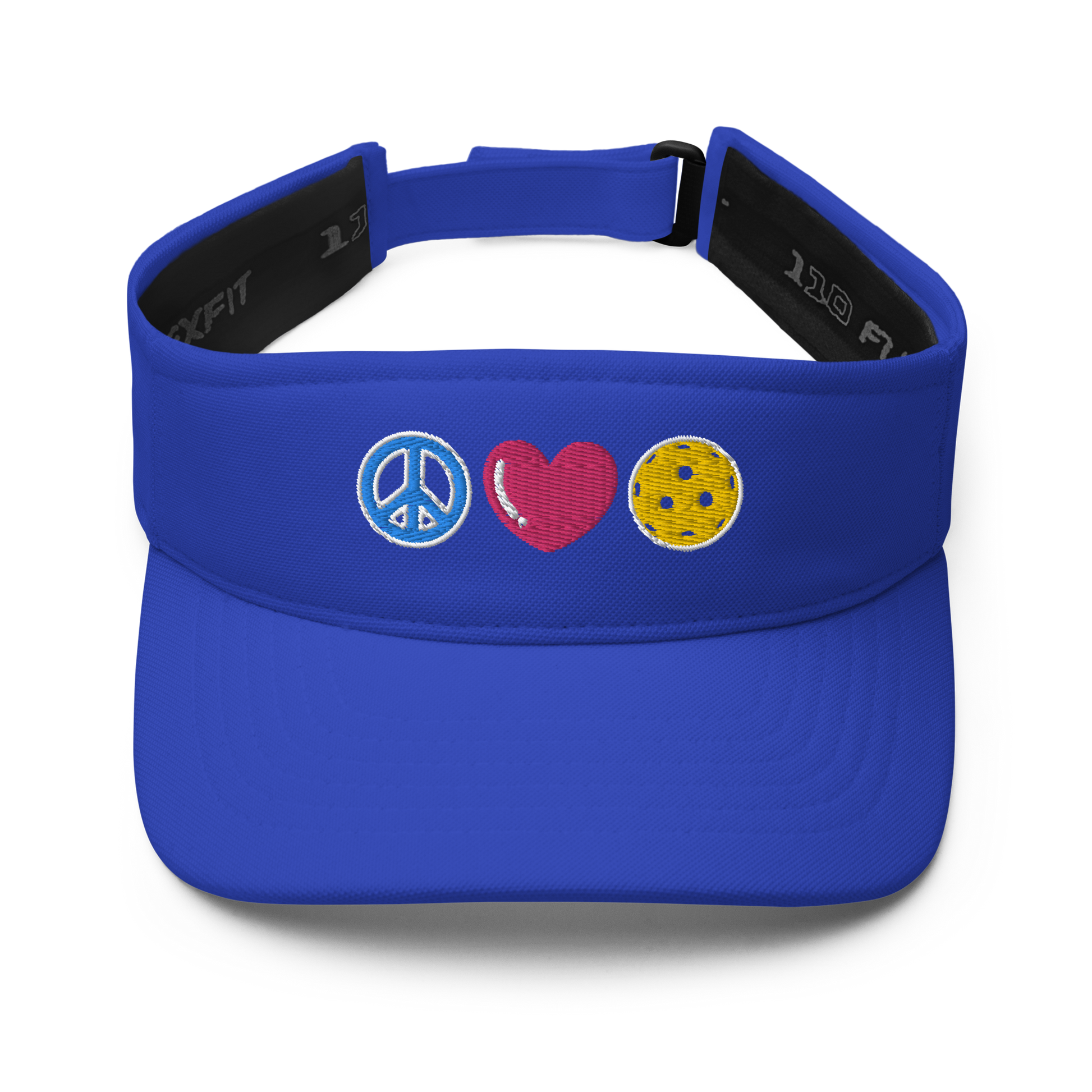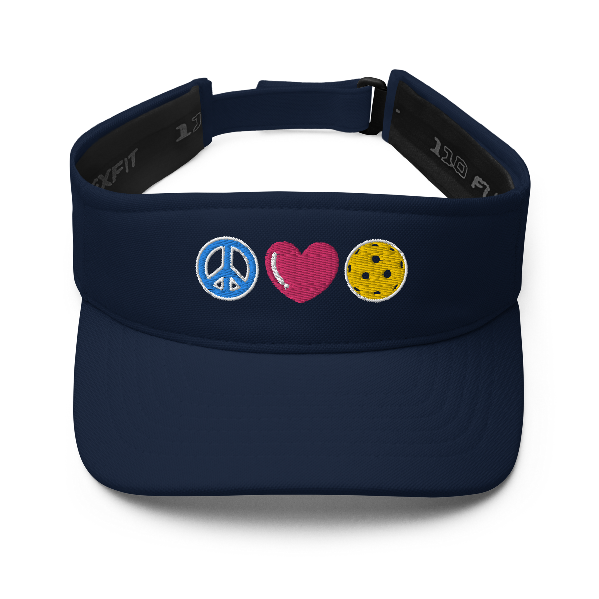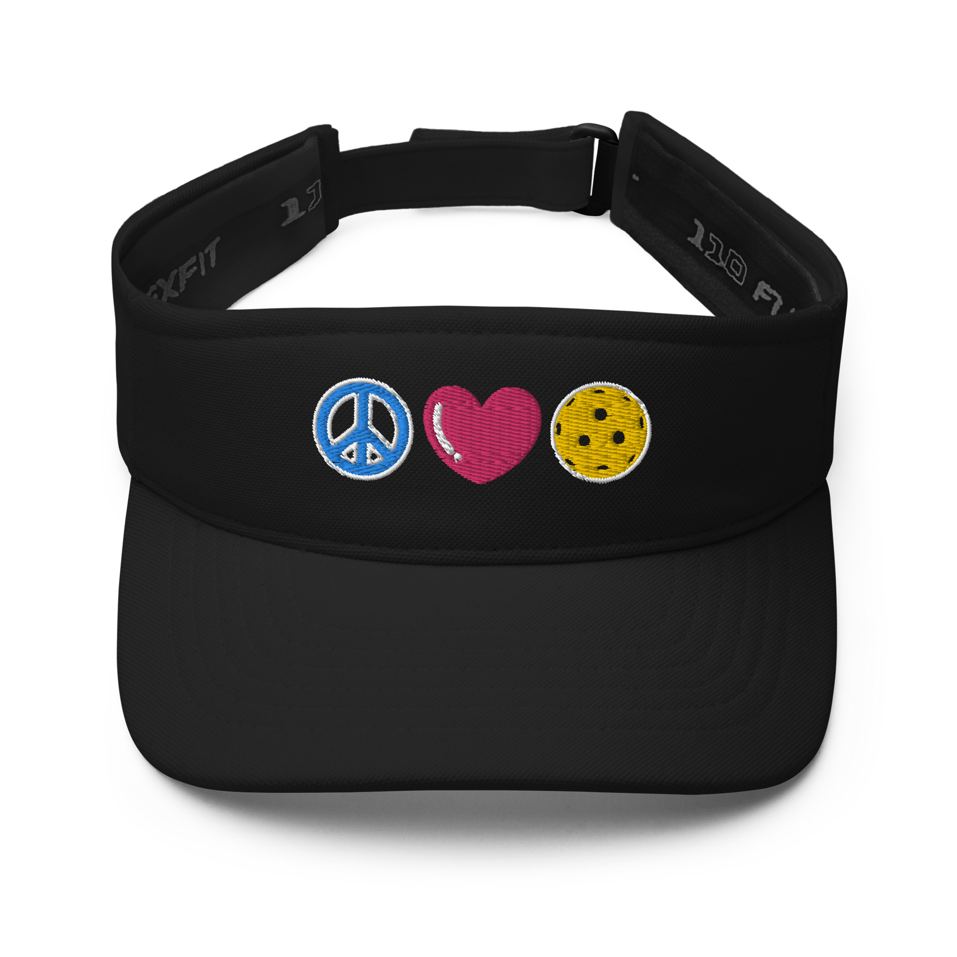 The peace, love, and pickleball symbols signify the power of coming together and celebrating our friends, family, and our shared love of pickleball. Spread the positivity with our "Peace Love Pickleball" visor featuring these iconic symbols.