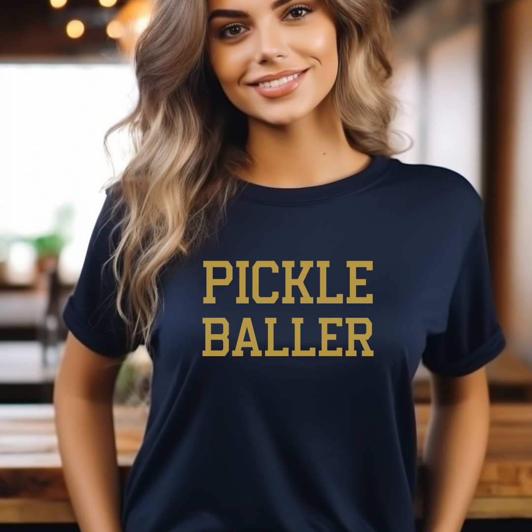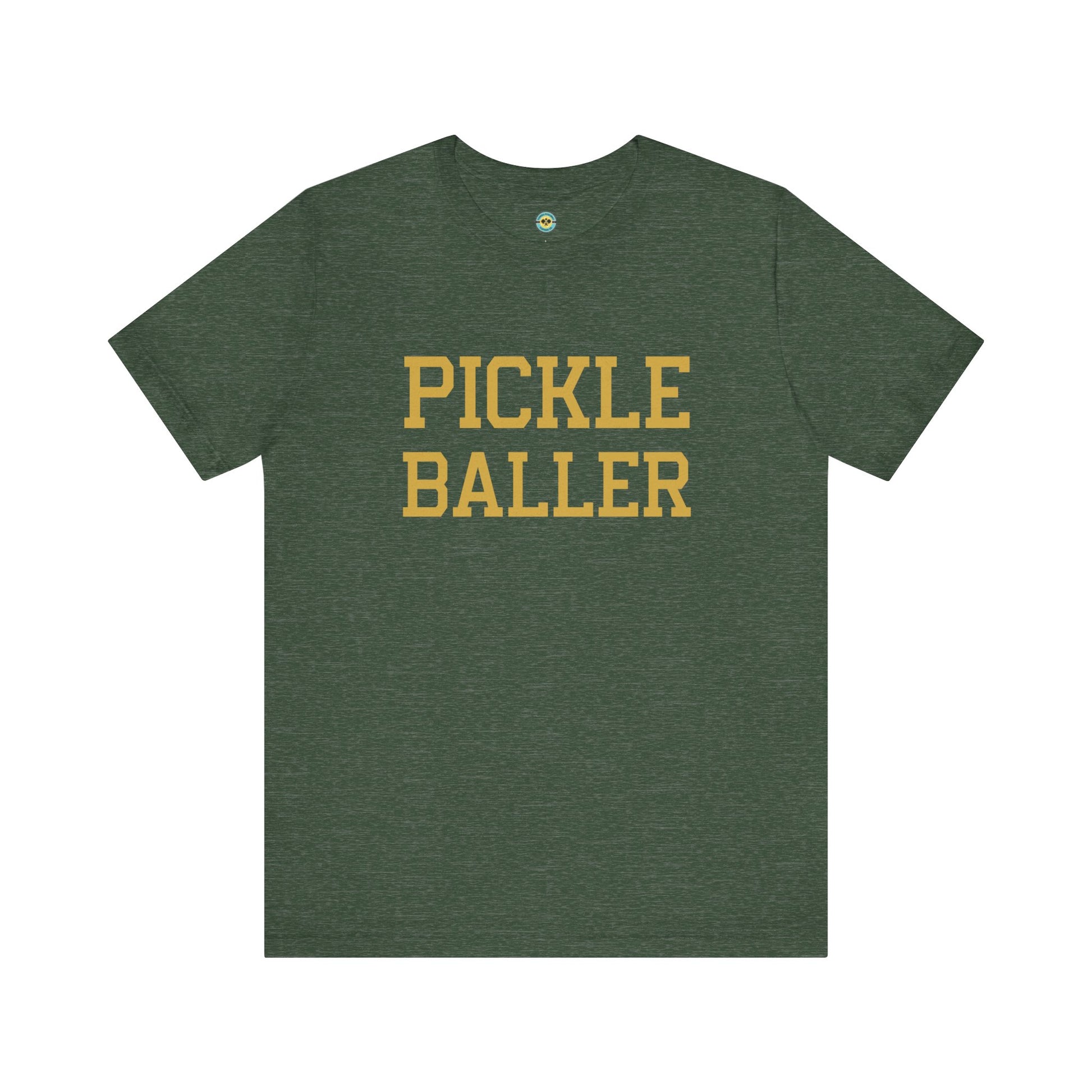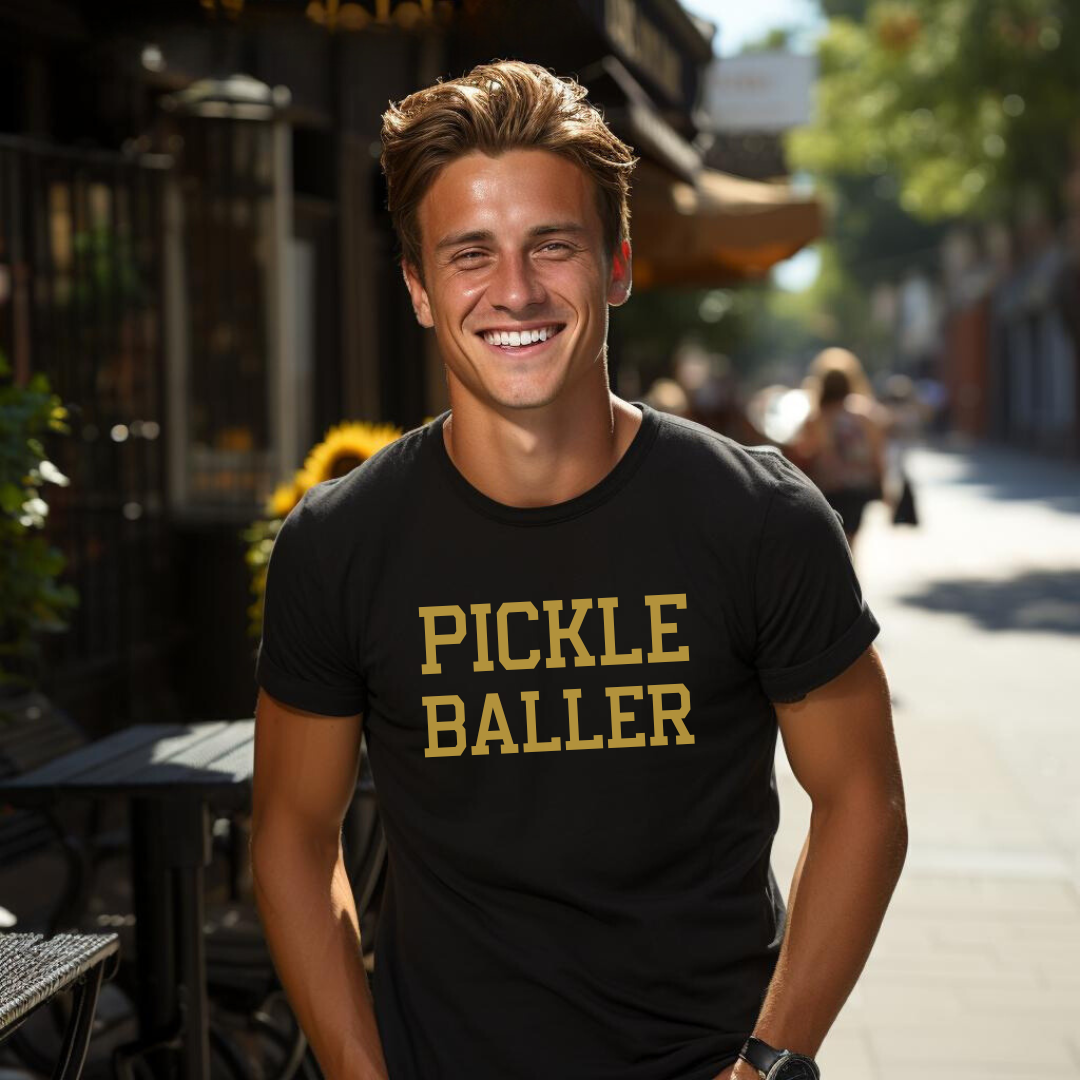 Simply stated in a collegiate design, this soft and comfortable PICKLE BALLER pickleball t-shirt will be an instant classic.