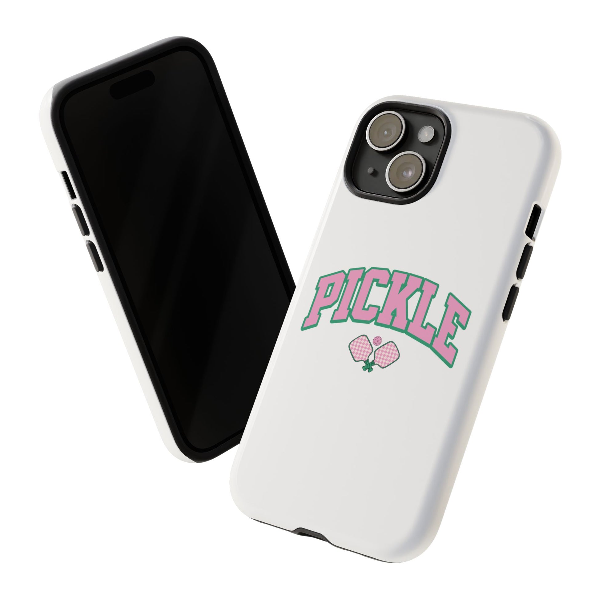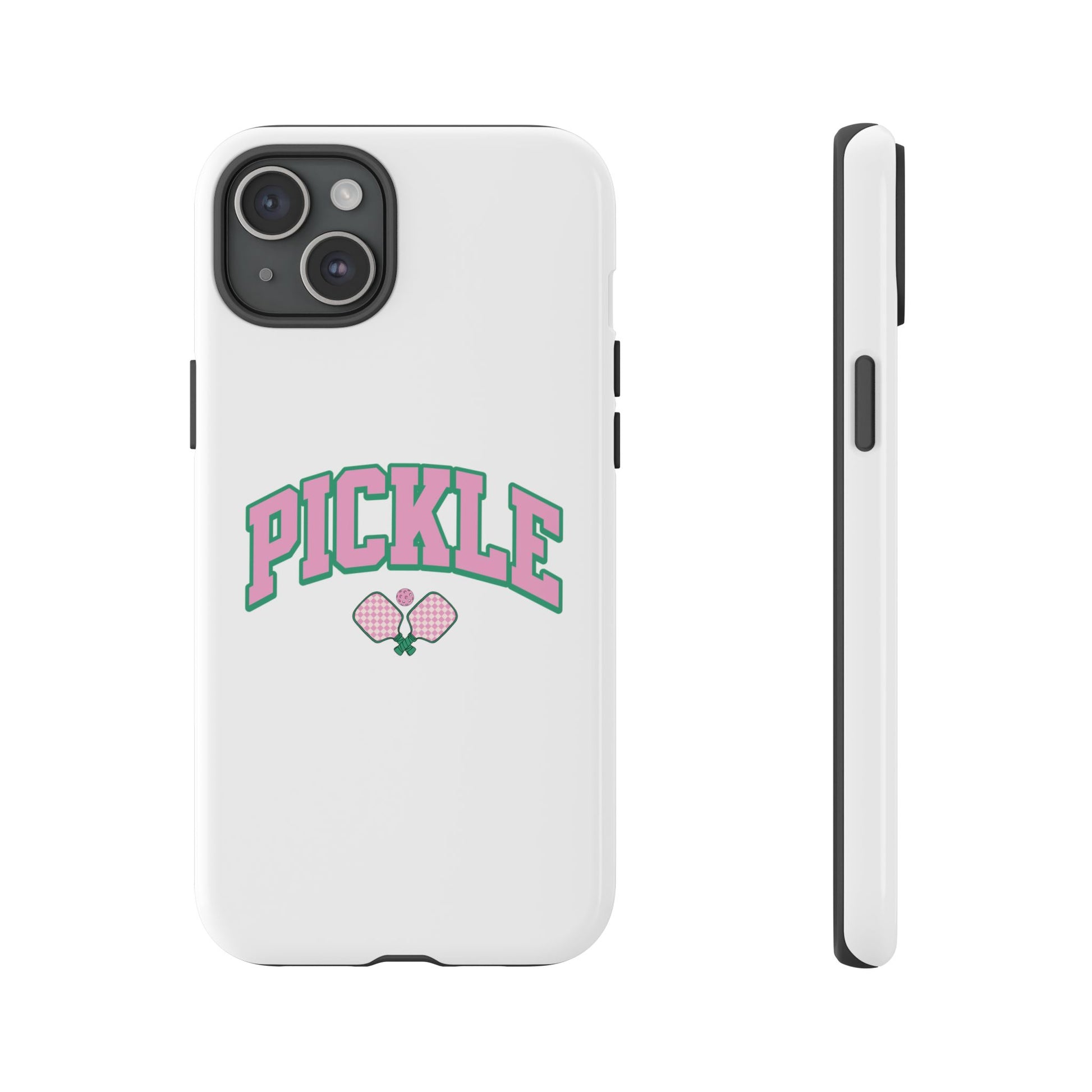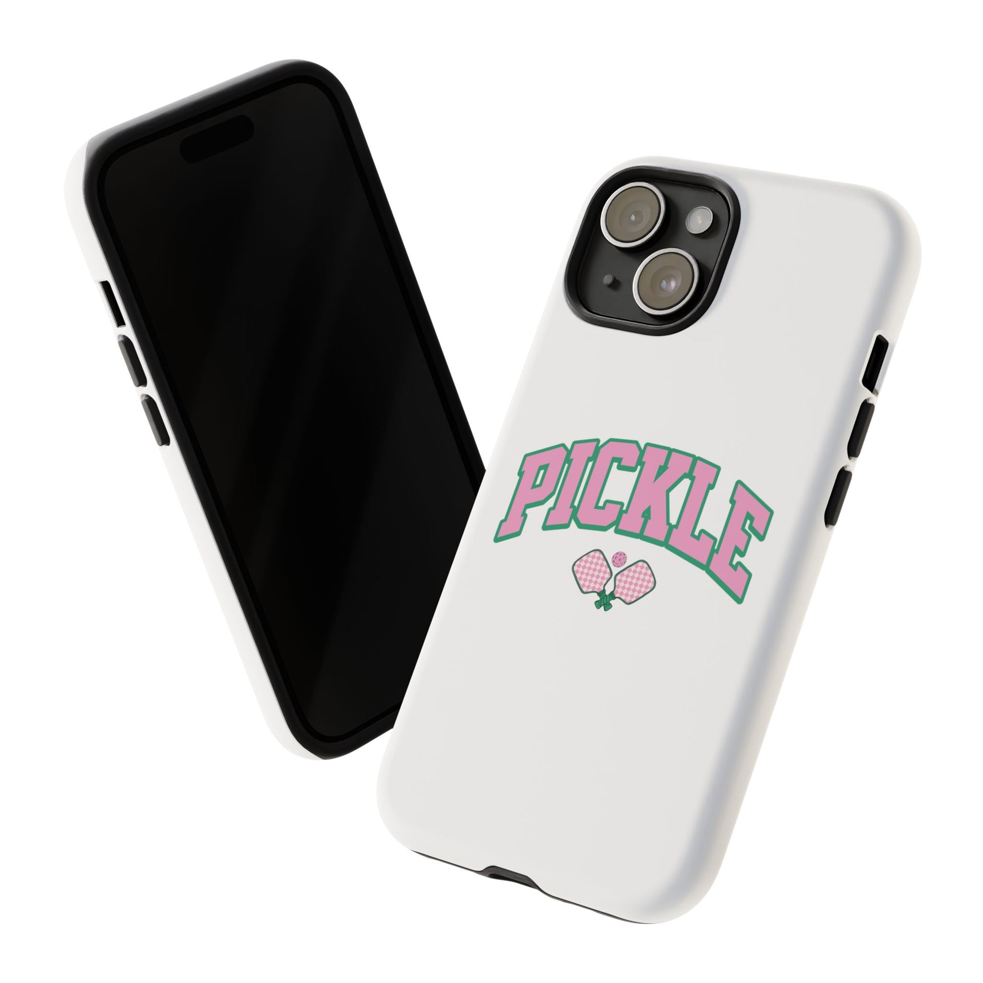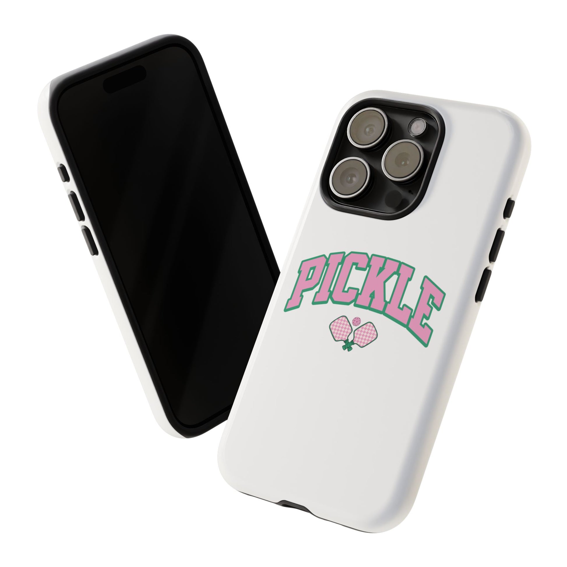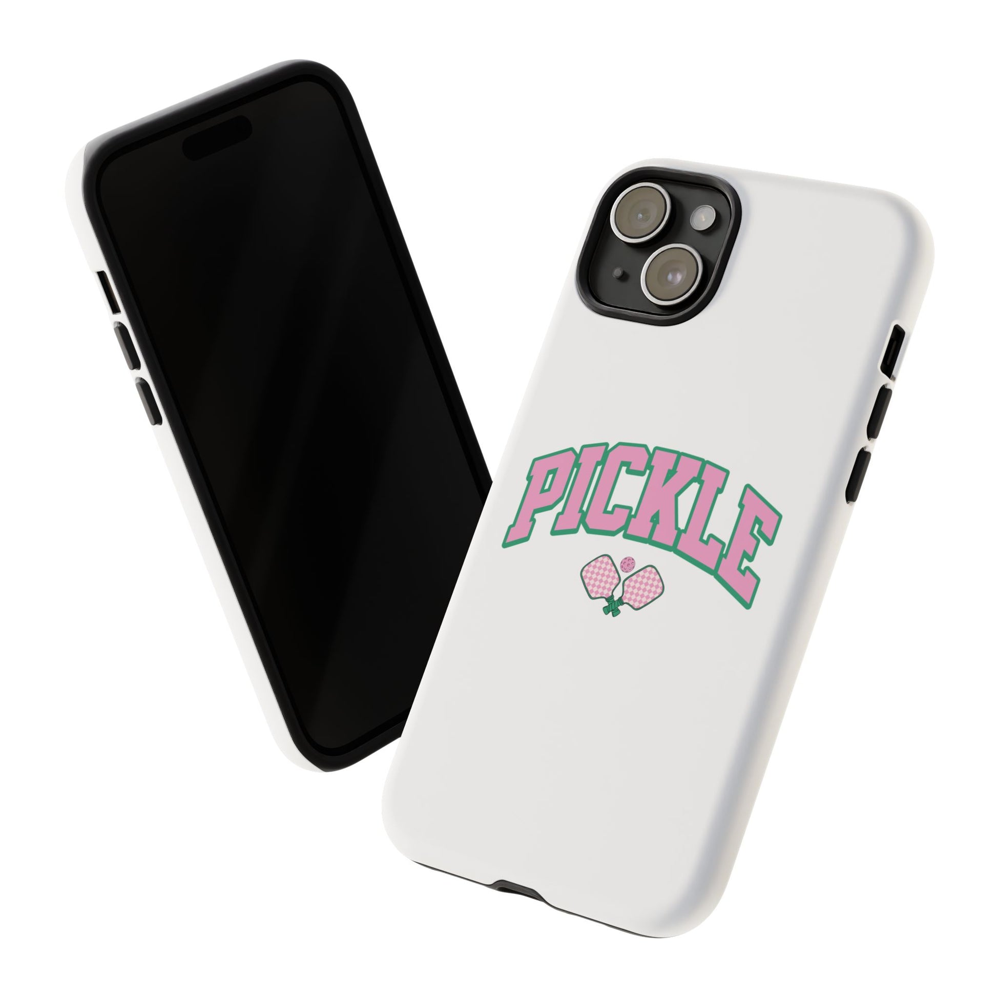 Turn heads on and off the court with the PICKLE phone case, sporting bold pink and green collegiate-style letters with pink check crossed paddles below it.