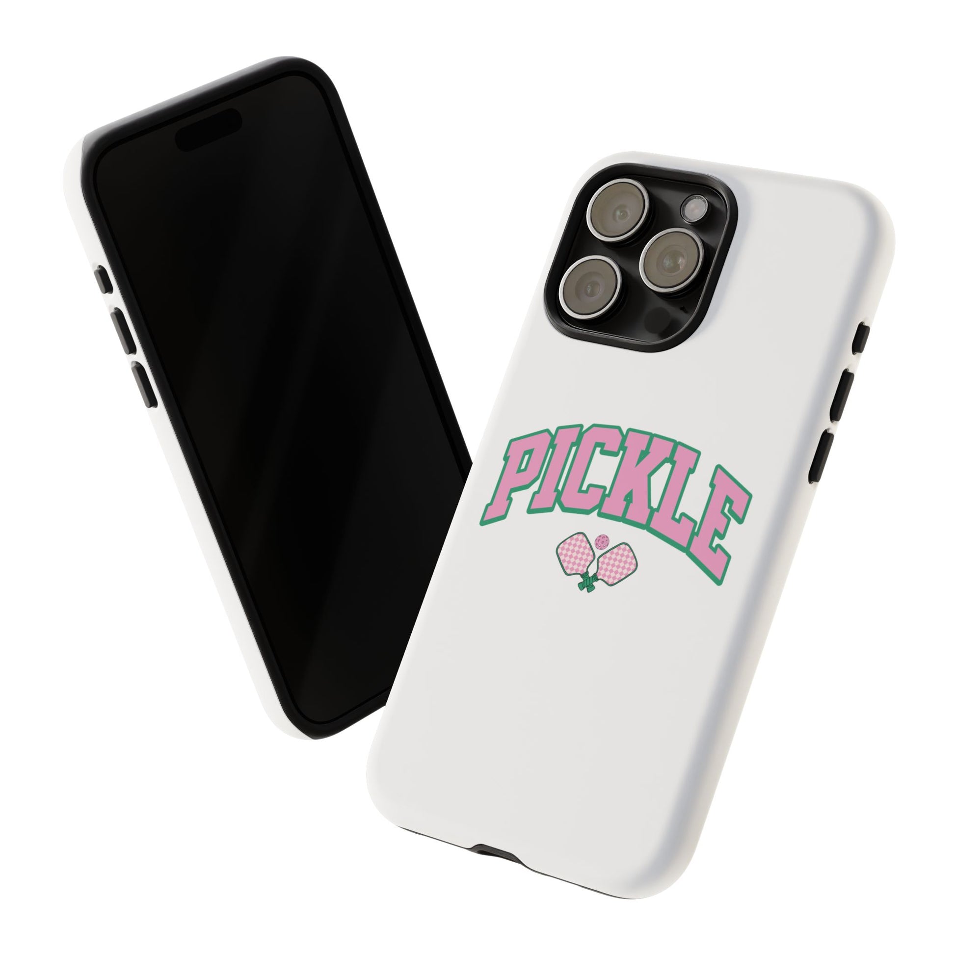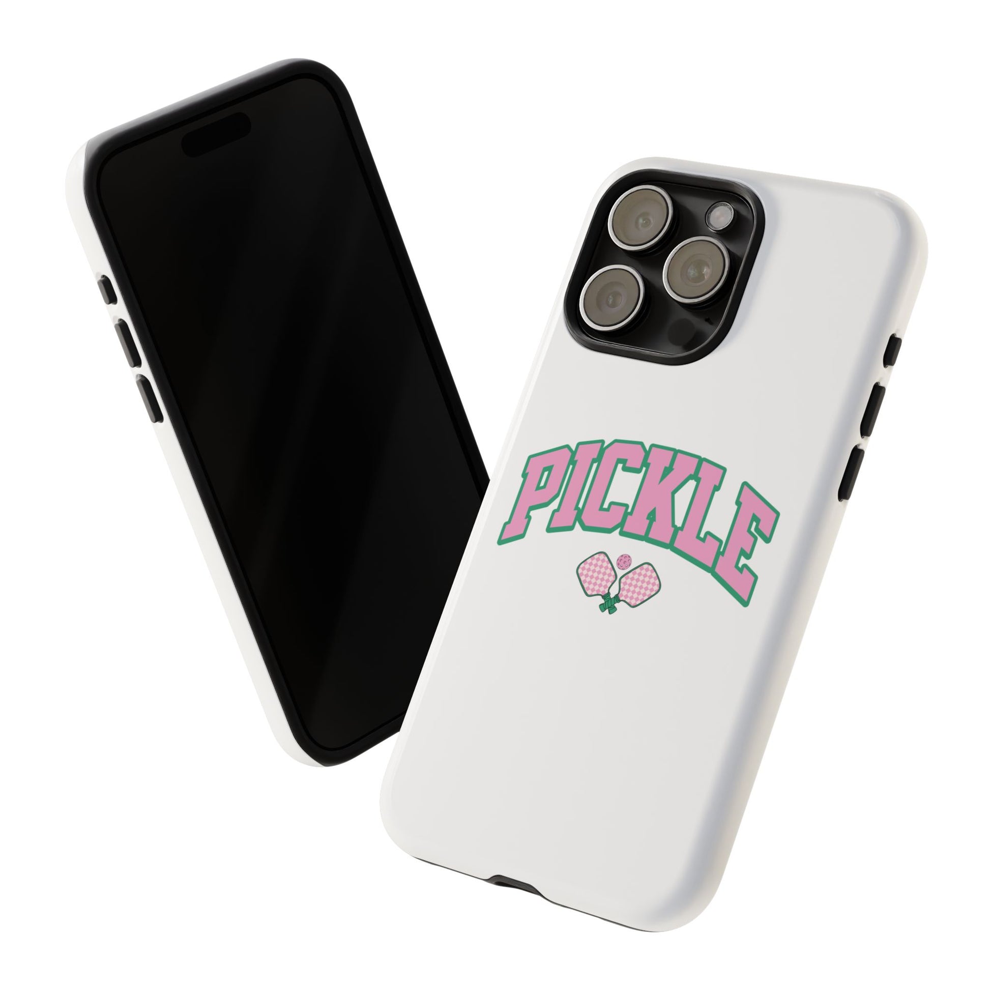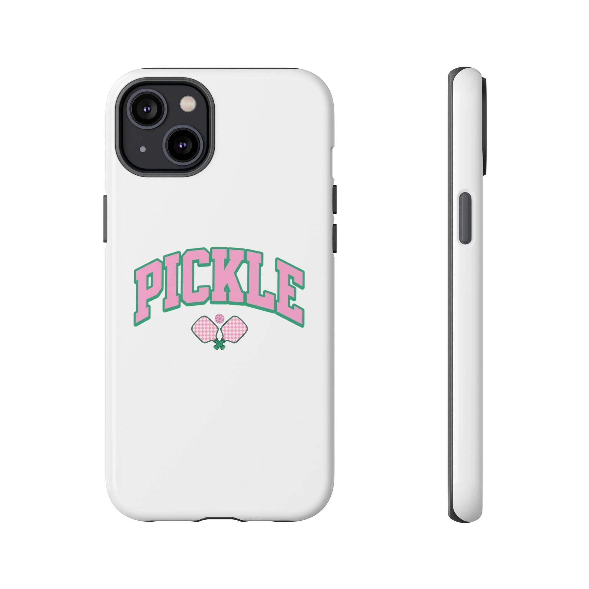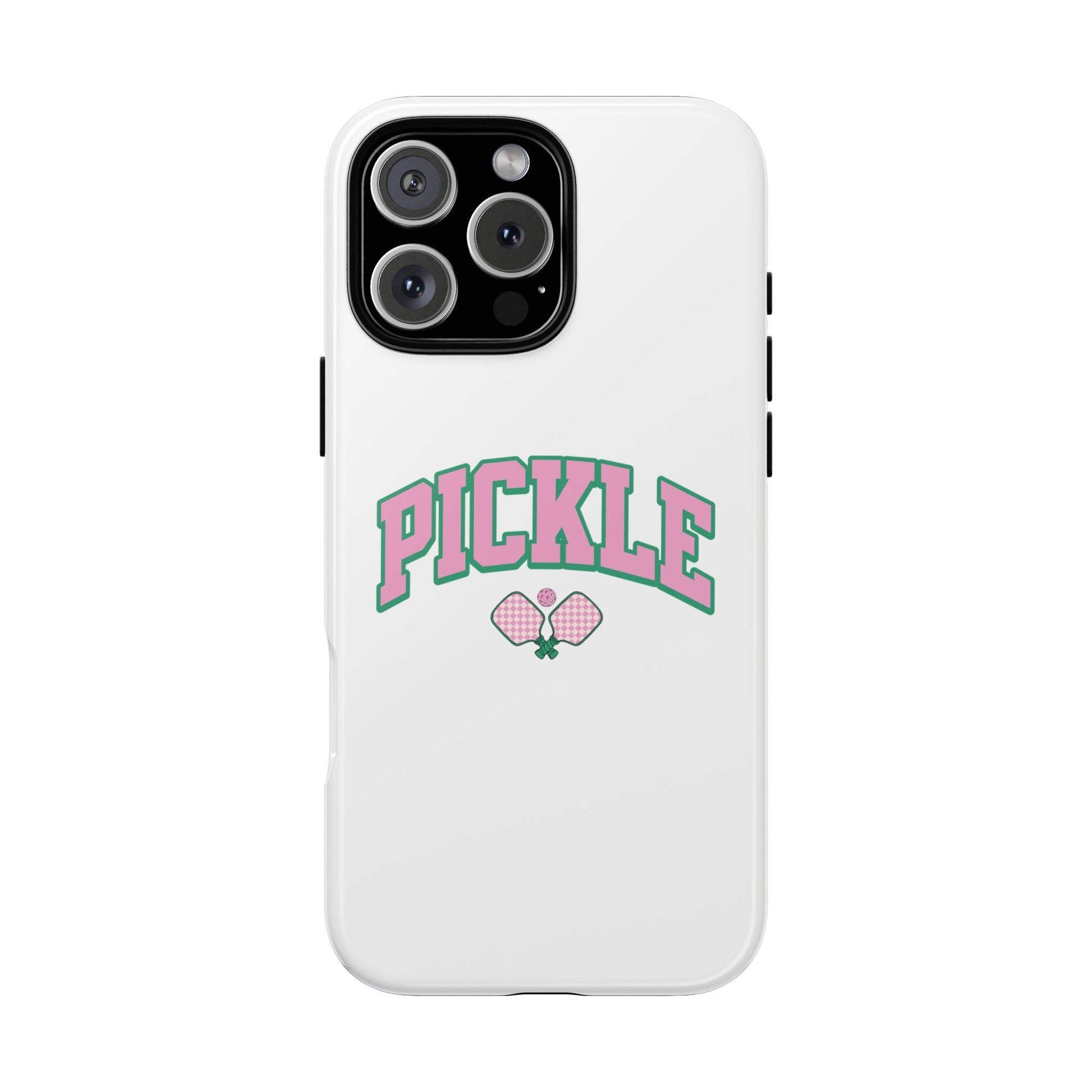 Turn heads on and off the court with the PICKLE phone case, sporting bold pink and green collegiate-style letters with pink check crossed paddles below it.