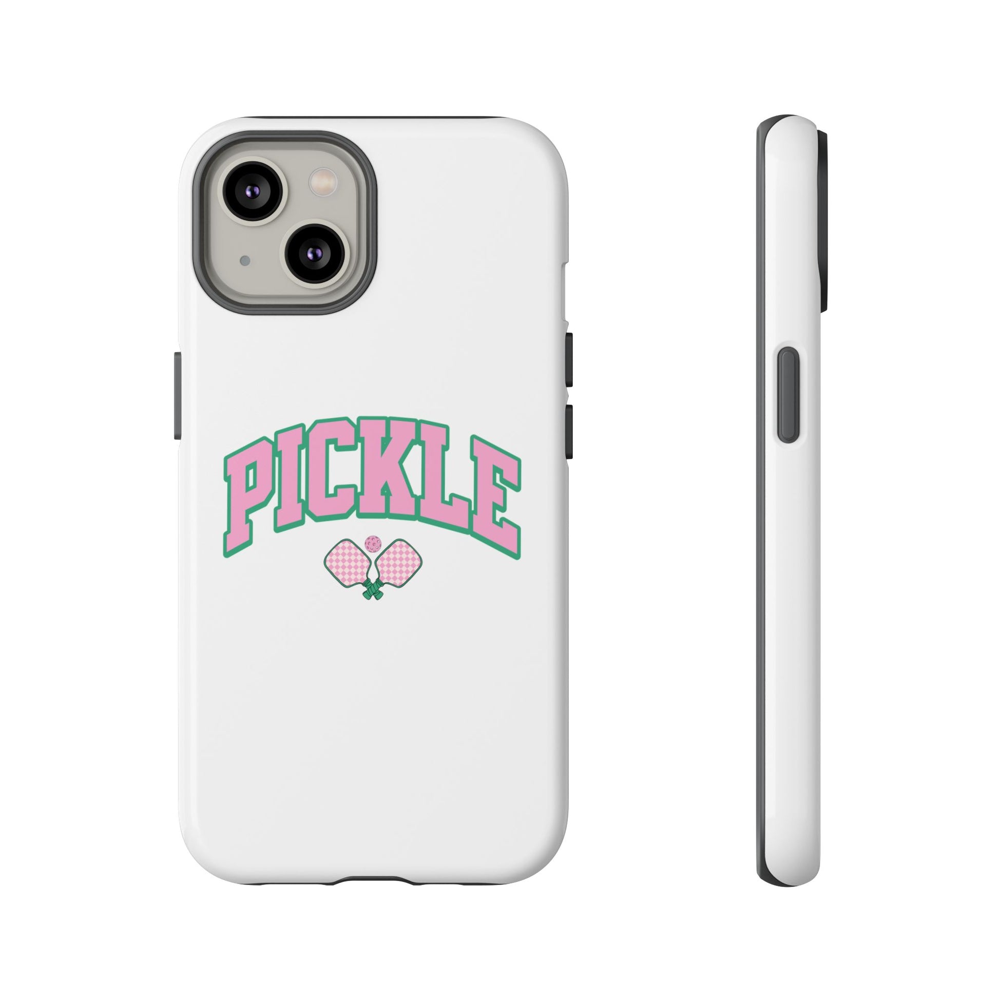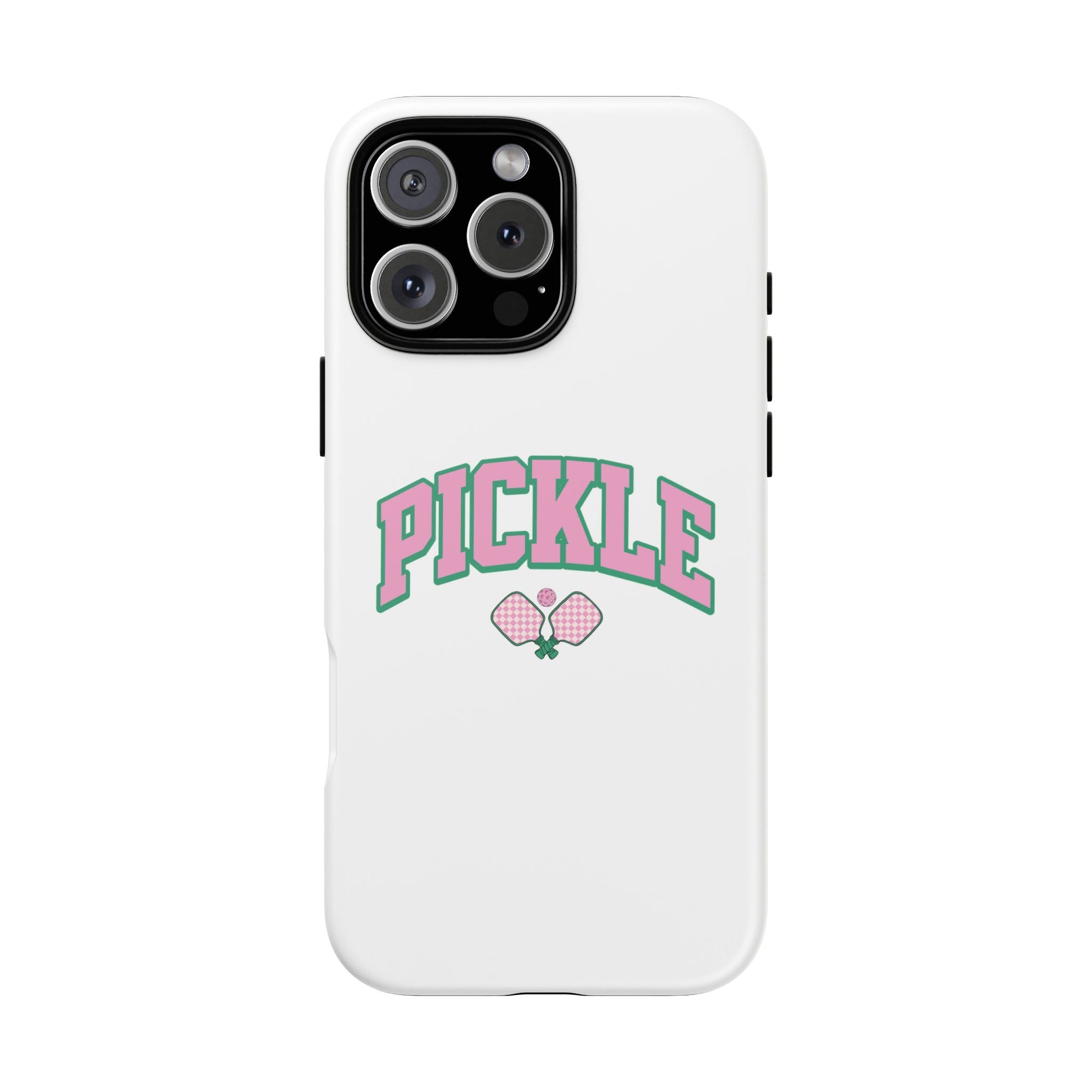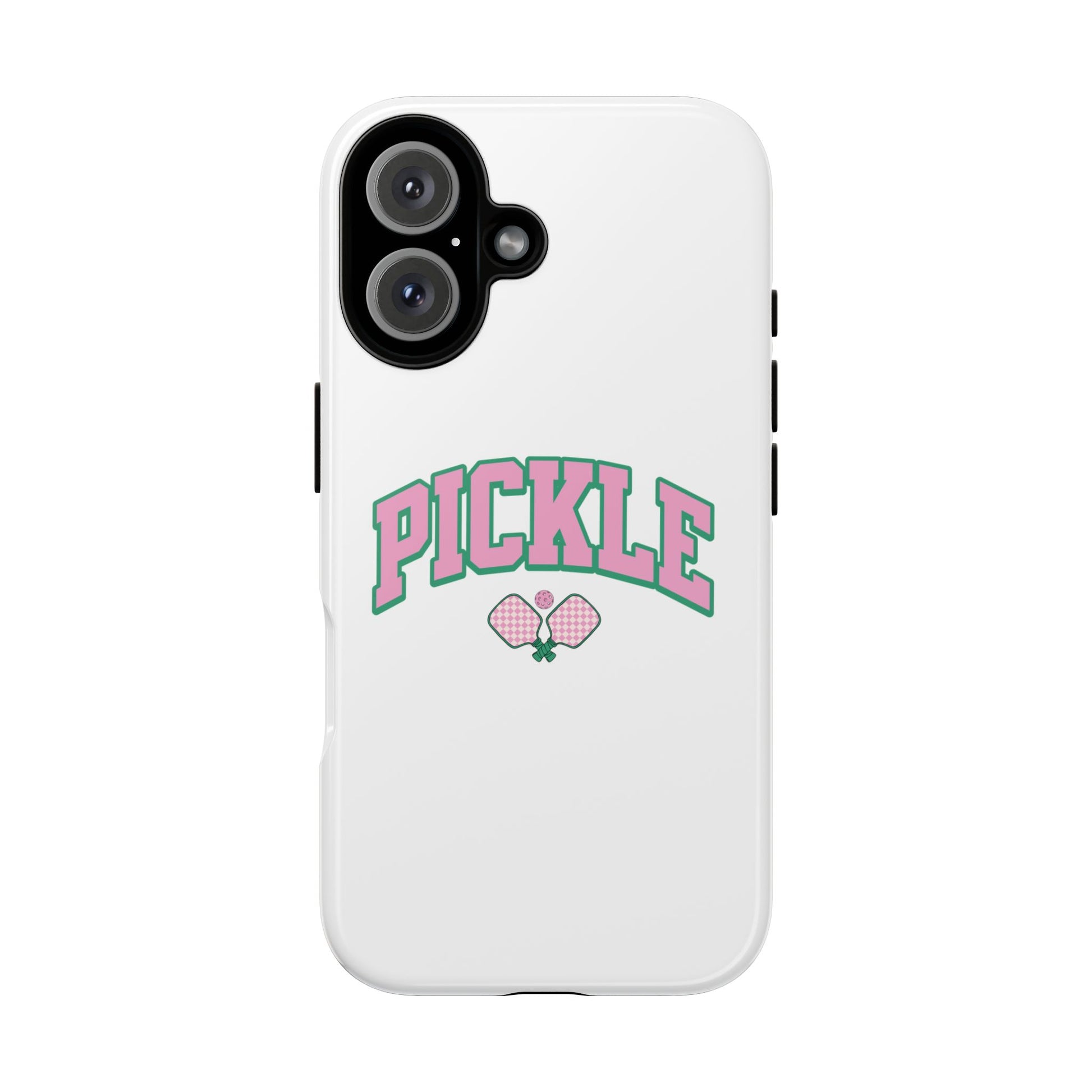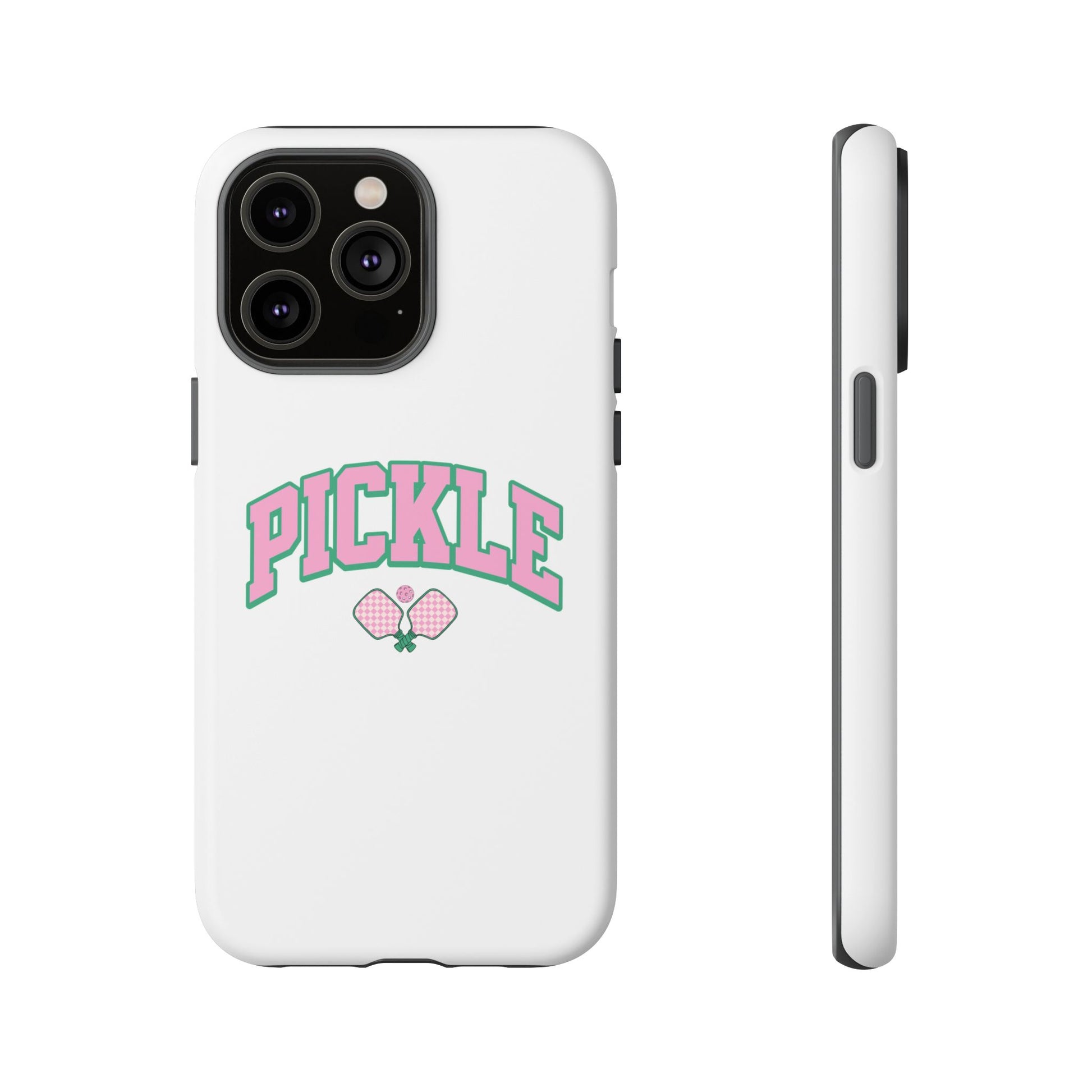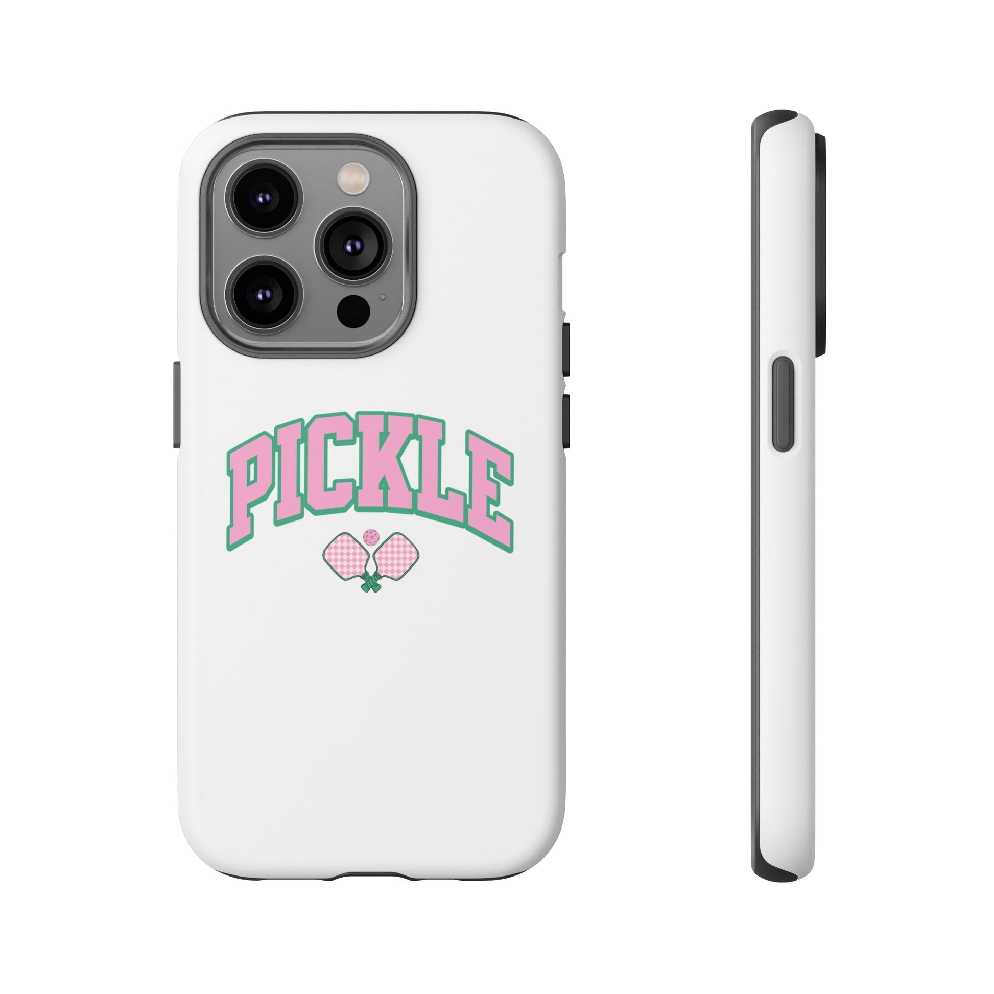 Turn heads on and off the court with the PICKLE phone case, sporting bold pink and green collegiate-style letters with pink check crossed paddles below it.