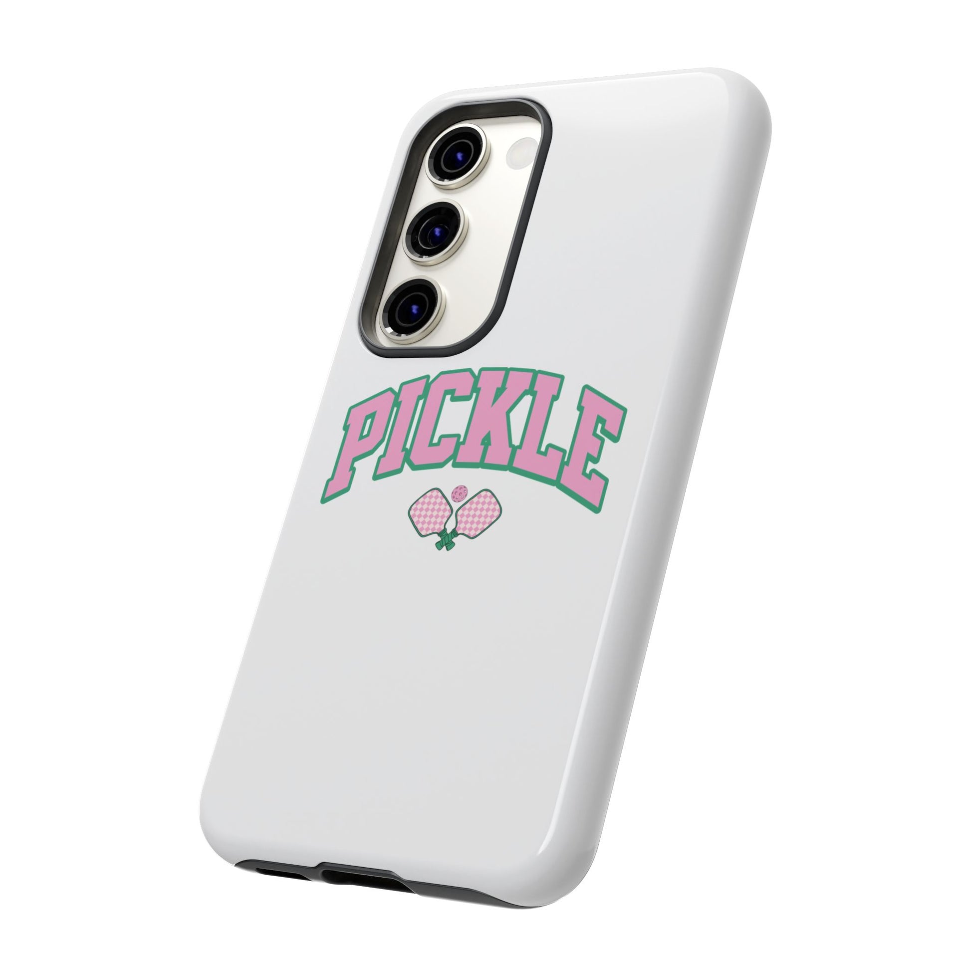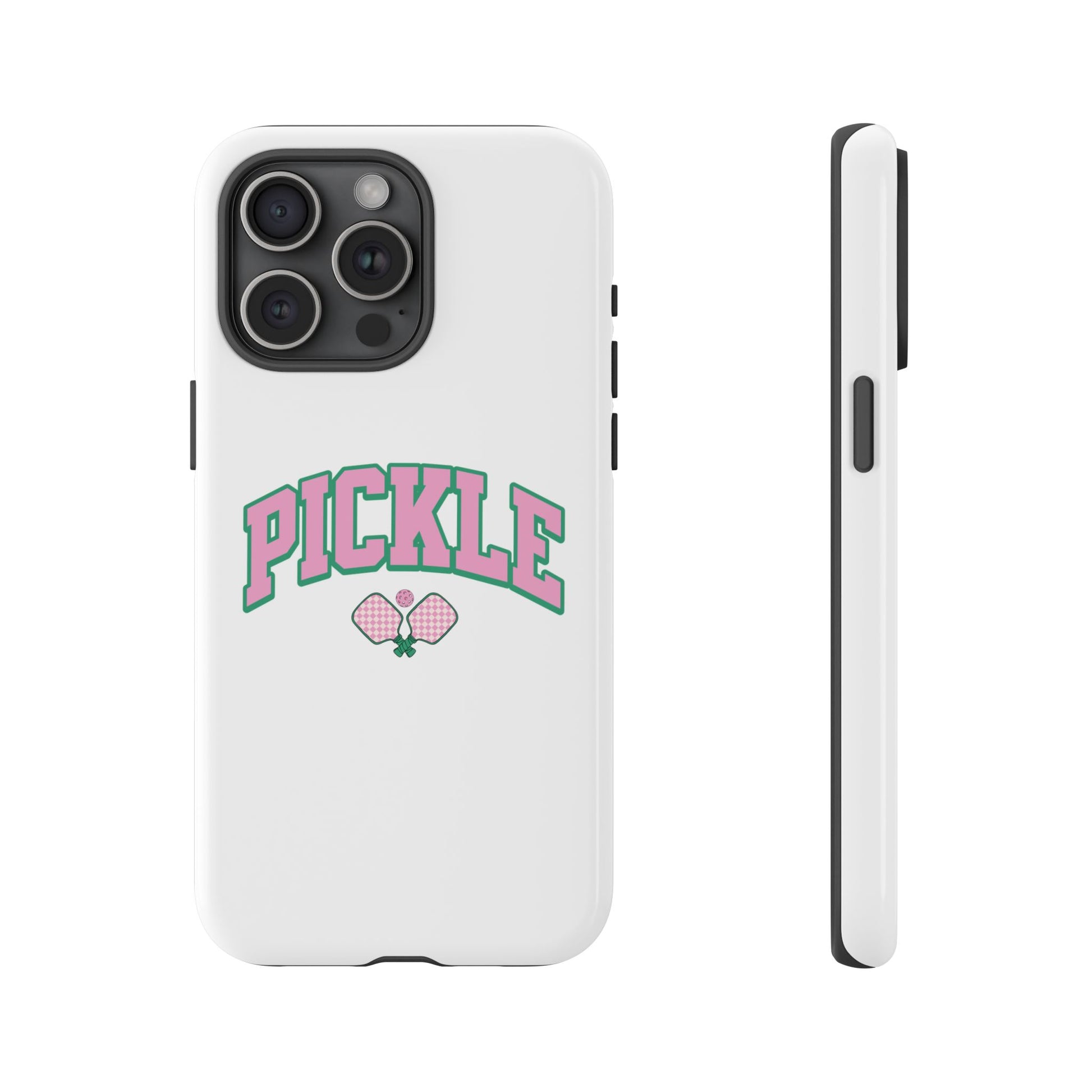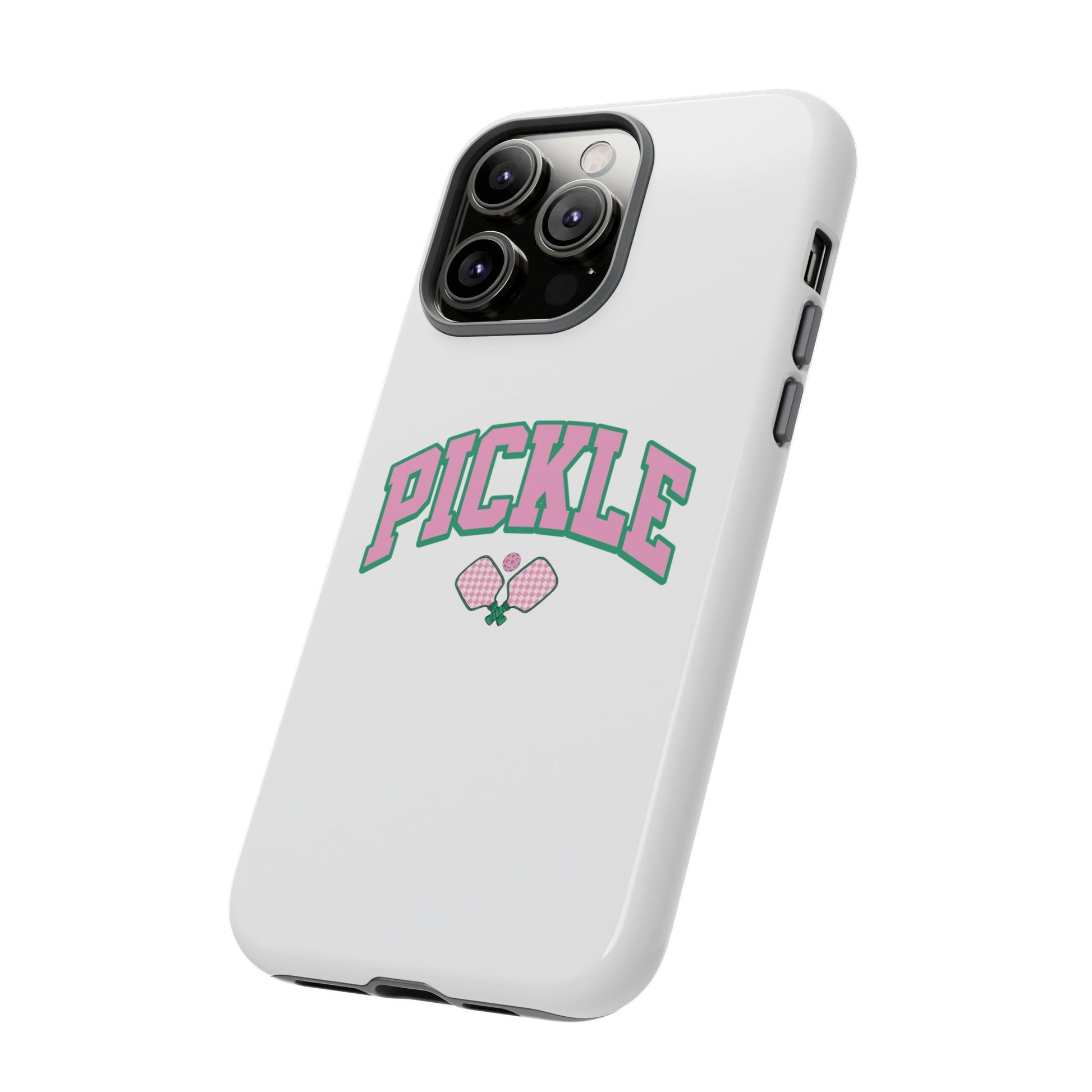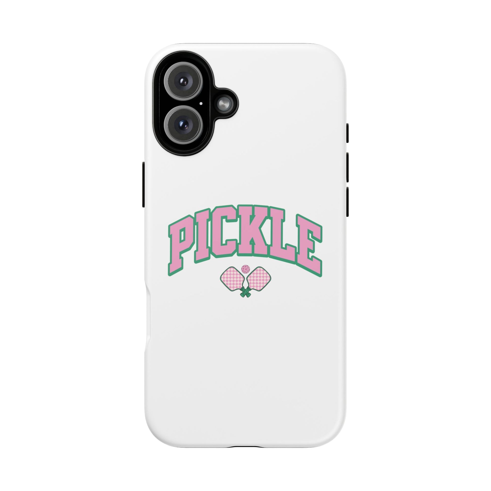 Turn heads on and off the court with the PICKLE phone case, sporting bold pink and green collegiate-style letters with pink check crossed paddles below it.