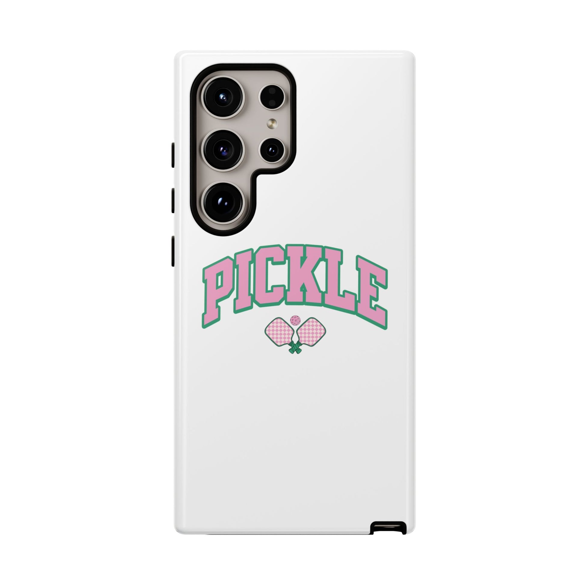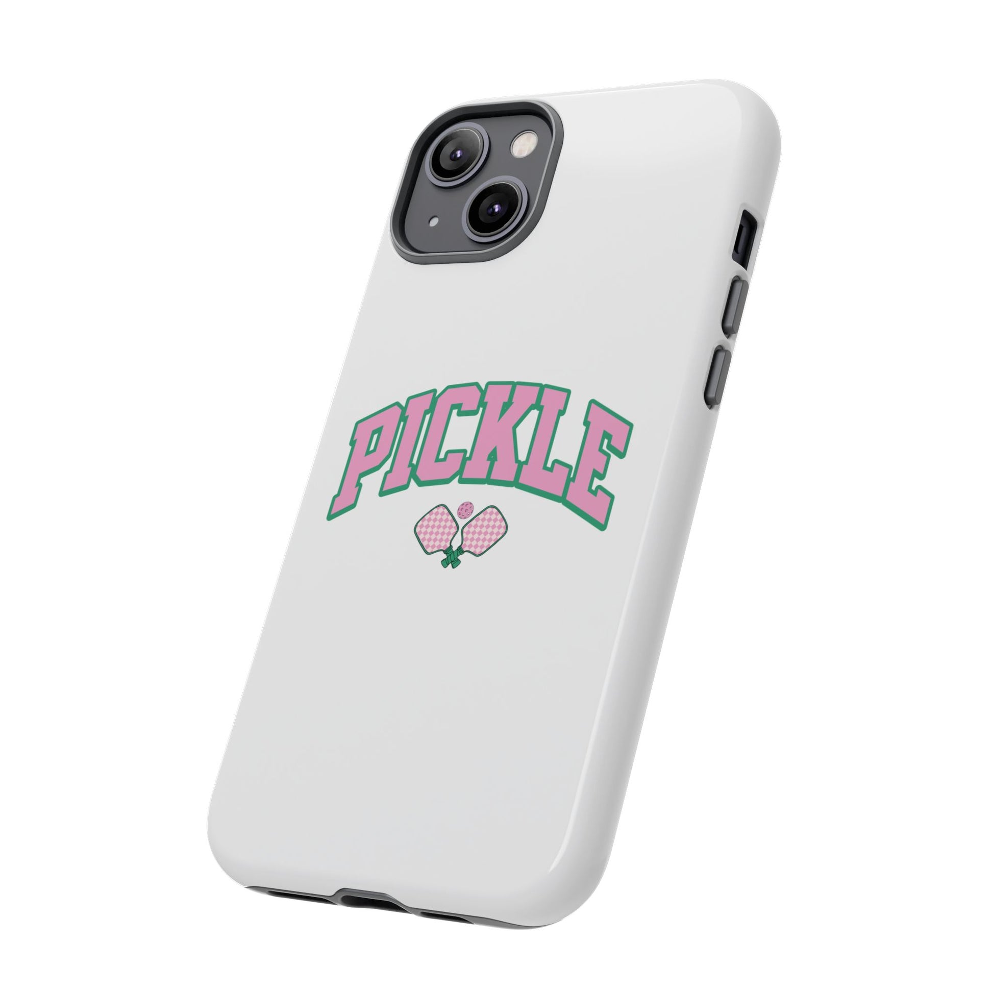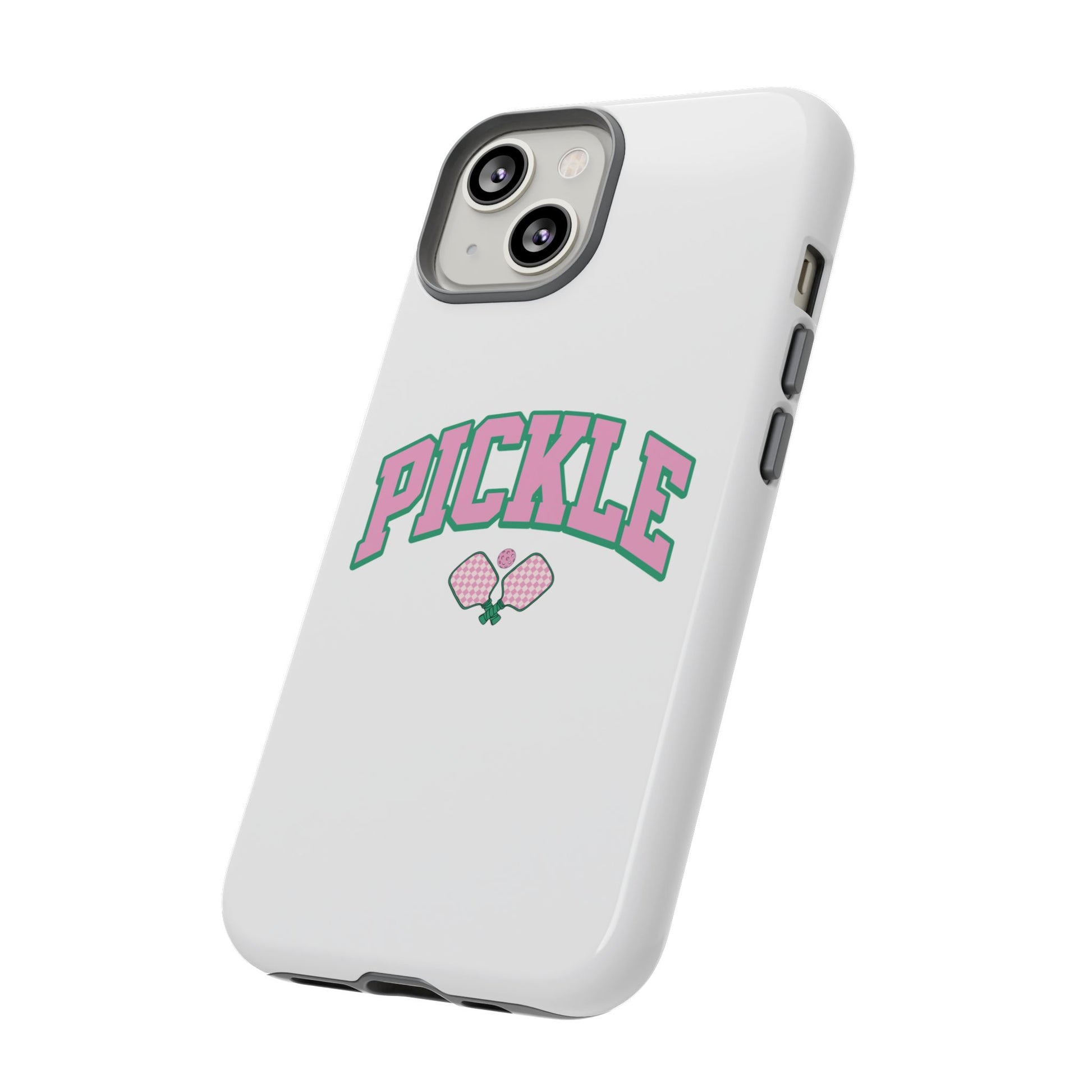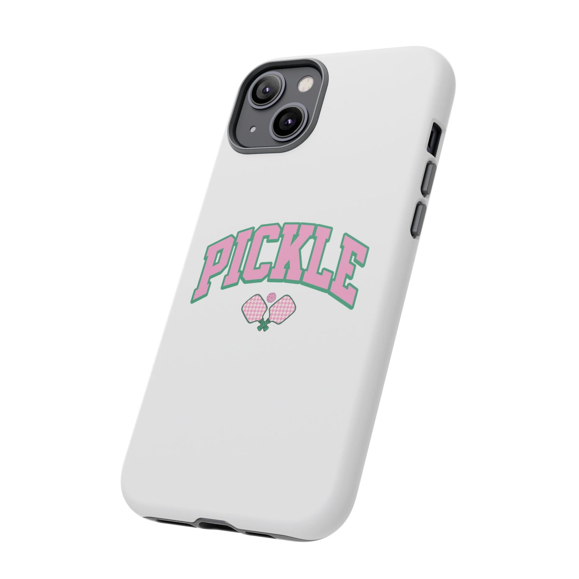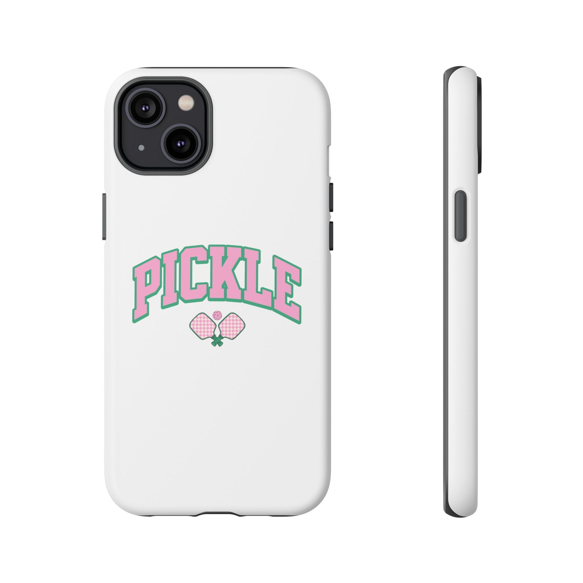 Turn heads on and off the court with the PICKLE phone case, sporting bold pink and green collegiate-style letters with pink check crossed paddles below it.