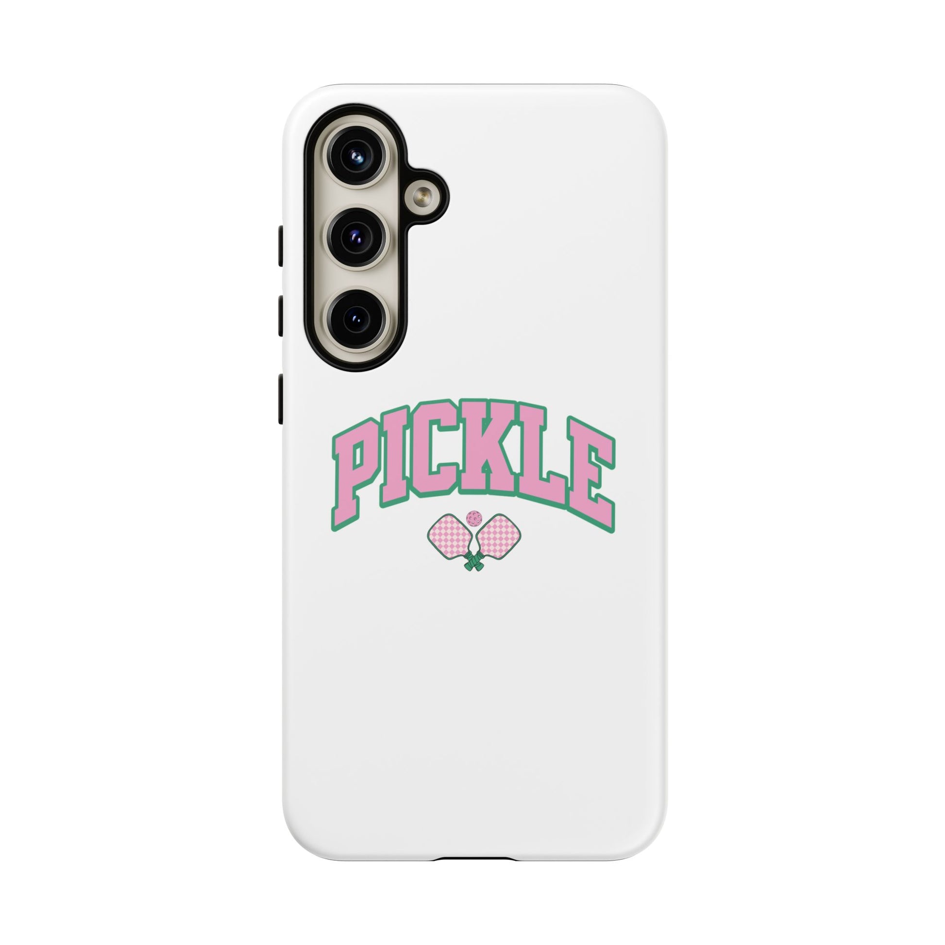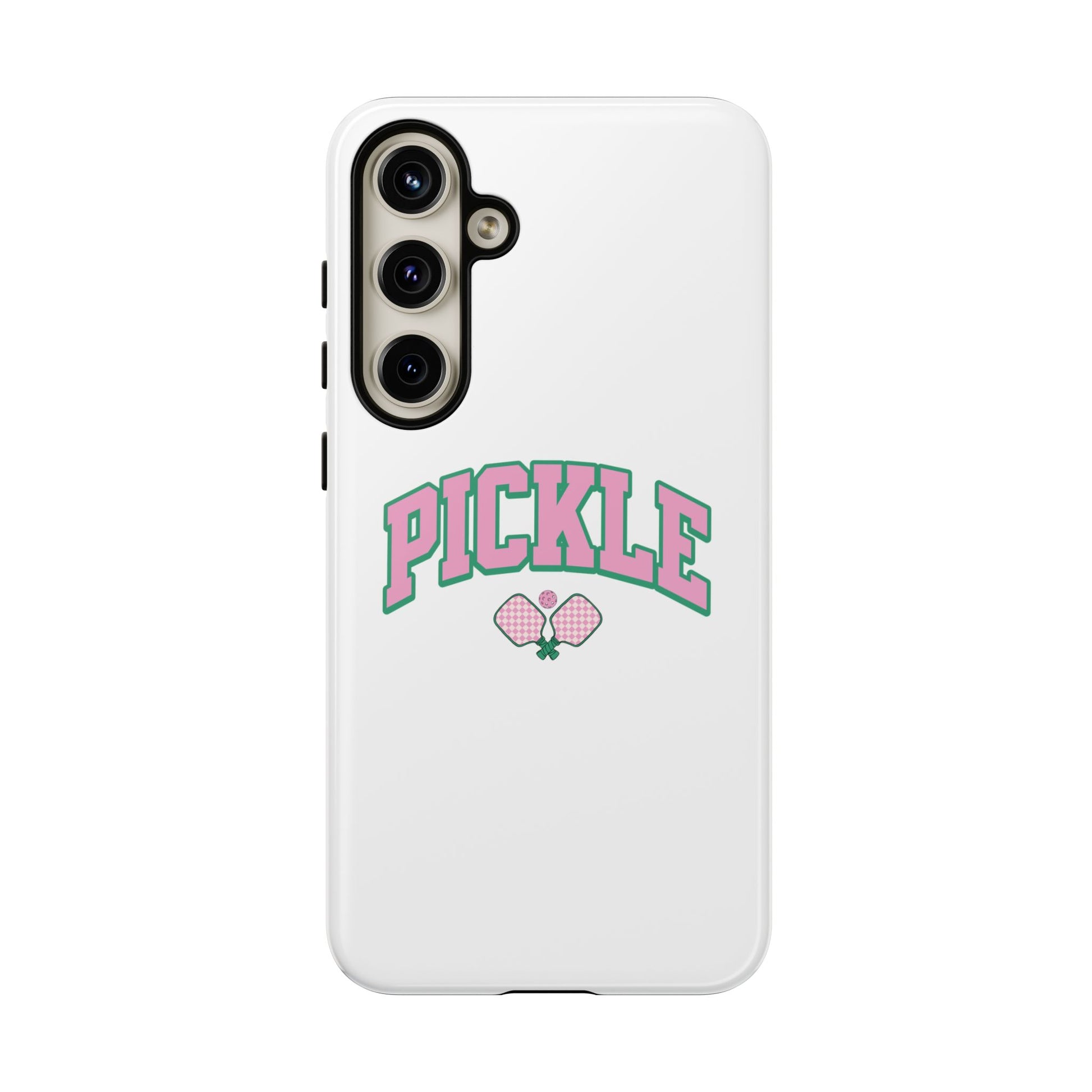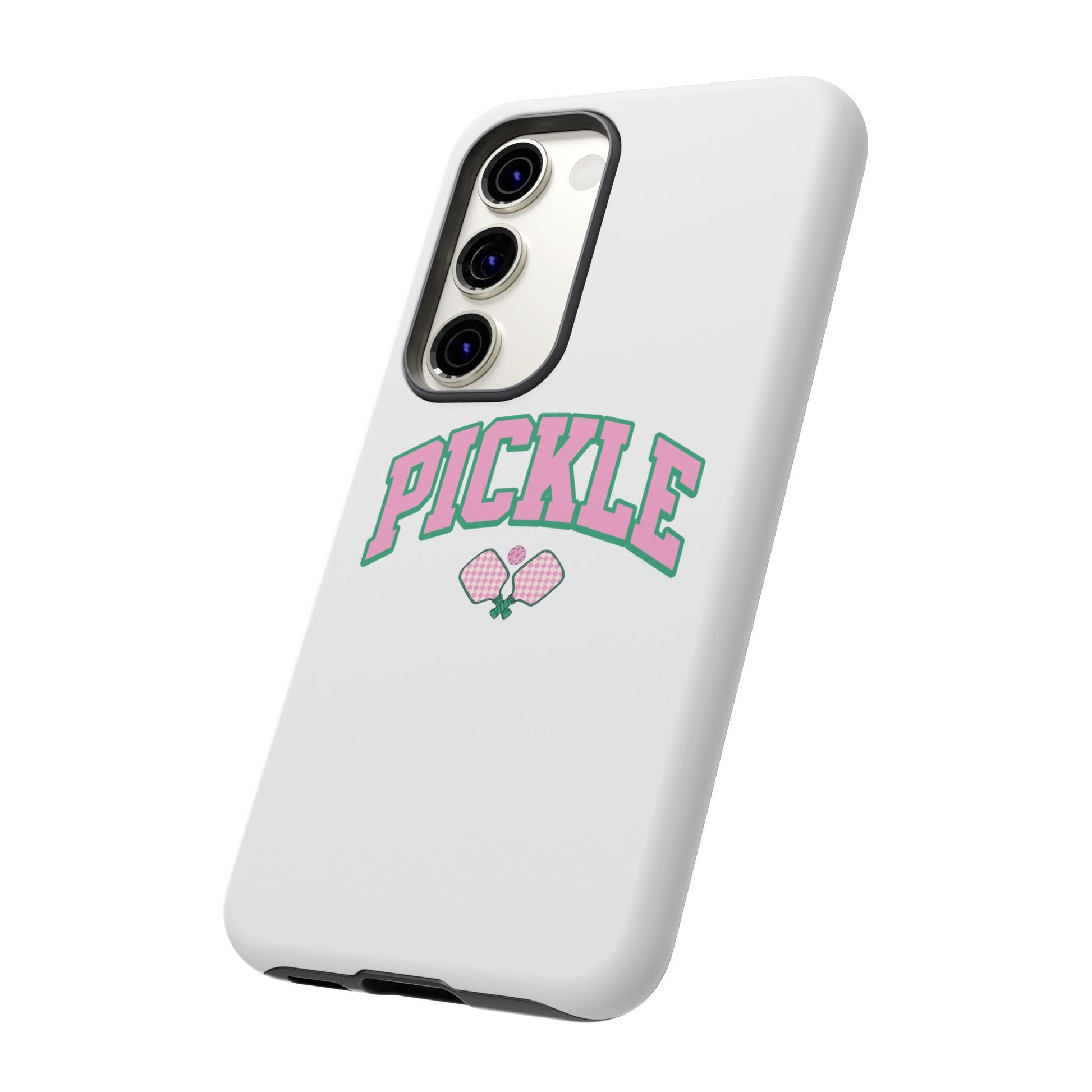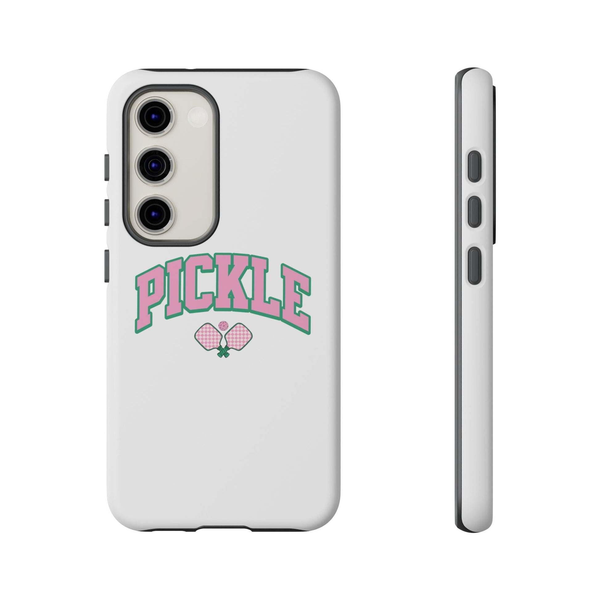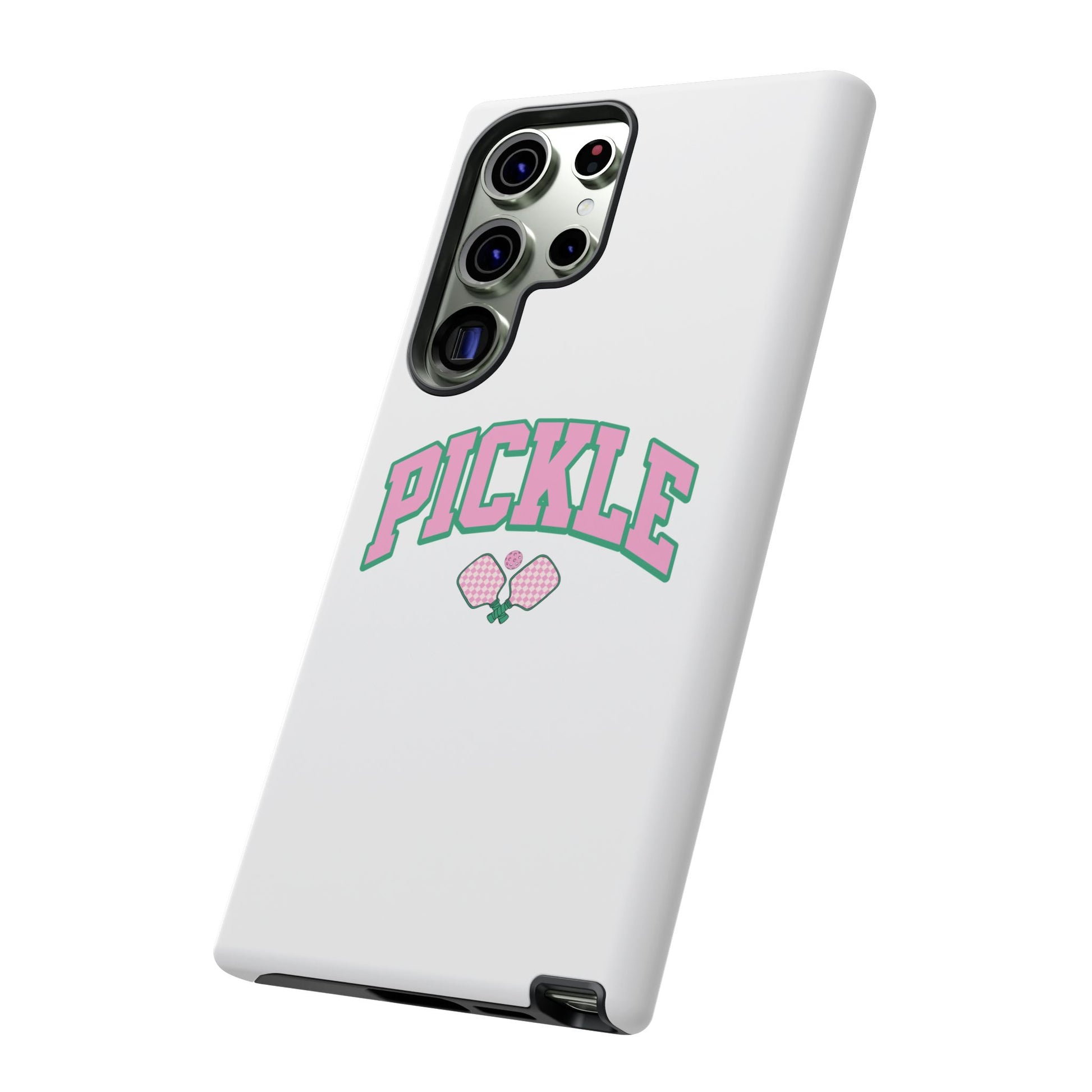 Turn heads on and off the court with the PICKLE phone case, sporting bold pink and green collegiate-style letters with pink check crossed paddles below it.