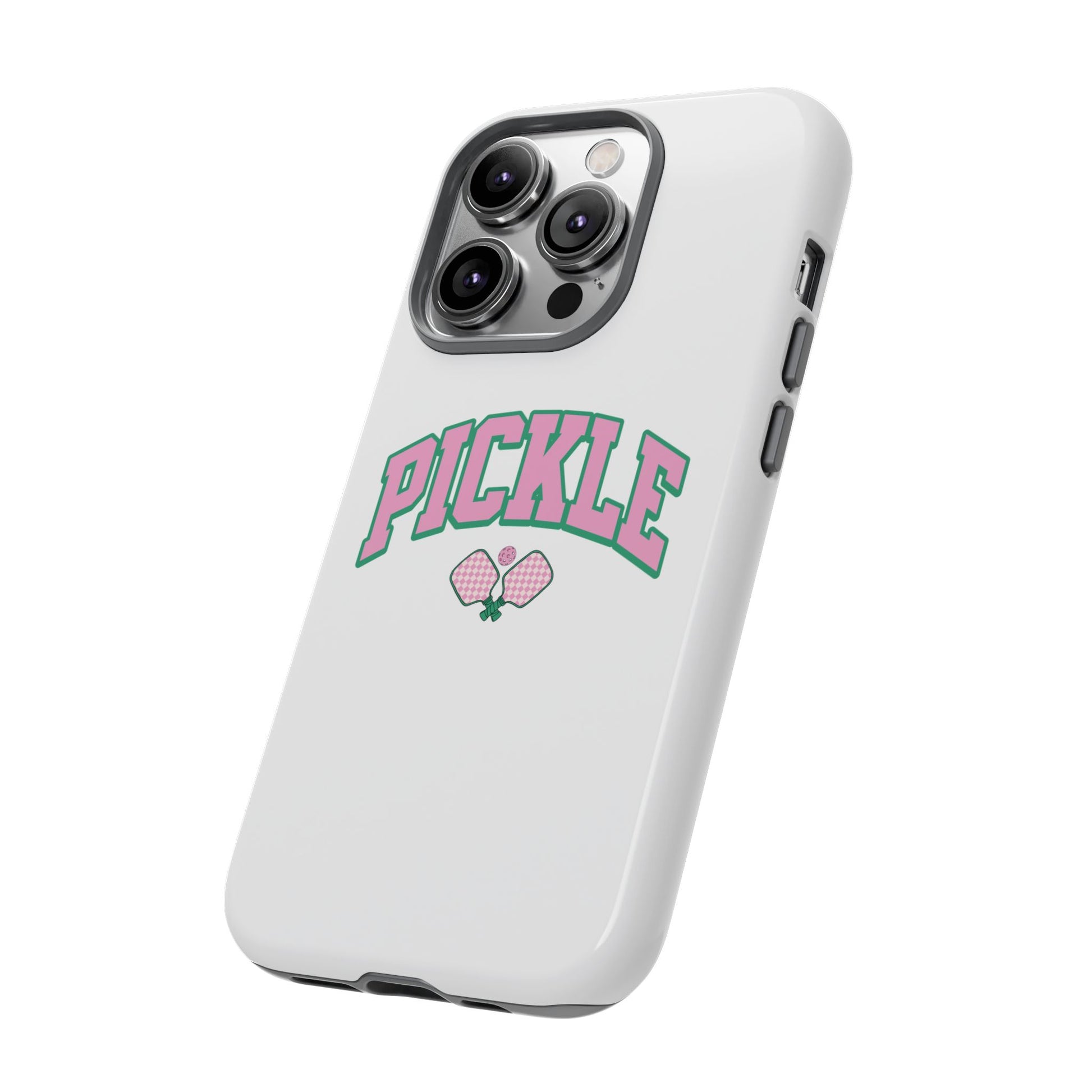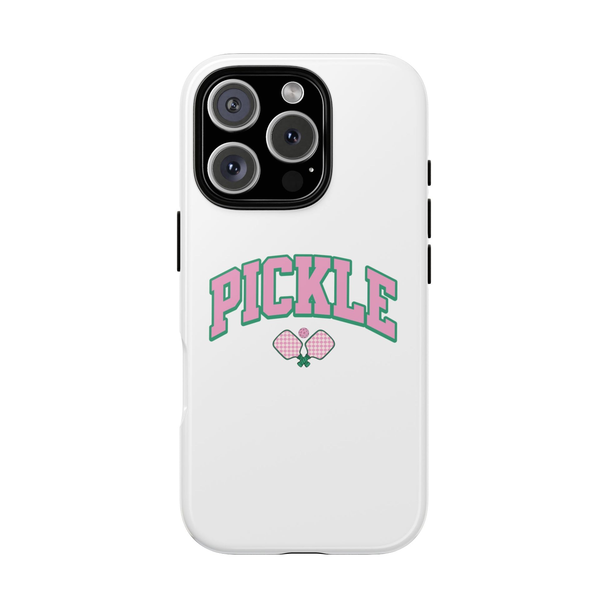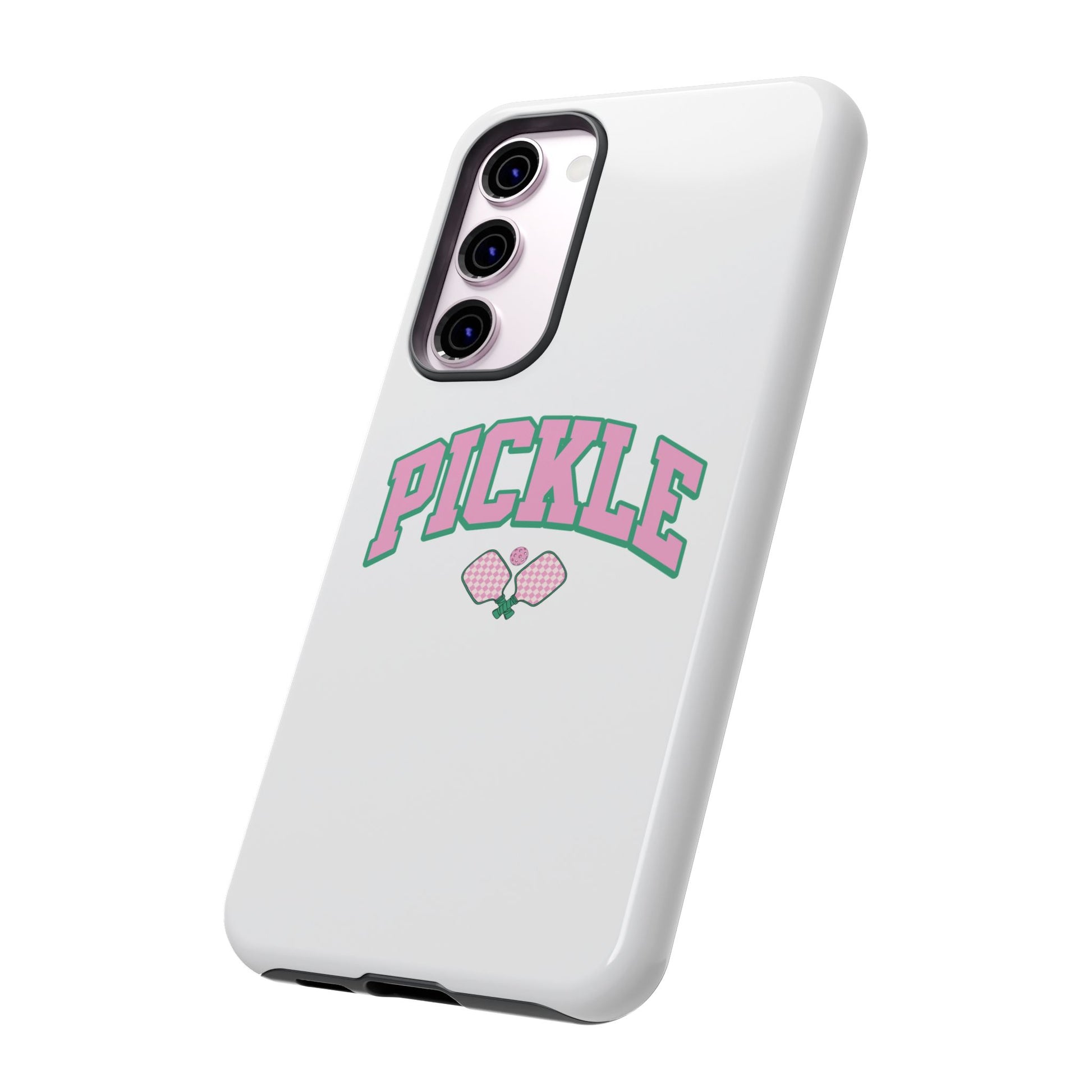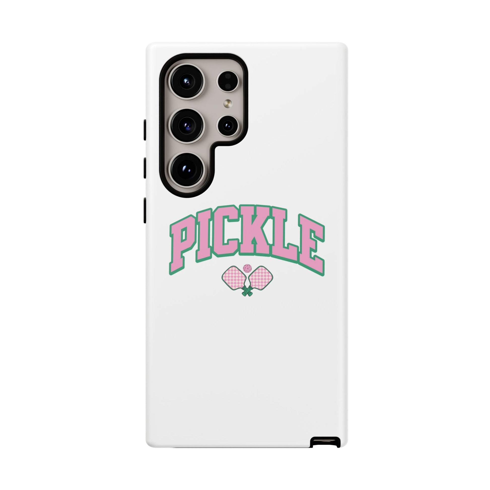 Turn heads on and off the court with the PICKLE phone case, sporting bold pink and green collegiate-style letters with pink check crossed paddles below it.