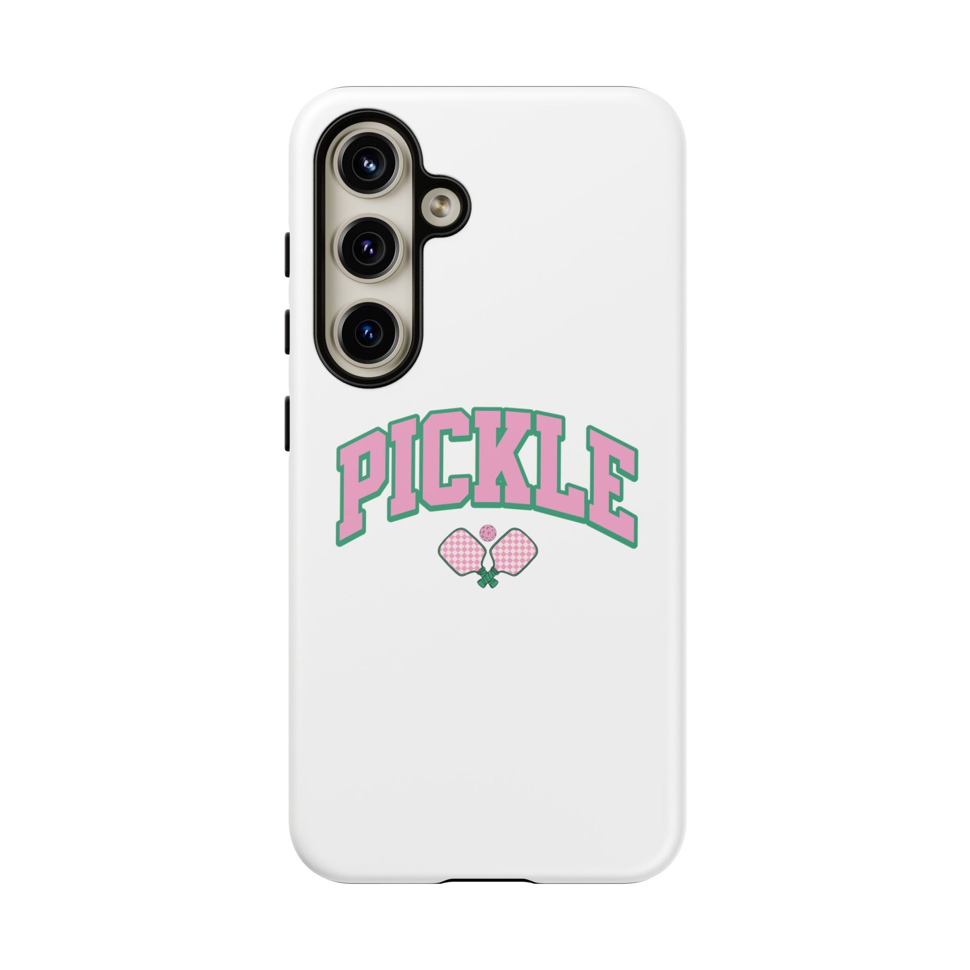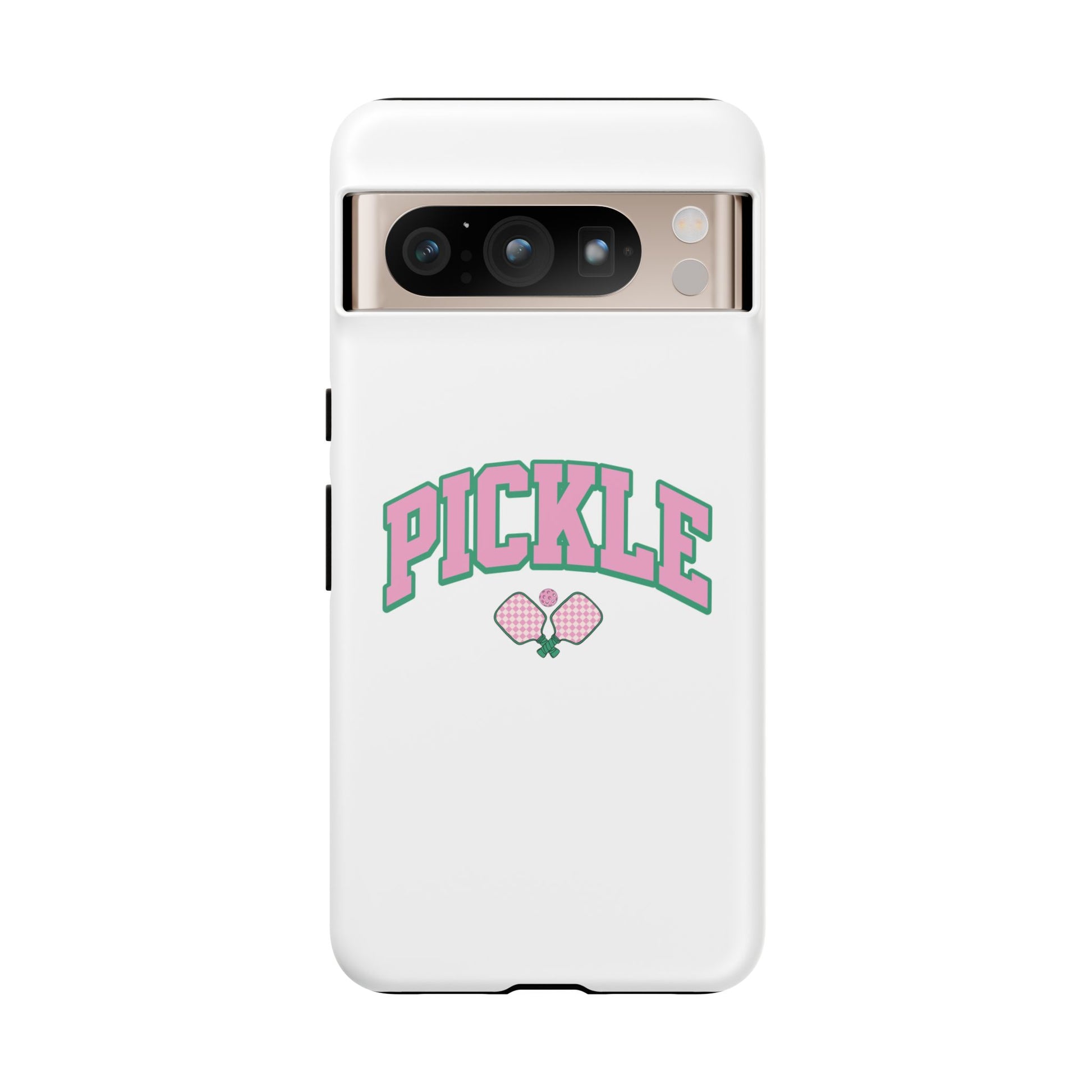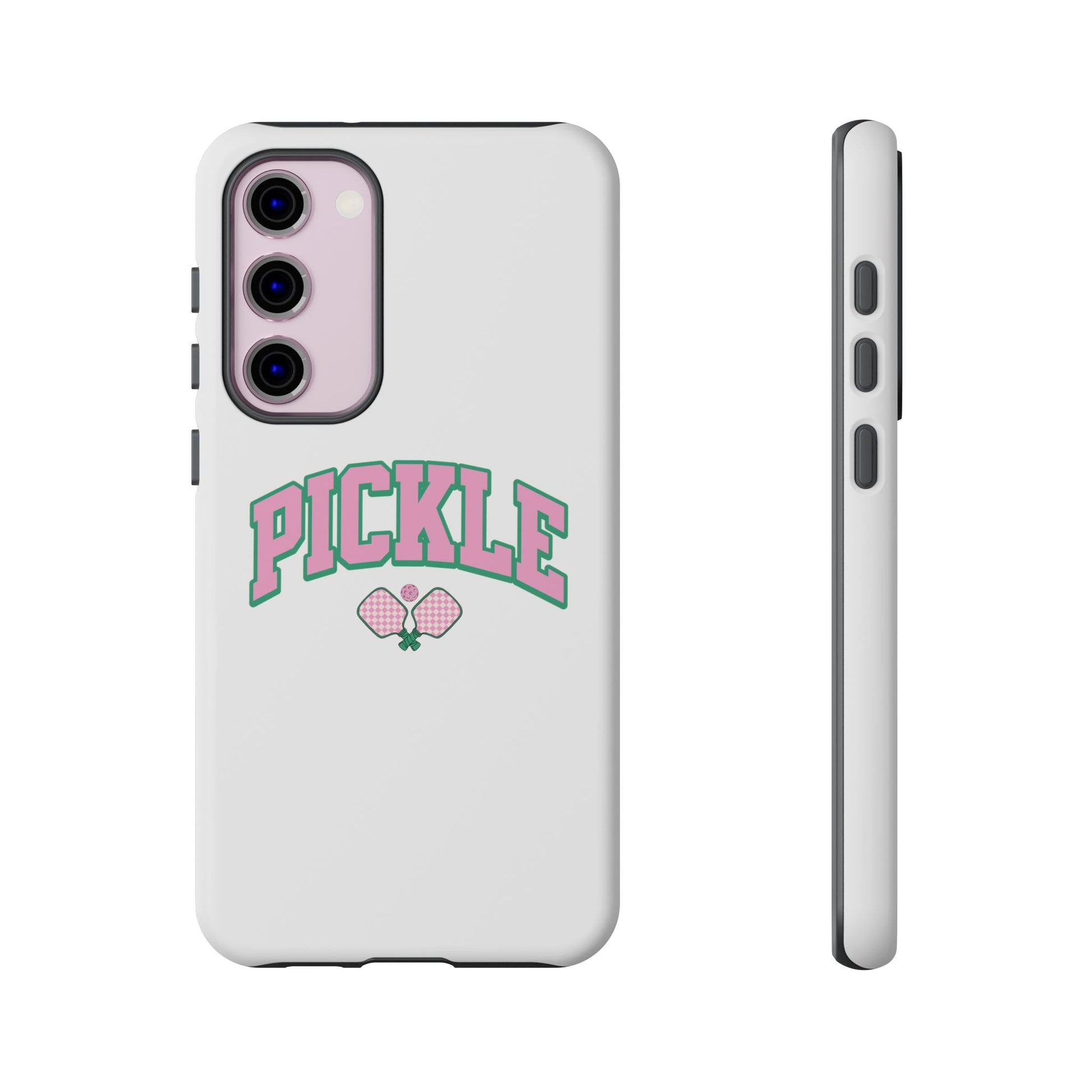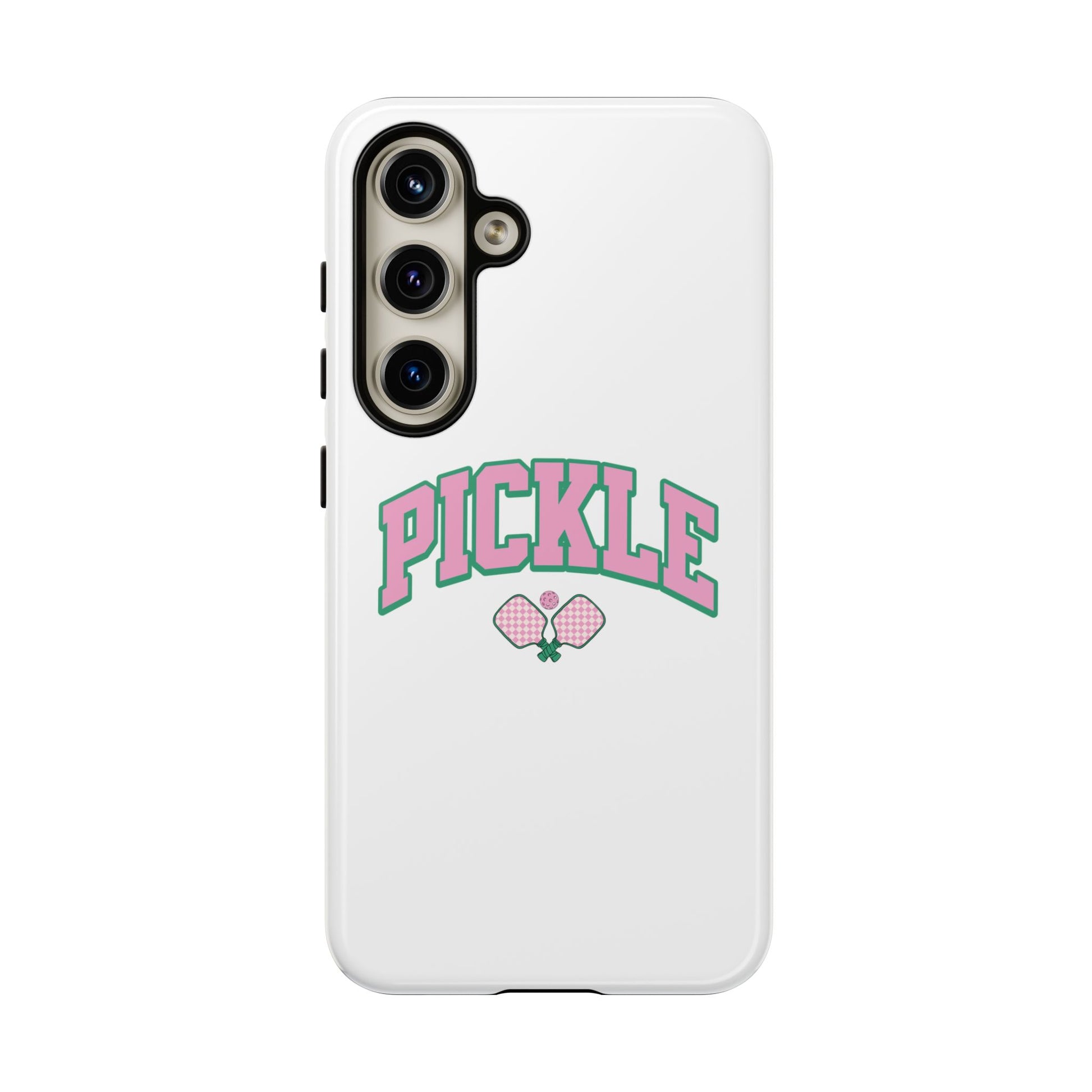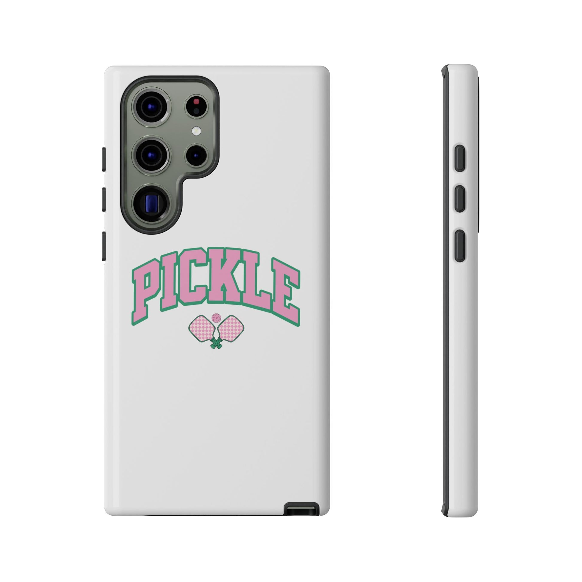 Turn heads on and off the court with the PICKLE phone case, sporting bold pink and green collegiate-style letters with pink check crossed paddles below it.