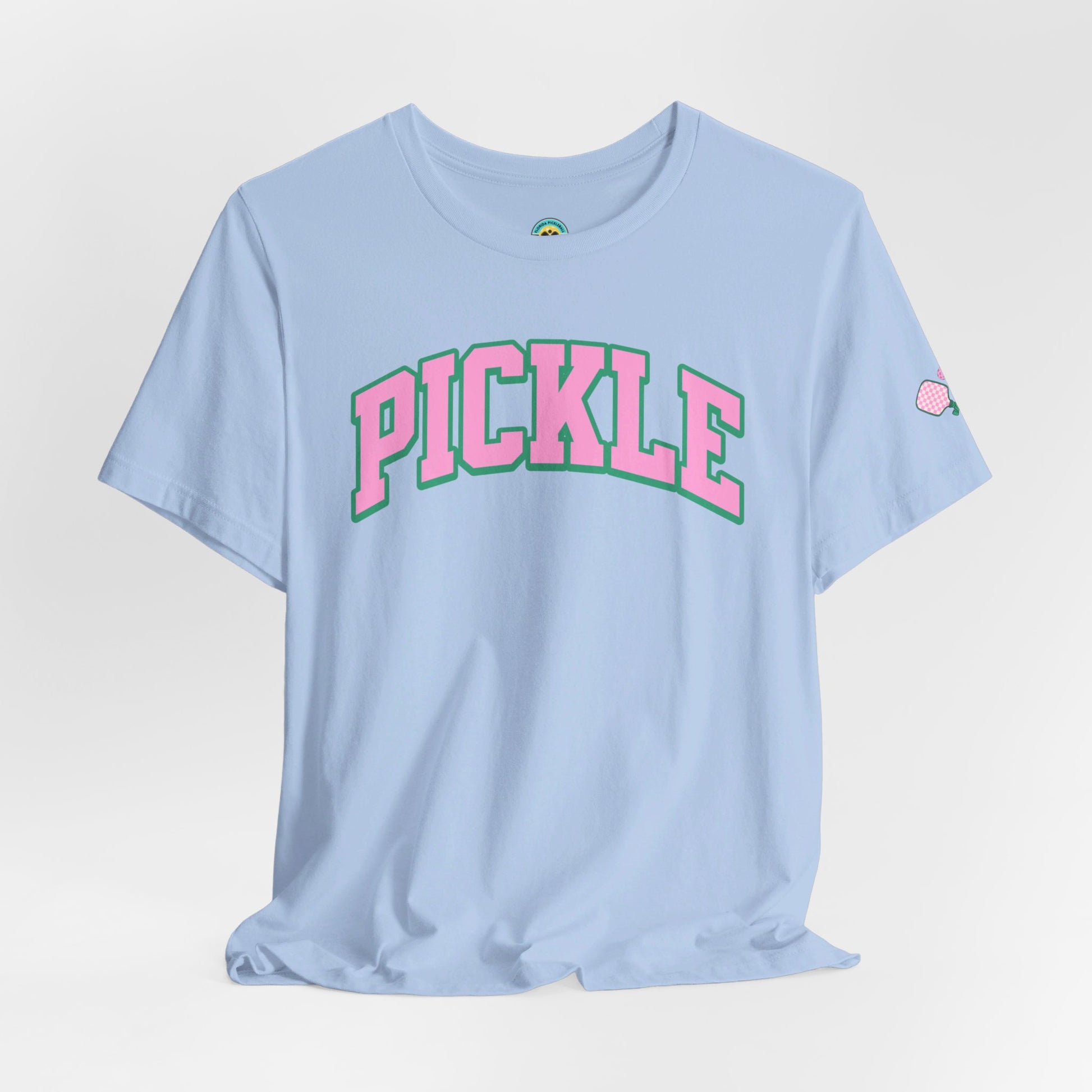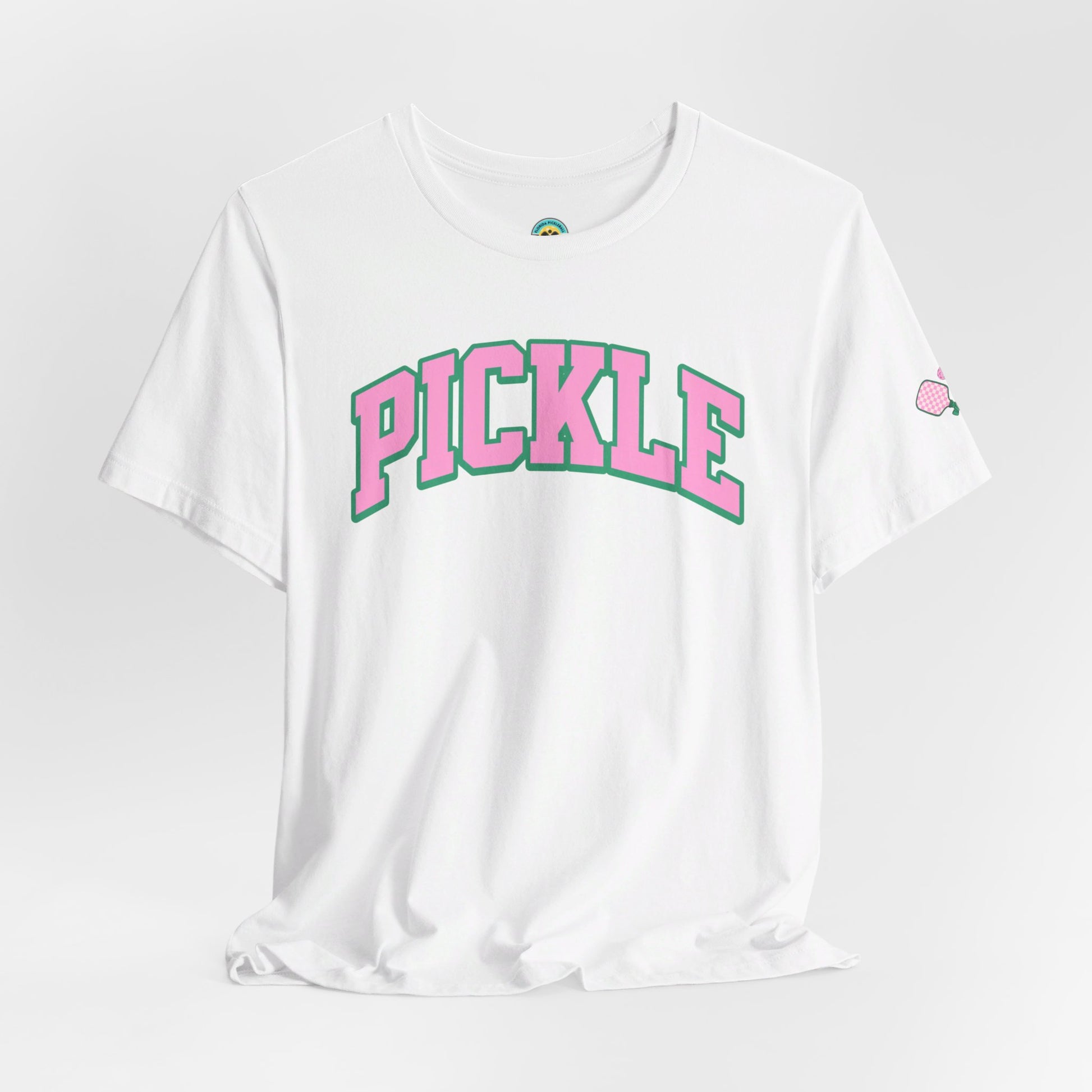 Turn heads on and off the court with the PICKLE tee, sporting bold collegiate-style pink letters with a green outline and checkerboard crossed paddles on the left sleeve. Whether you're dinking, smashing, or just having fun, this 100% cotton tee is perfect for showcasing your love for the game with a stylish, trendy design.