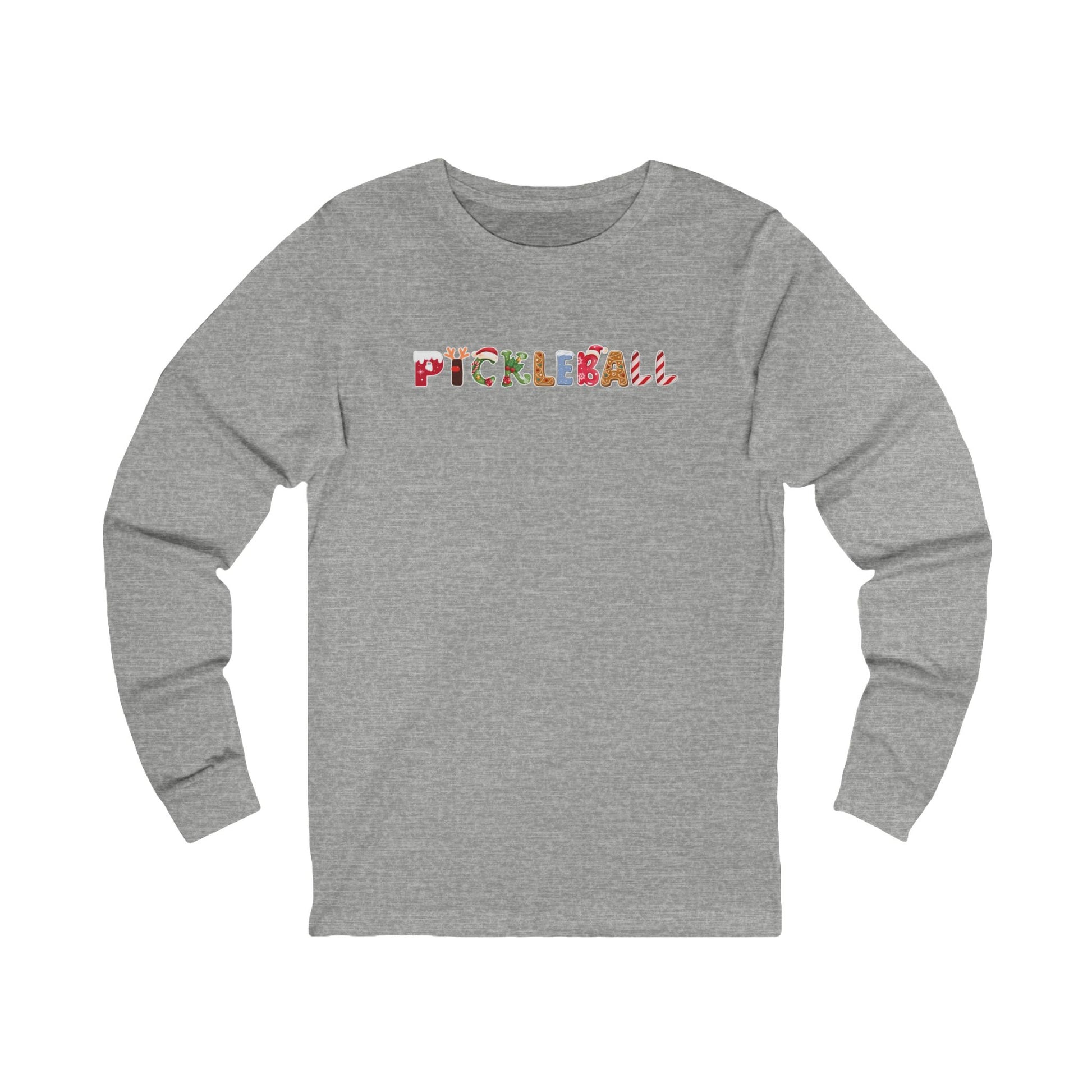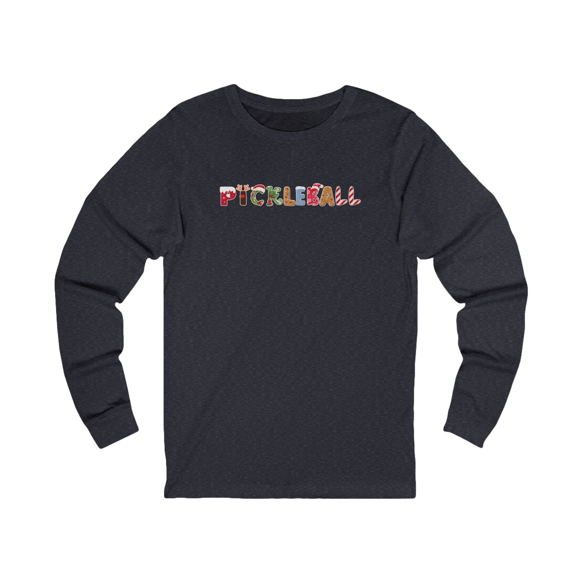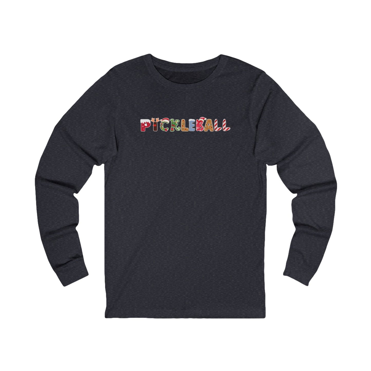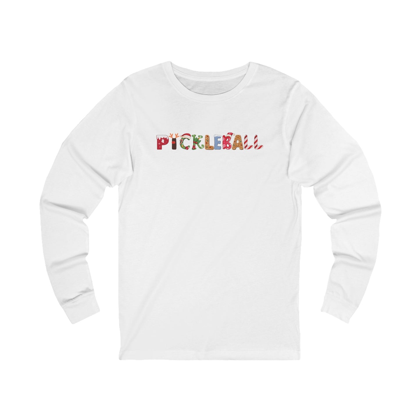 Celebrate the season and pickleball with this fun and festive holiday tee, featuring the word PICKLEBALL spelled out in holiday symbols. Perfect for opening gifts and playing in your holiday tournaments!