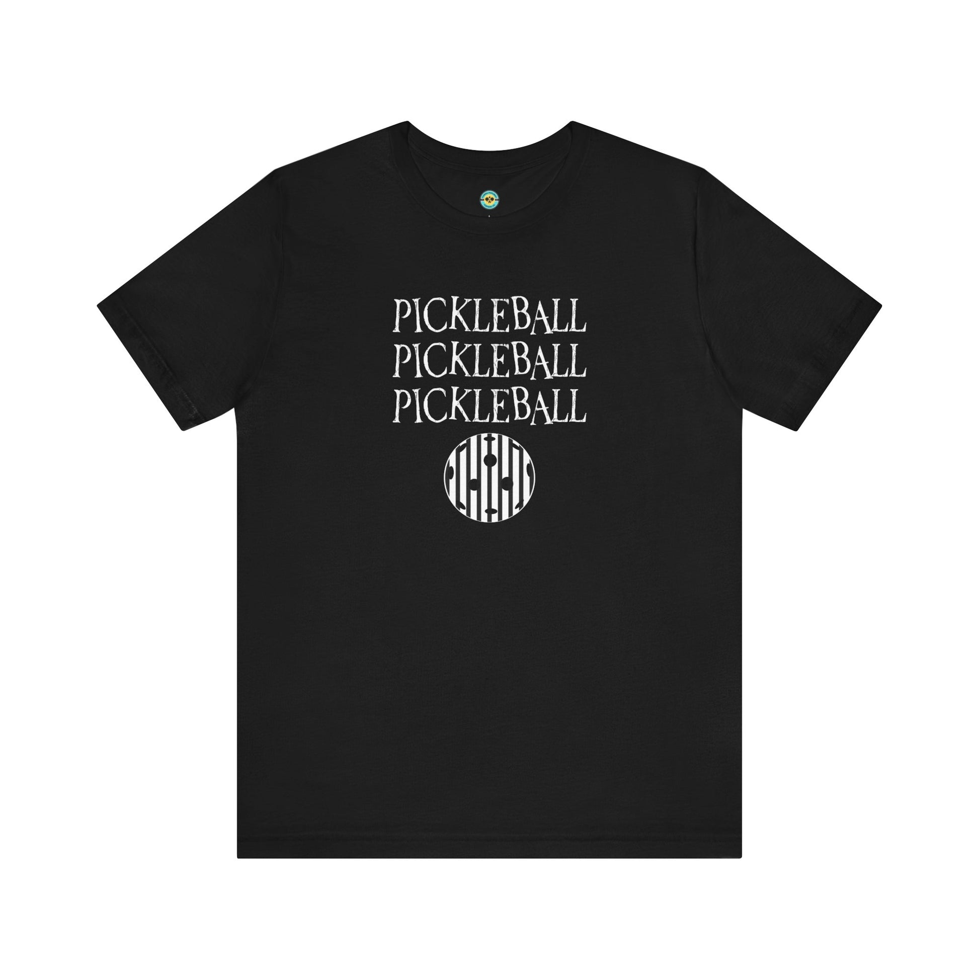 Summon the fun right onto the pickleball court with our Beetlejuice-themed t-shirt, featuring the iconic chant "Pickleball Pickleball Pickleball"! This tee is perfect for players who like to bring a bit of mischief and mayhem to their game.
