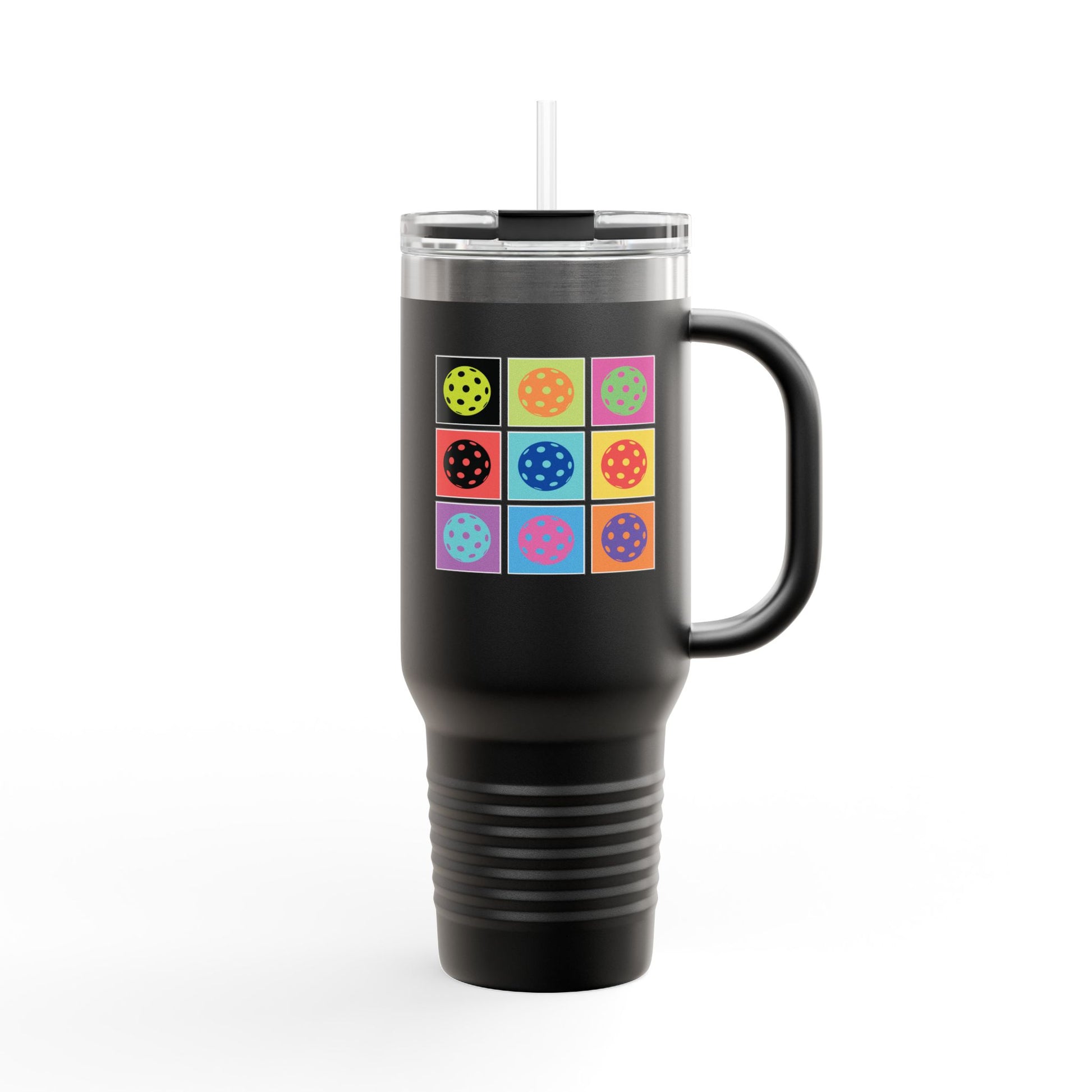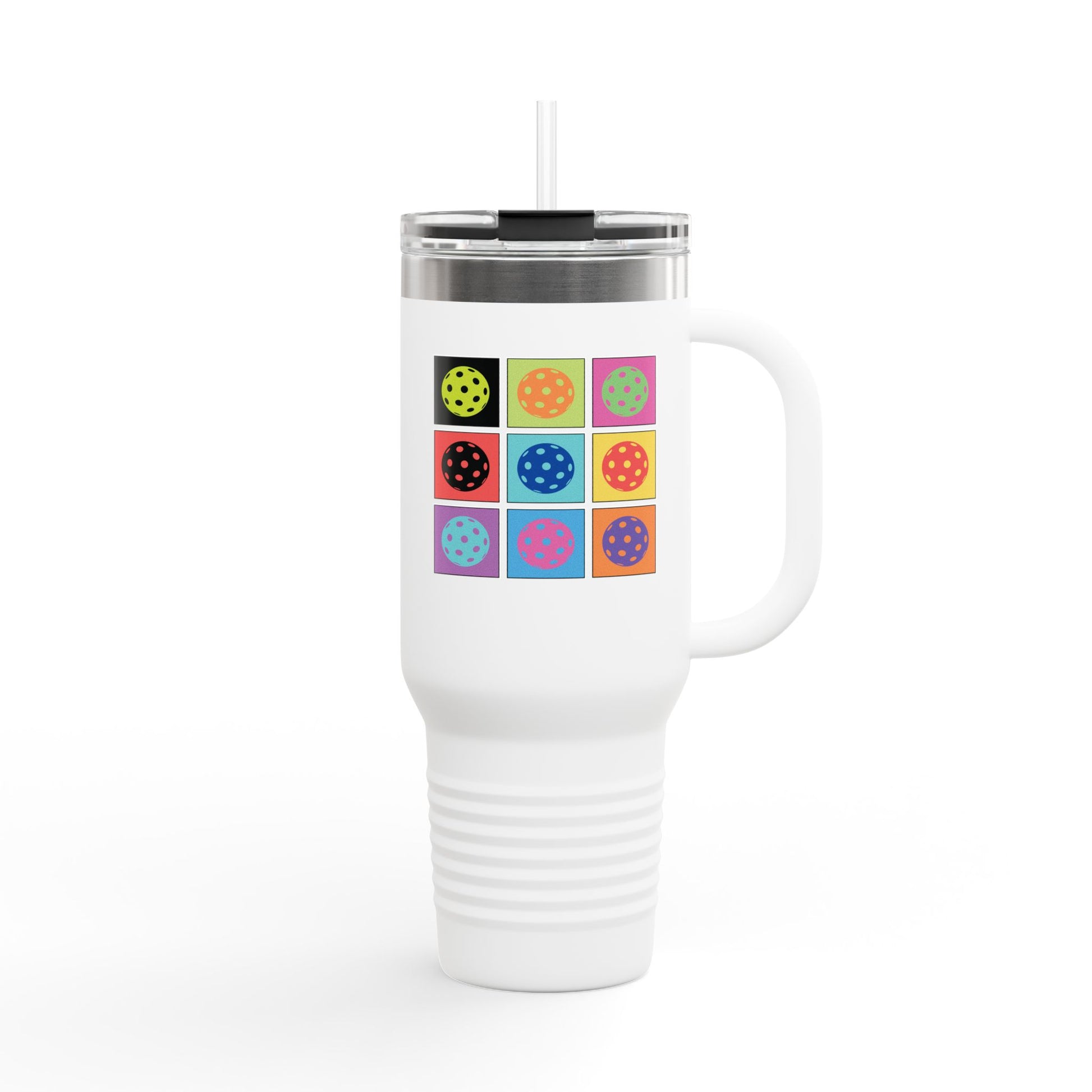 The Pickleball Squares thermal 40oz tumbler with handle features a colorful pattern of pickleballs set in individual squares, creating a clean, modern design. This thermal 40oz tumbler has the same technology as the trending tumbler, plus the handle is solid welded steel AND it's pickleball themed - even better!