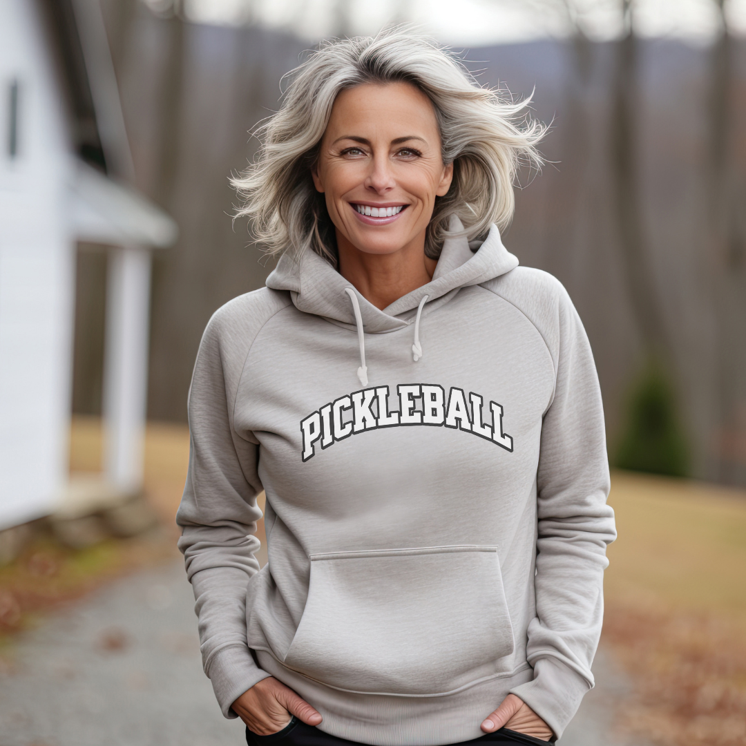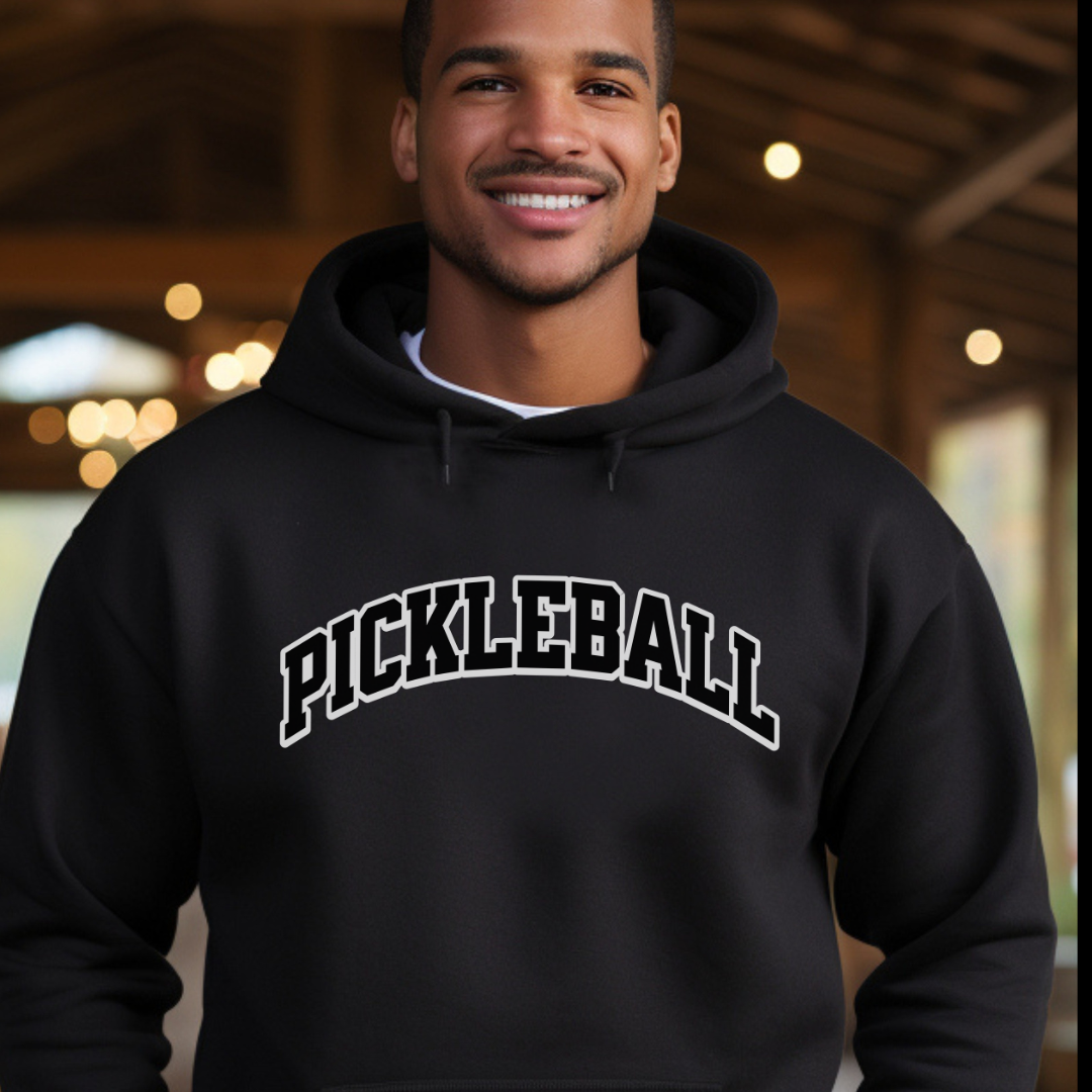 Sport a classic look with the PICKLEBALL hoodie, featuring bold collegiate-style letters. This clean, timeless design is super comfortable, perfect for players who want to showcase their passion for the game, on and off the court.
