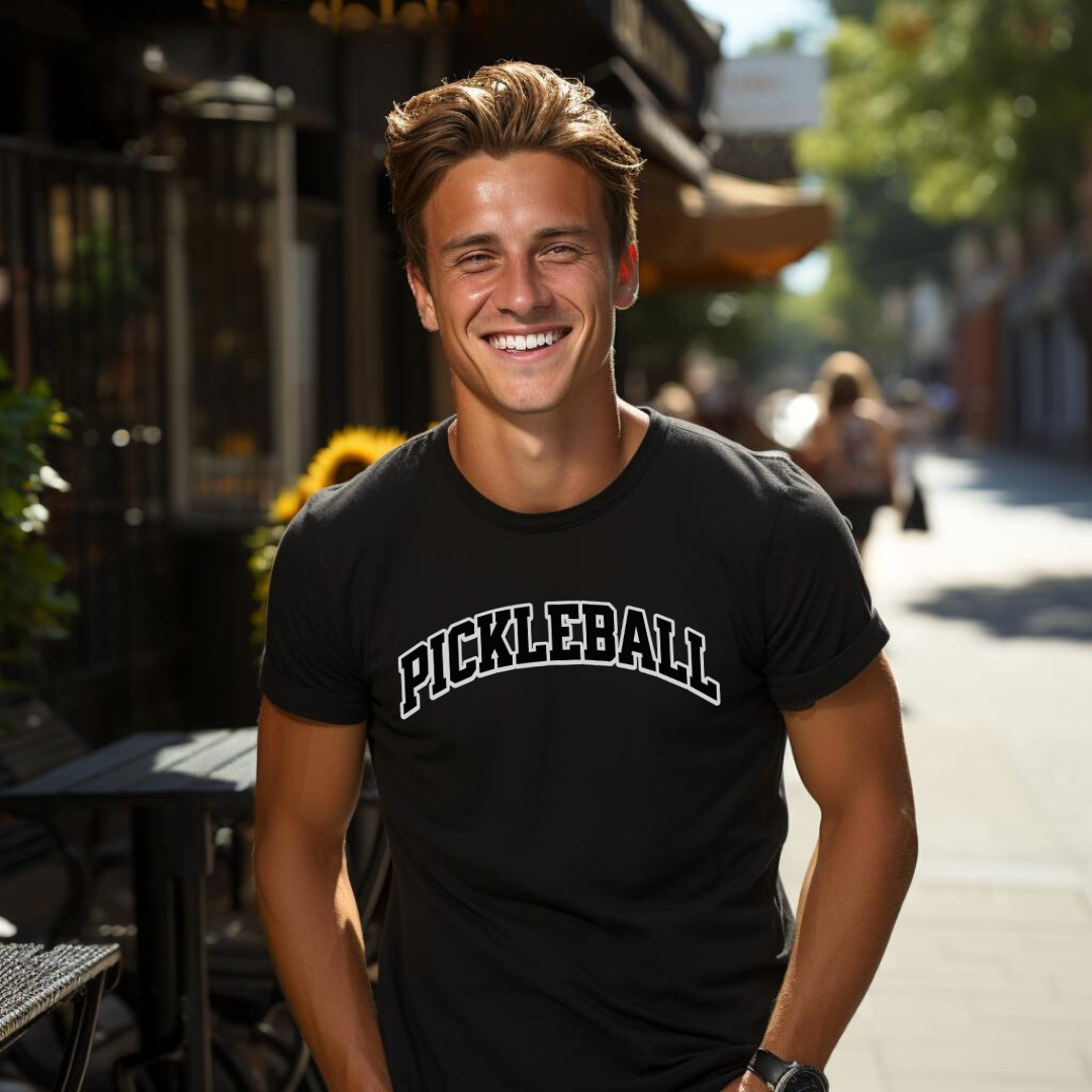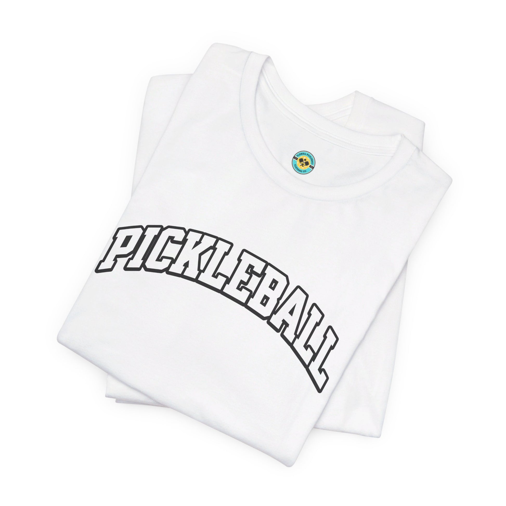 Sport a classic look with the PICKLEBALL tee, featuring bold collegiate-style letters. This clean, timeless design is perfect for players who want to showcase their passion for the game, on and off the court.