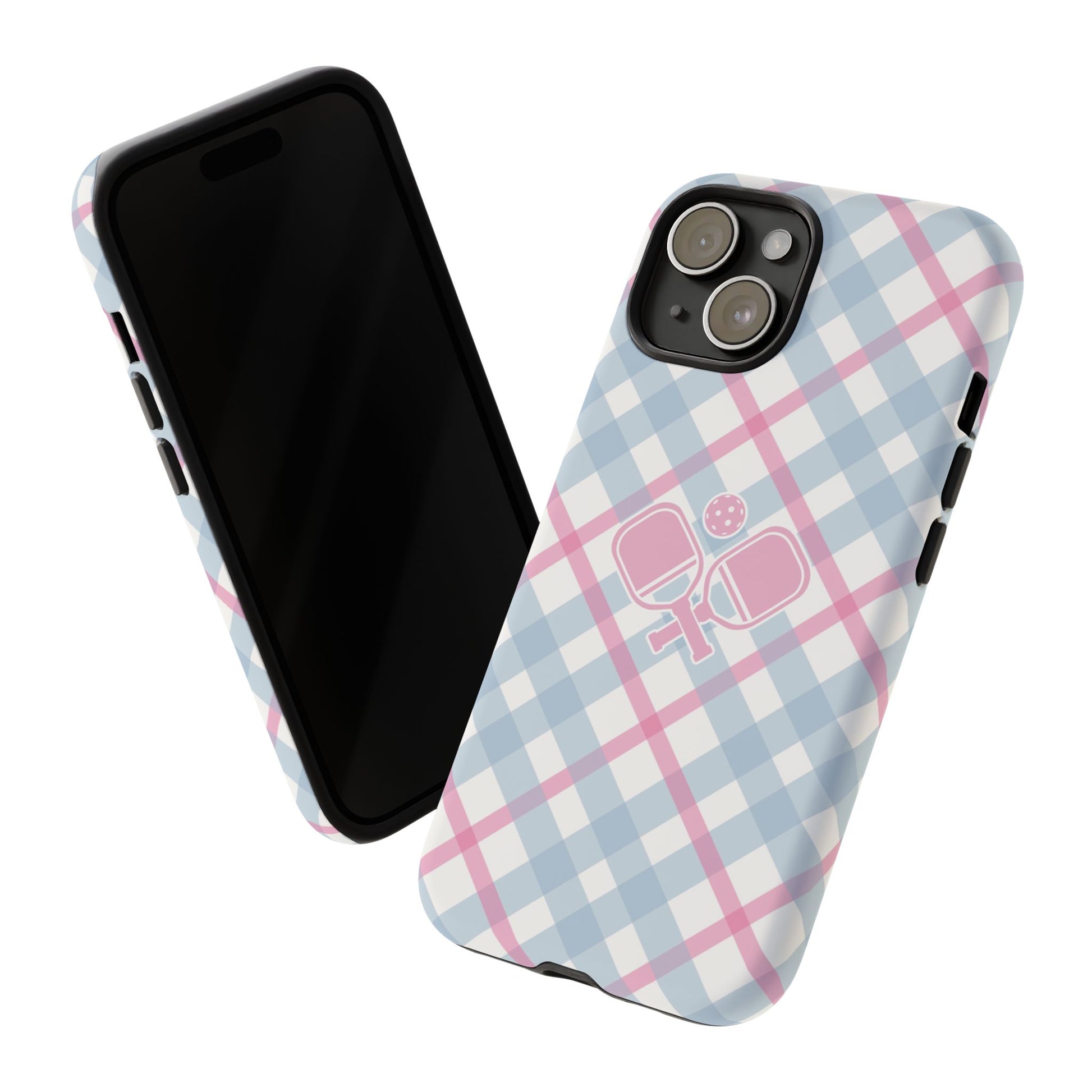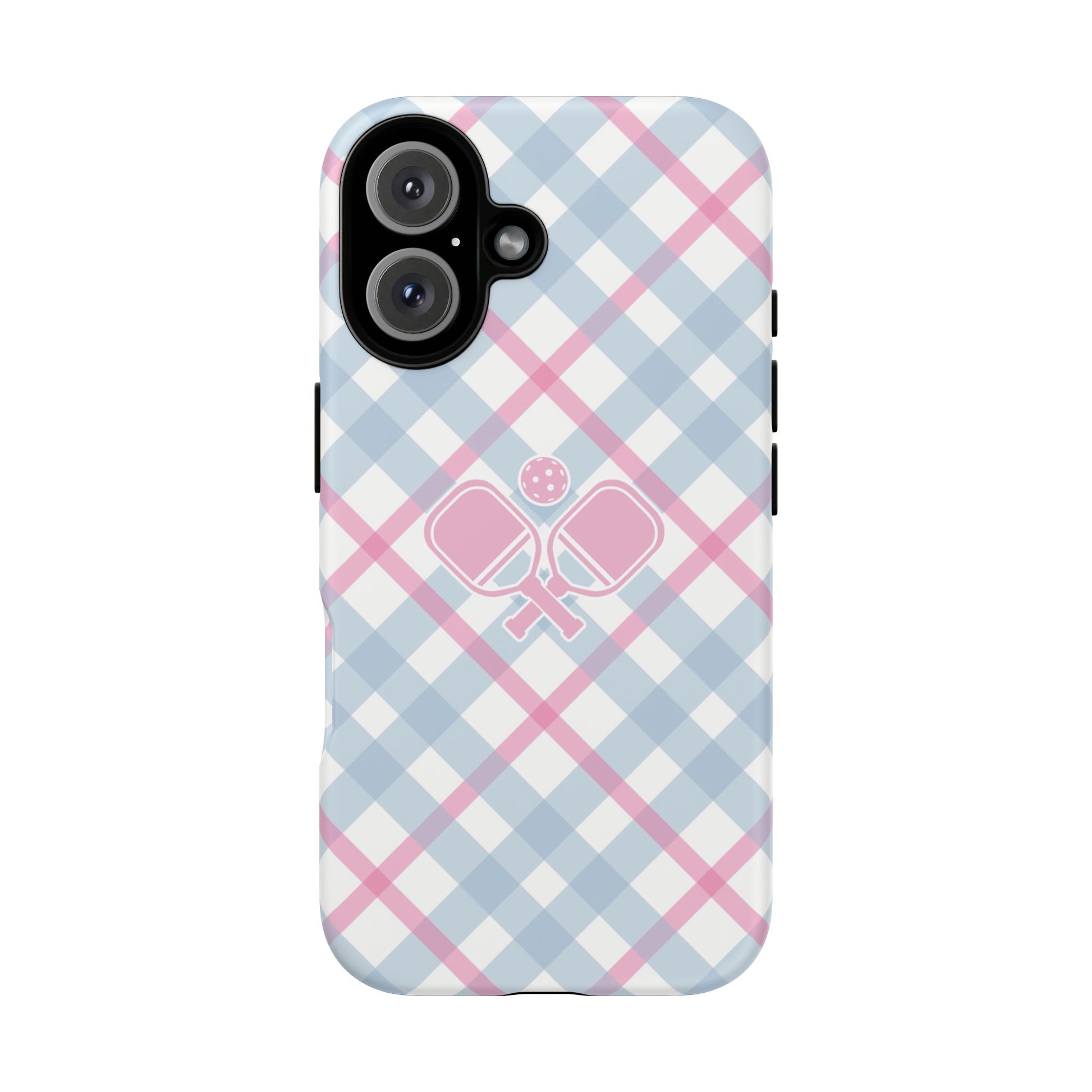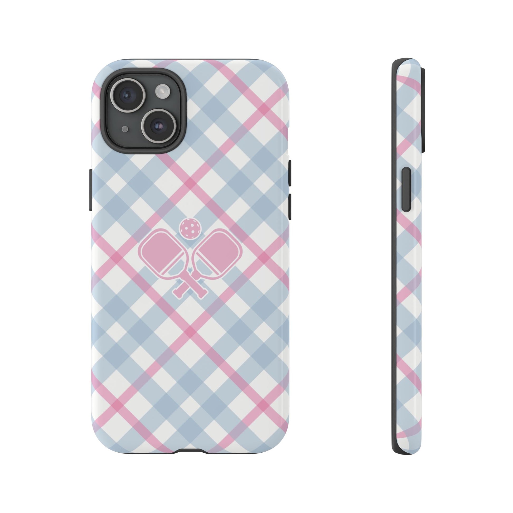 This classic pink and blue plaid cell phone case offers a modern spin on a classic design. Featuring crossed pink pickleball paddles at the center, this design beautifully combines traditional patterns with a fresh, playful twist.