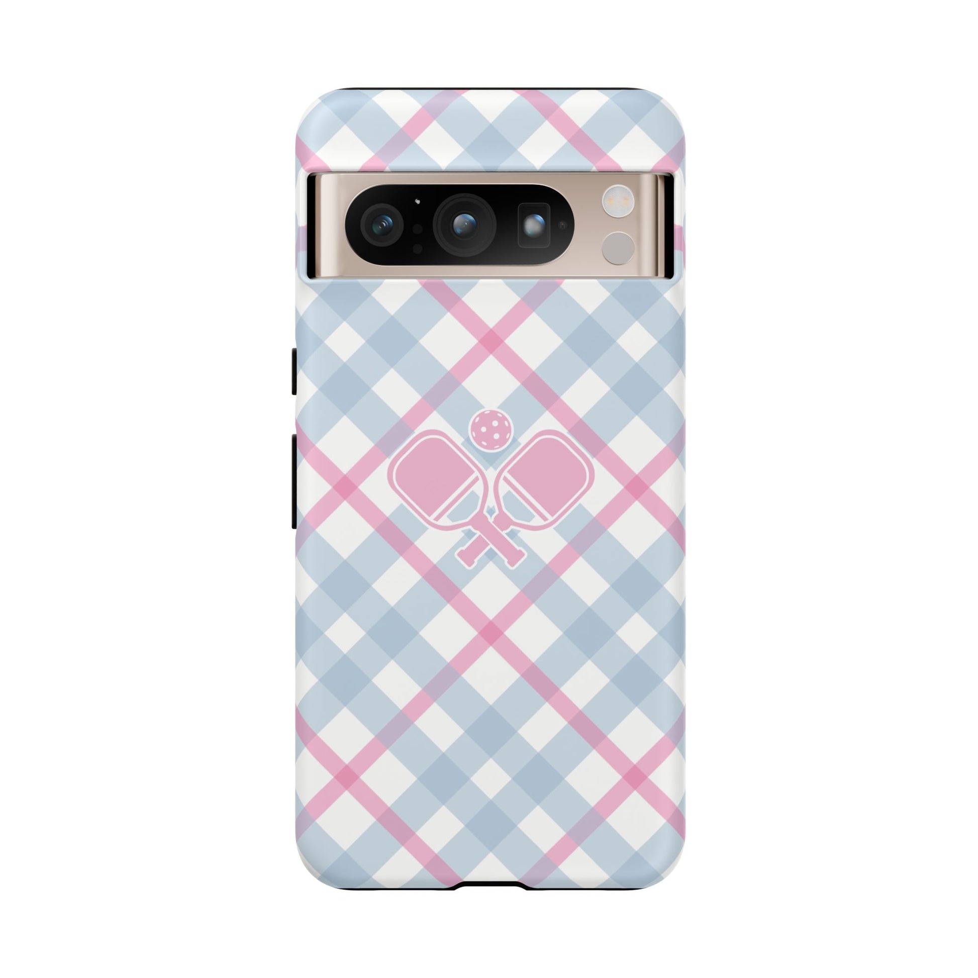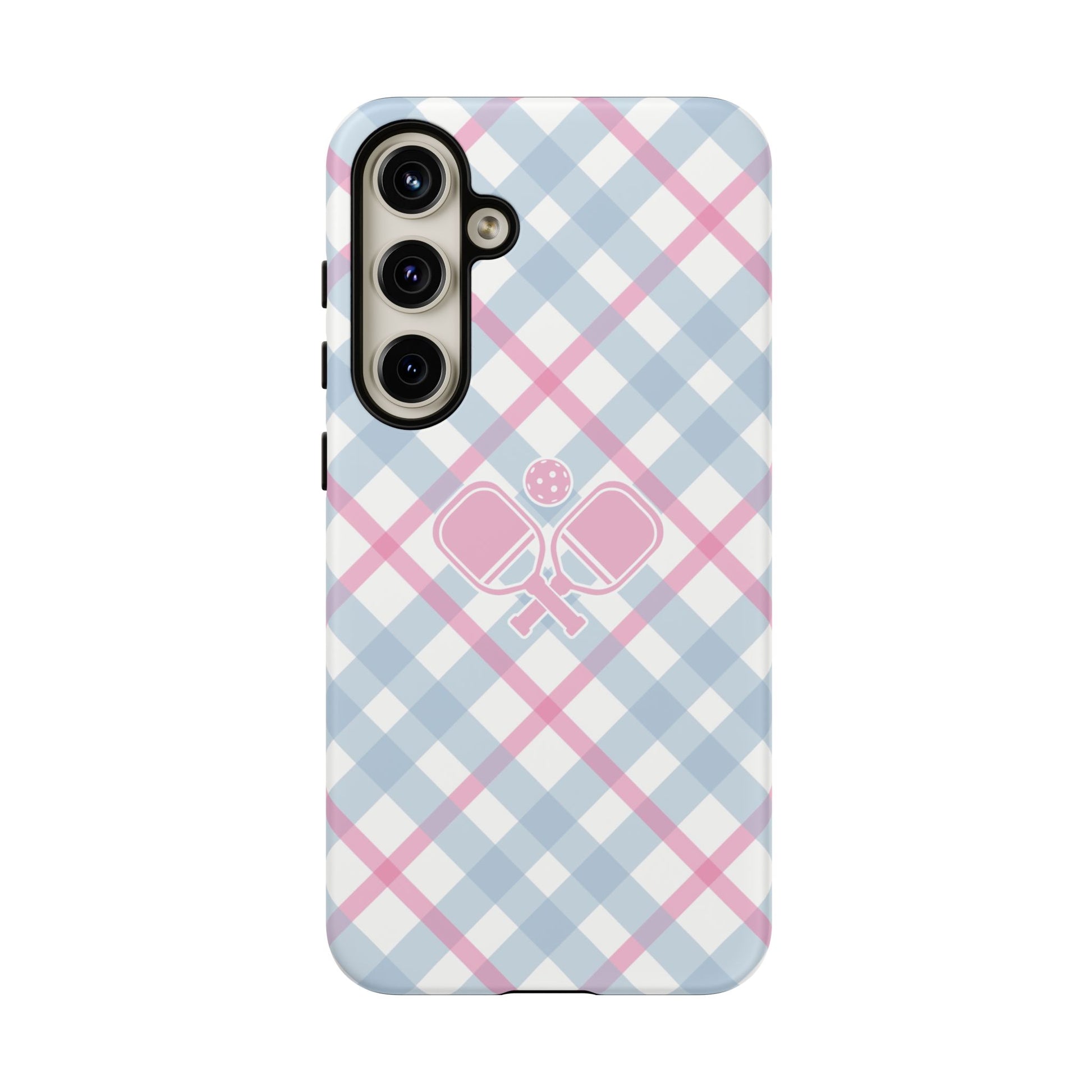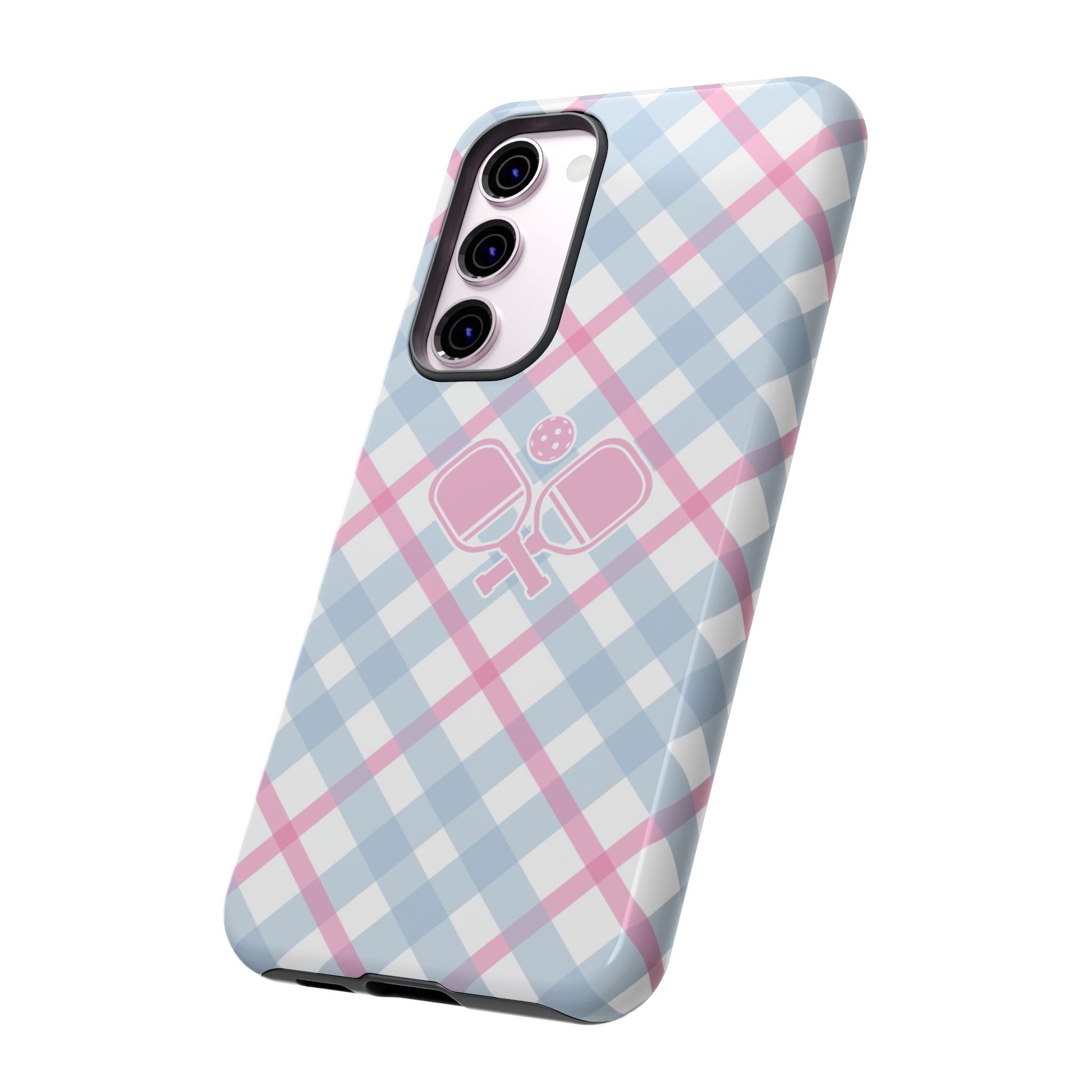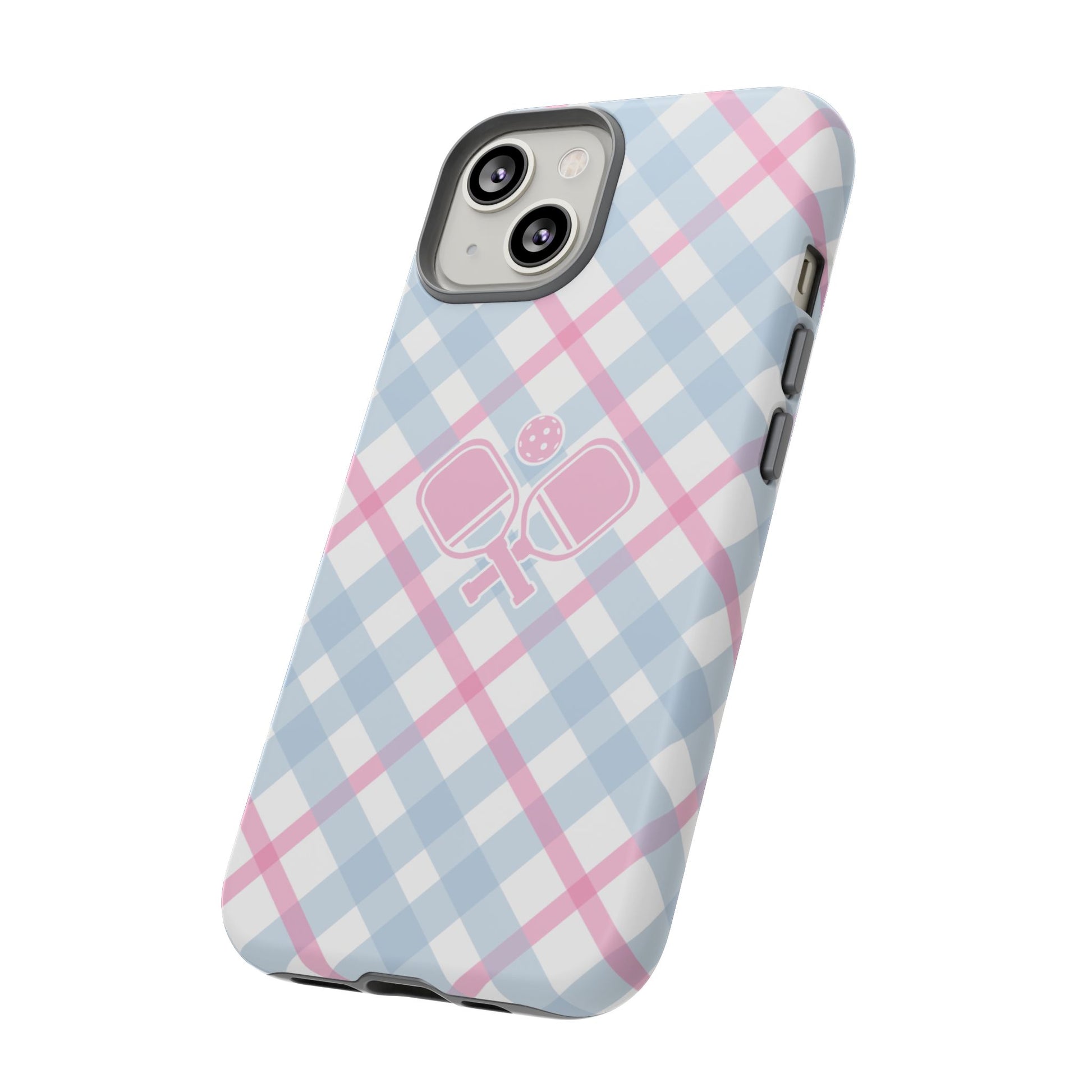 This classic pink and blue plaid cell phone case offers a modern spin on a classic design. Featuring crossed pink pickleball paddles at the center, this design beautifully combines traditional patterns with a fresh, playful twist.
