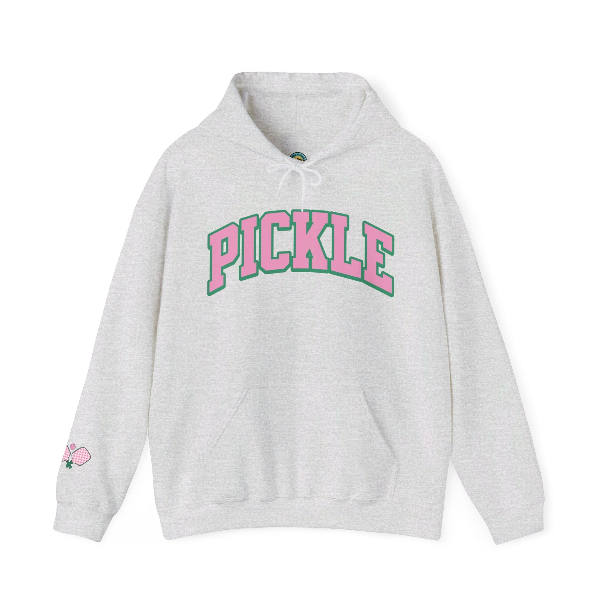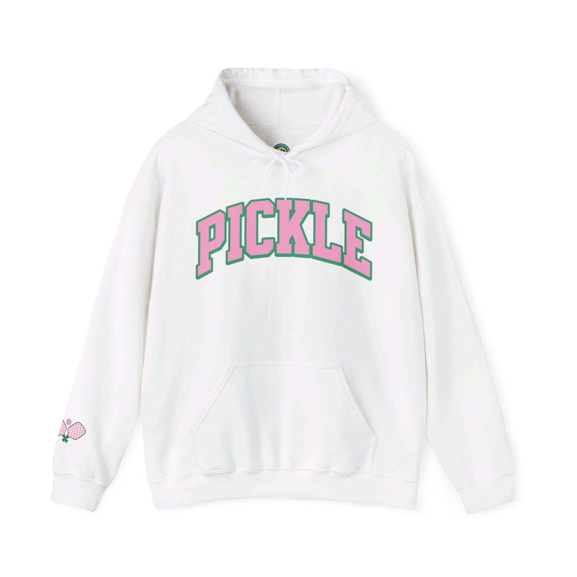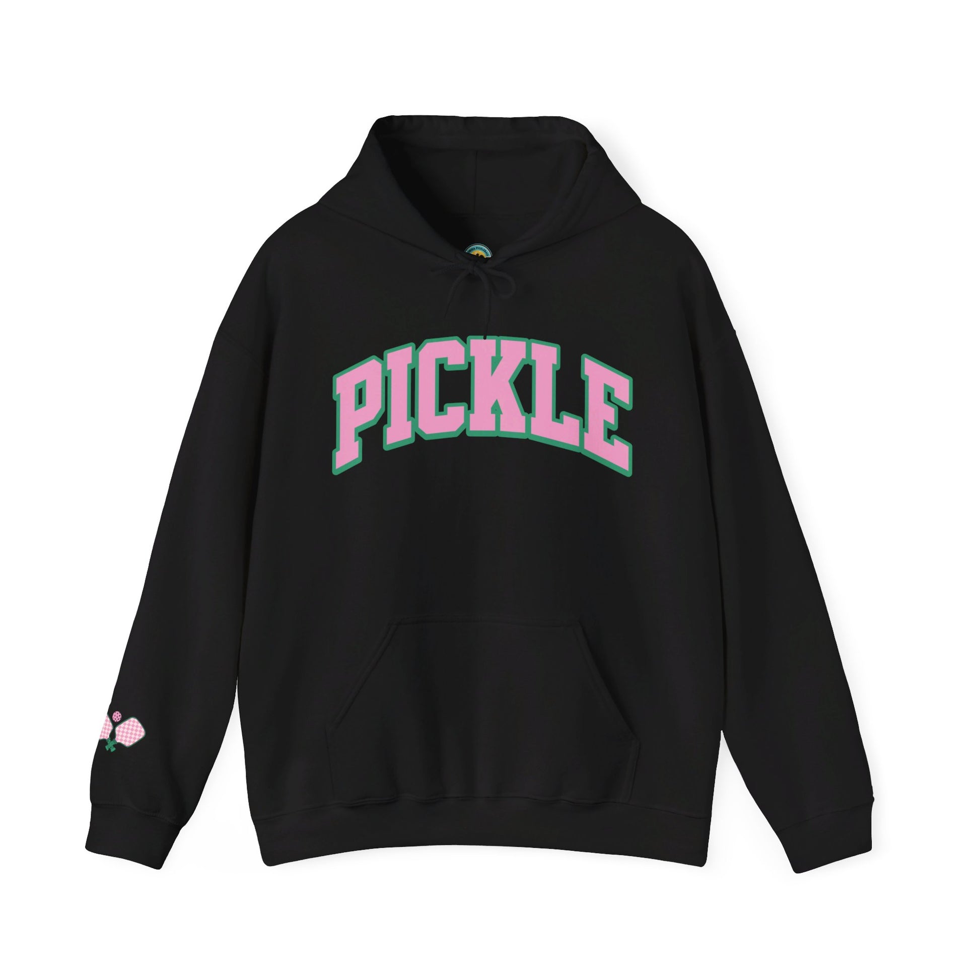 Turn heads on and off the court with the PICKLE hoodie, sporting bold collegiate-style pink letters with a green outline and checkerboard crossed paddles on the bottom right sleeve. Whether you're dinking, smashing, or just having fun, this comfy hoodie is perfect for showcasing your love for the game with a stylish, trendy design.