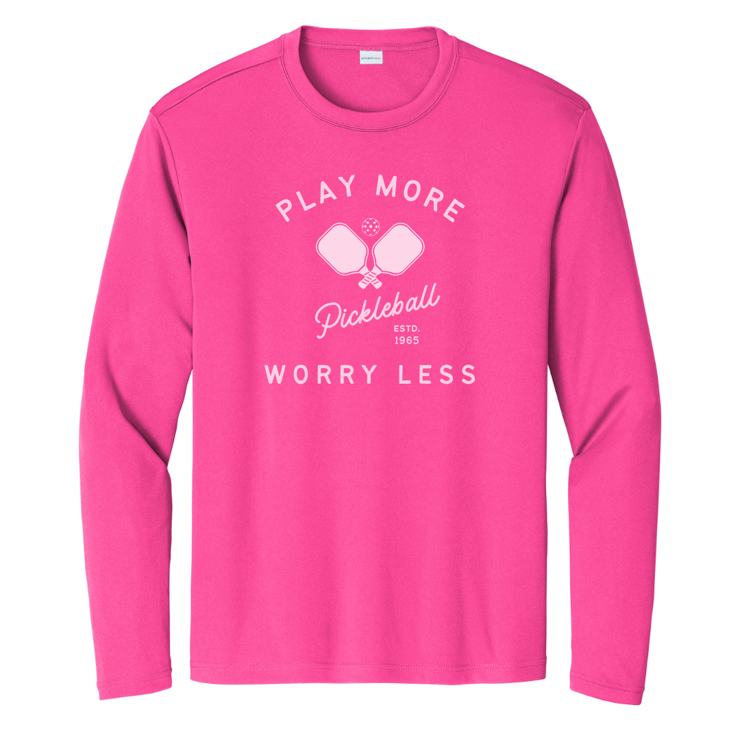 Keep it cool with our "Play More Worry Less" long sleeve pickleball performance tee. This shirt is all about chilling out and enjoying the game. It’s perfect for anyone looking to hit the courts, have some fun, and leave all your daily worries behind.