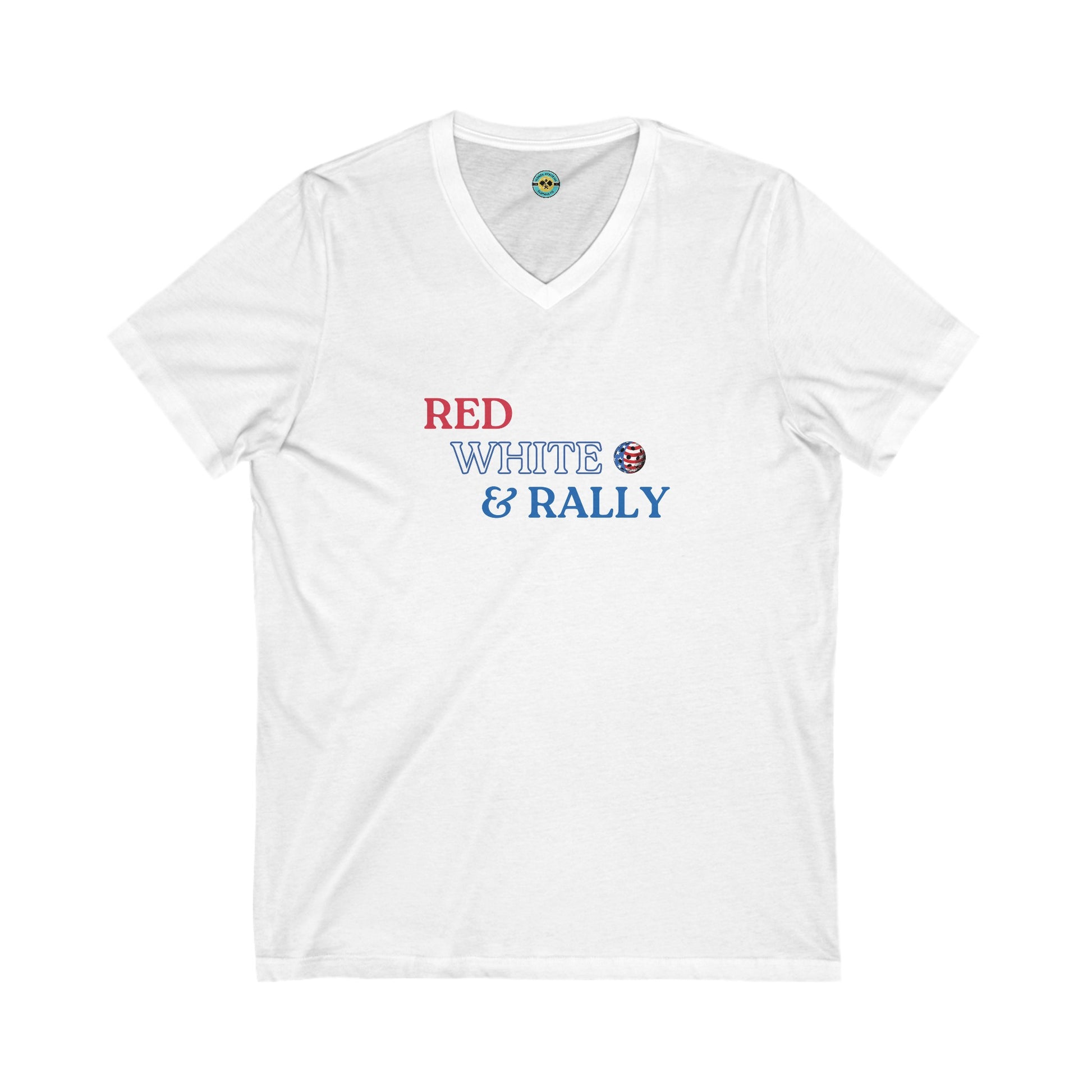 Bring some patriotic flair to the court with our "Red White & Rally" v-neck pickleball tee, perfect for pickleball players ready to serve up some fun. Whether you're smashing or dinking, show your love for the game and your country in style and comfort.