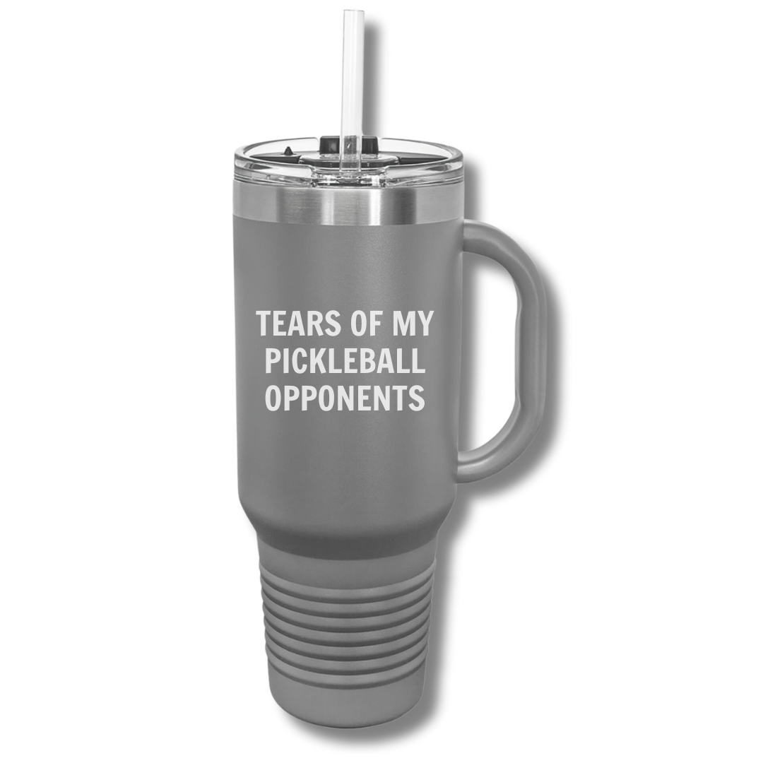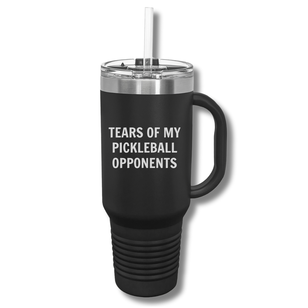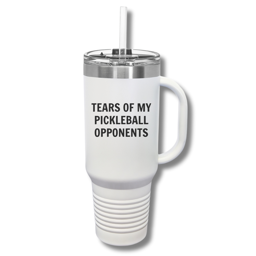 The Tears of My Pickleball Opponents thermal 40oz. tumbler with handle is the perfect way to celebrate your wins on the court. Use it as a daily reminder of every time you've beaten your rivals and savor each sweet victory, one sip at a time. This thermal 40oz. tumbler has the same technology as the trending tumbler, plus the handle is solid welded steel AND it's pickleball themed - even better!